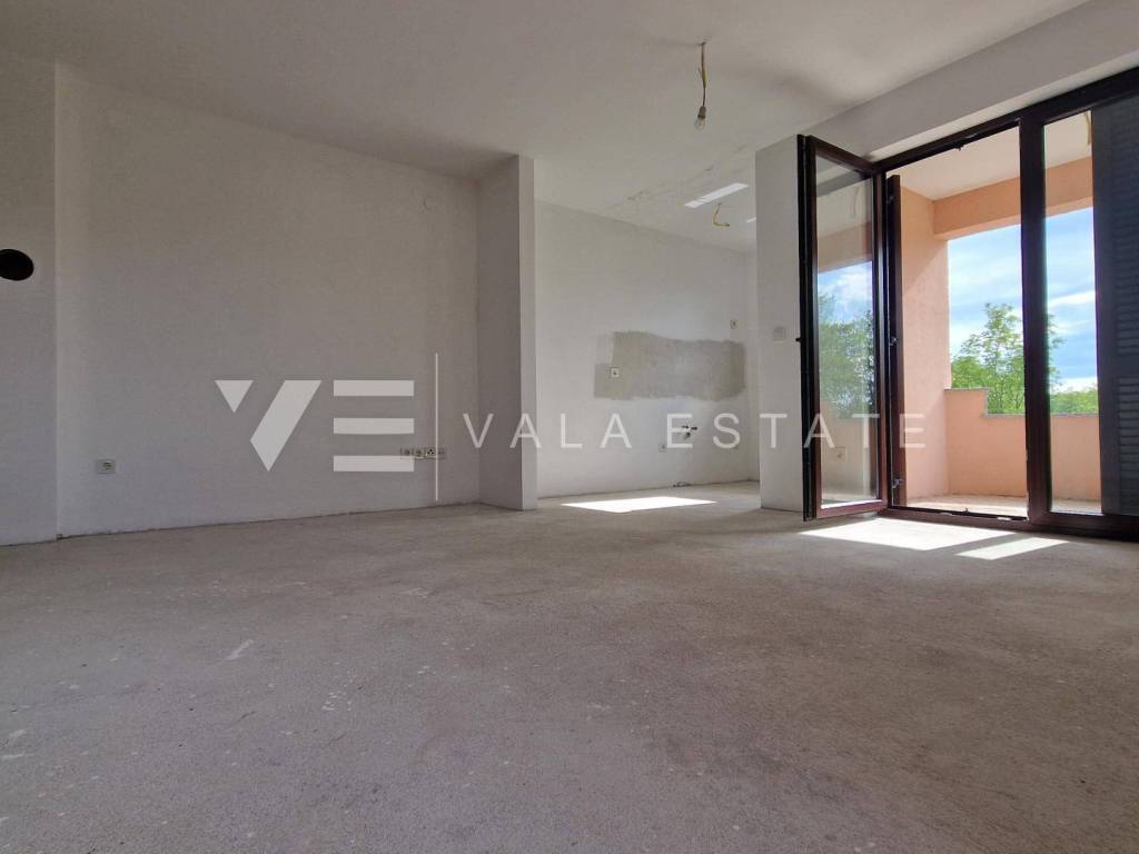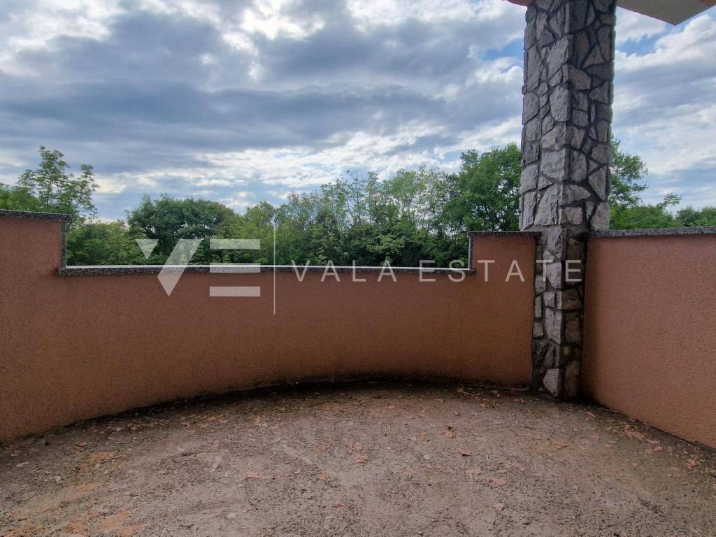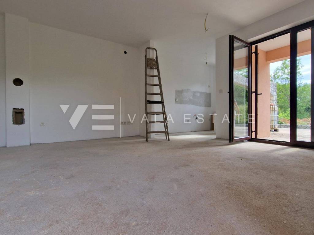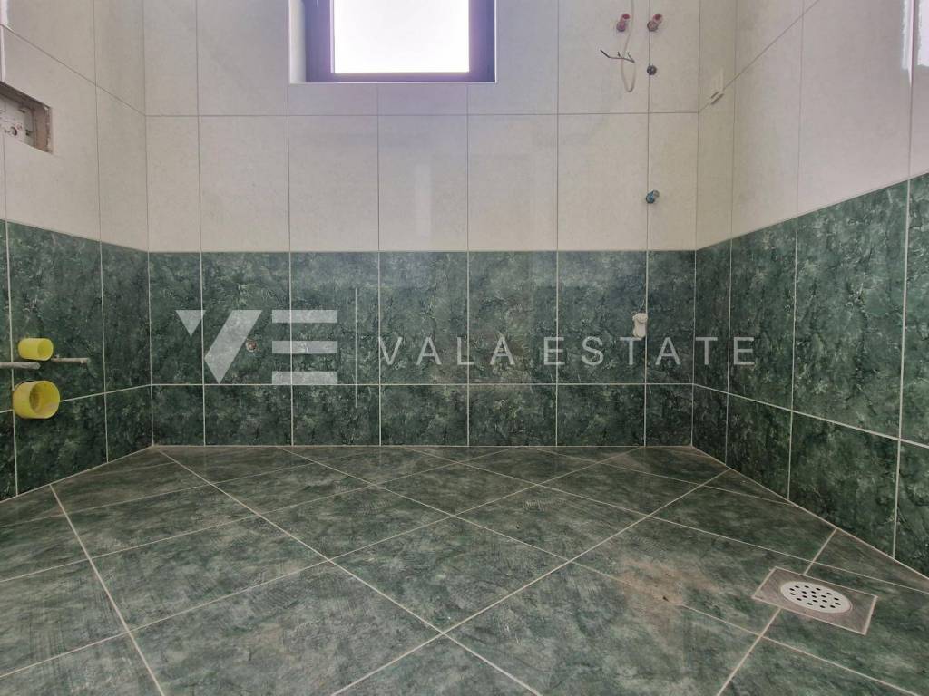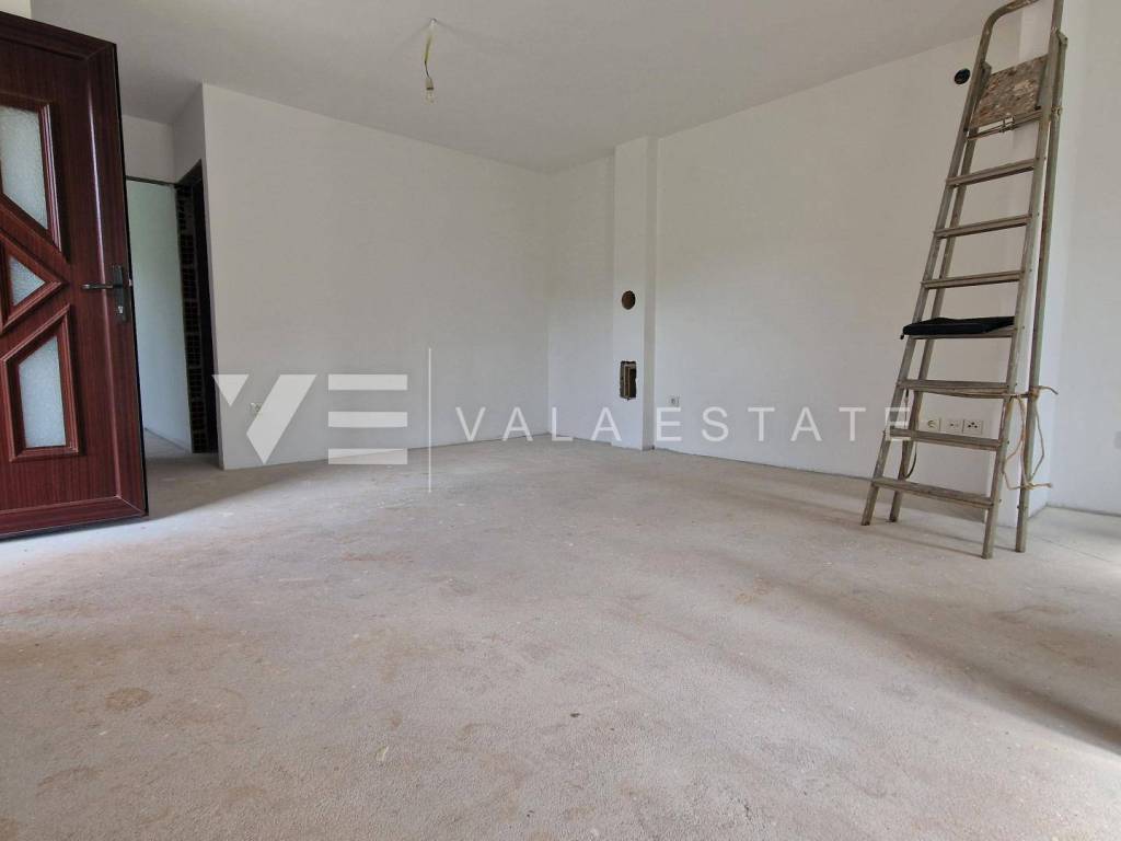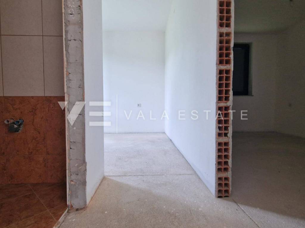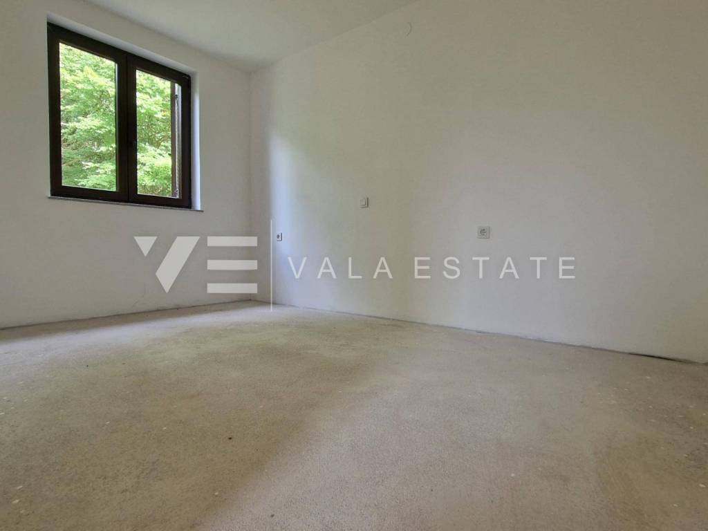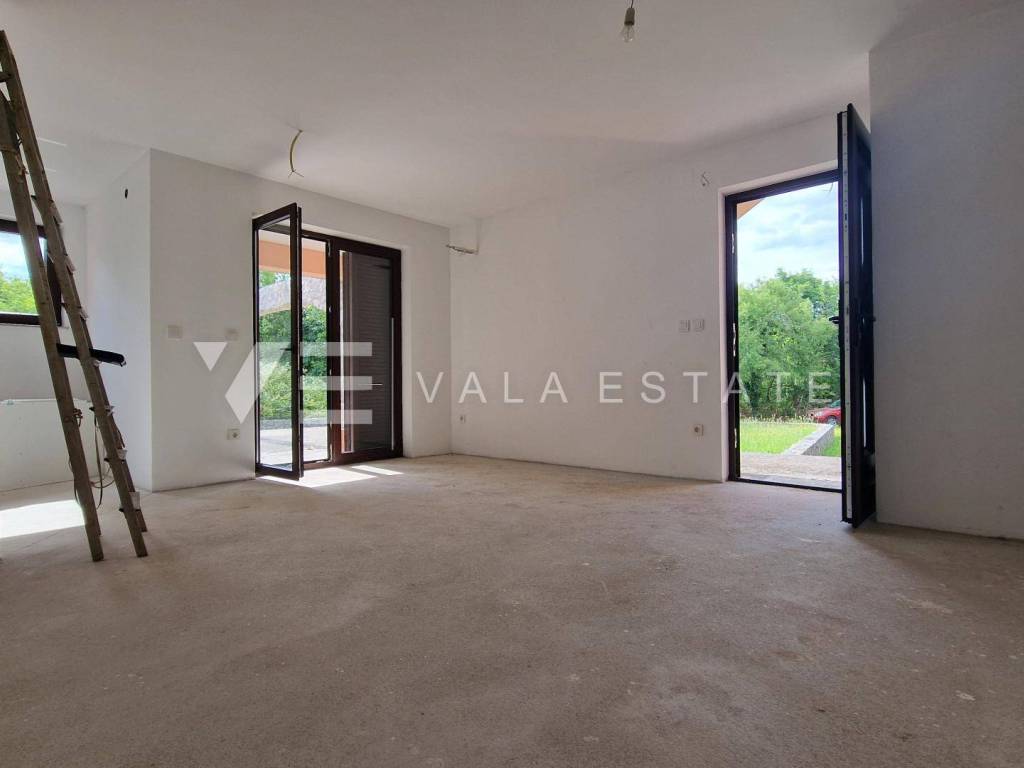Real estate island Krk, Dobrinj surroundings - for sale is a semi-detached house with two separate residential units with a total living area of 112.98 m2. The floors are separated by entrances and meters and have a similar layout and square footage. On the ground floor there is a two-room apartment consisting of an entrance hall, a bathroom, two bedrooms, a living room, a kitchen with a dining room and a living room with access to a covered terrace and garden. An external staircase leads to the first floor, which includes an entrance hall, bathroom, two bedrooms, kitchen, dining room, living room with access to a covered balcony and space in the attic. It has a garden of 272 m2 and two parking spaces. The house was built in 2020 and needs to be completed. The location is beautiful and peaceful, surrounded by greenery and forest, 4000 m from the beaches and 700 m from the center. It is ideal for lovers of nature, peace and quiet.