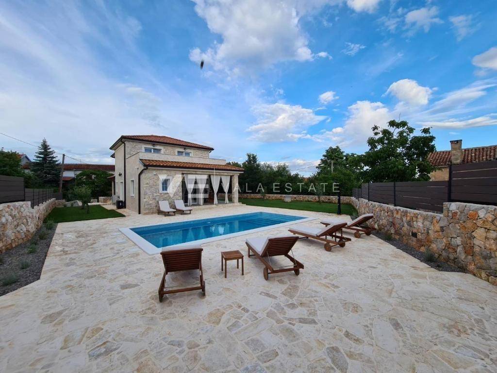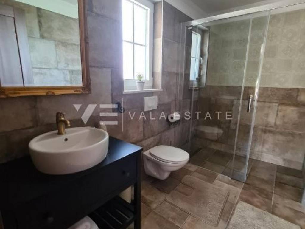 Real estate island of Krk, Dobrinj area - stone detached villa of 160 m2 for sale on the ground floor and first floor. The ground floor includes an entrance hall, a toilet, a bedroom with its own bathroom, a kitchen with a dining room and a spacious living room with access to a covered terrace. Upstairs there are three bedrooms, each with its own bathroom, two of which have access to a large terrace and one has a French balcony. The villa is air-conditioned and fully equipped and decorated with quality furniture. On the beautifully landscaped and fenced garden, which provides privacy, there is a swimming pool with a sunbathing area, a barbecue, a children's playground and space for several parking spaces. A beautiful, quiet location on the edge of the green zone for all lovers of peaceful vacation, but also a good opportunity for investment for tourist rental purposes. The distance from the sea and all amenities is about 3500 meters.