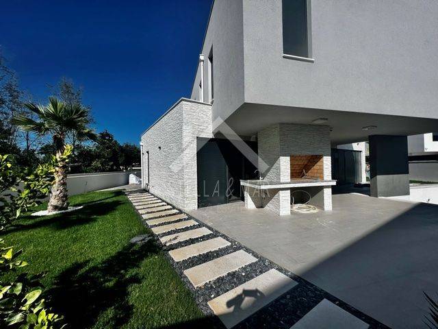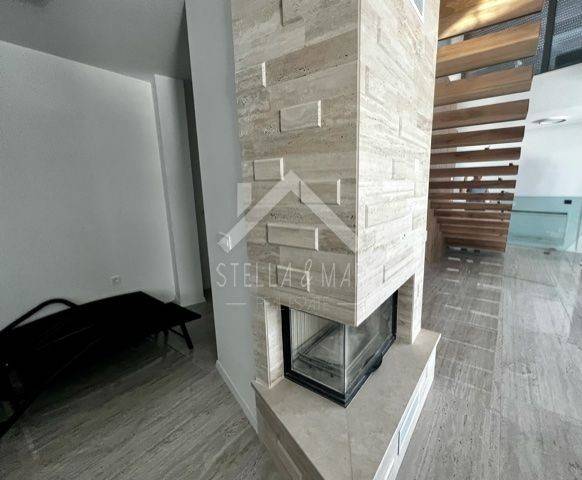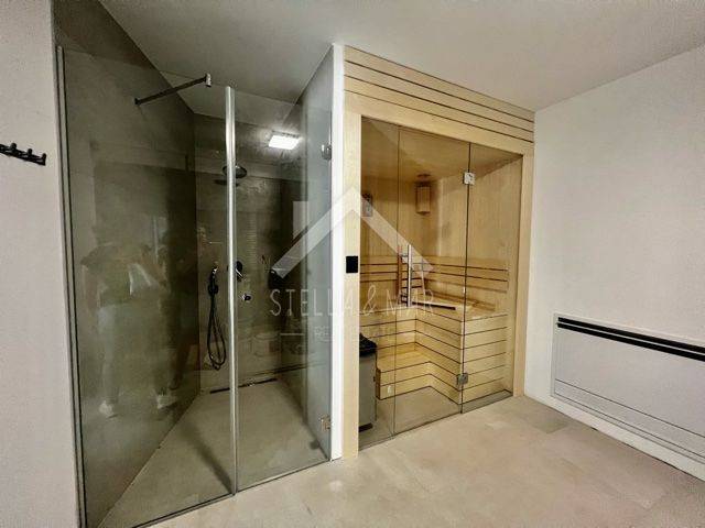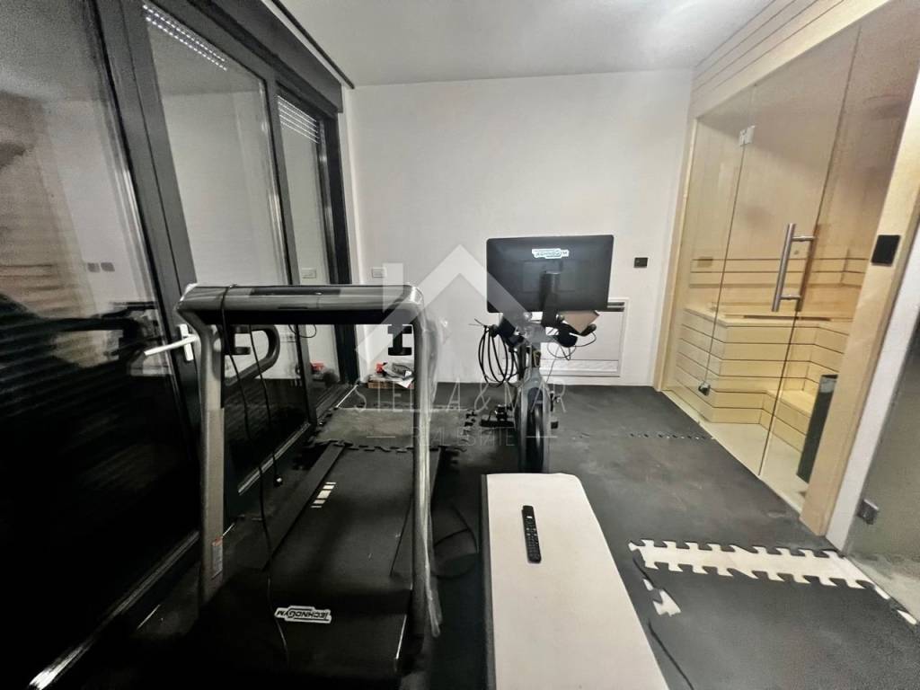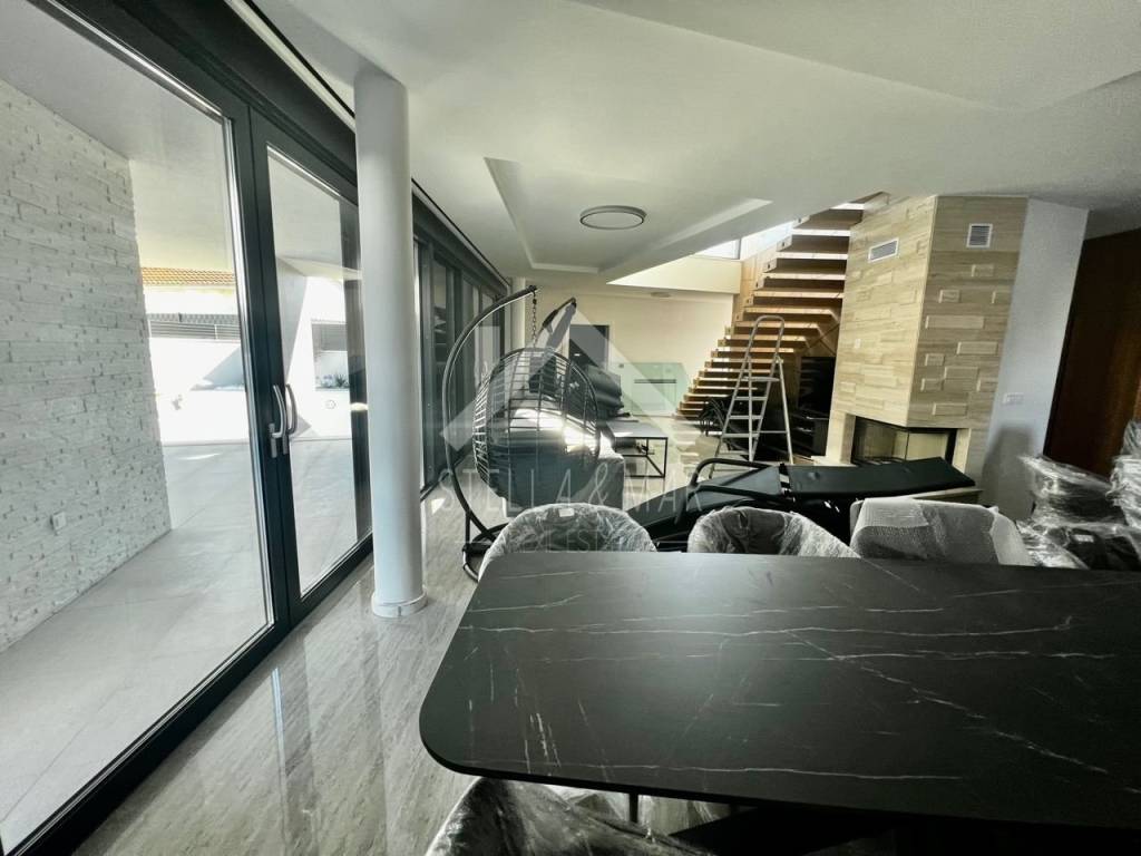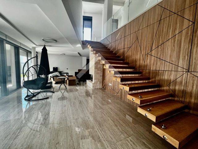The ground floor consists of an entrance, living room, kitchen and dining room with access to a spacious covered terrace and yard. Furthermore, on the ground floor there is also a laundry room, a storage room, a toilet, a gym and a sauna. An internal staircase leads to the first floor of the house where there are four bedrooms, each with its own bathroom and exit to the terrace, and a gallery. The entire house is air-conditioned and has underfloor heating.