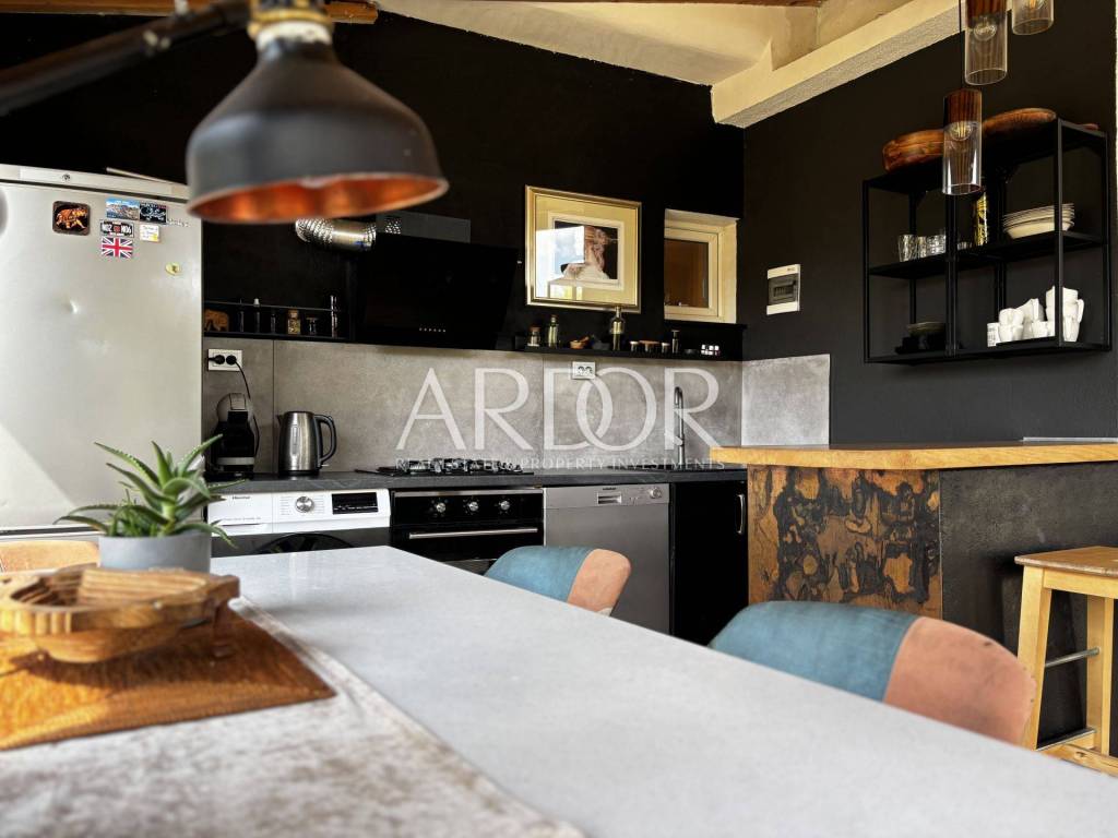 For long-term rent, a unique house in Podhum is offered, with a surface area of 80 m, designed according to minimalist principles and enriched with natural materials. The spacious interior includes two bedrooms, a bathroom, and a kitchen connected to a bright and airy living room. A sliding glass wall opens the space toward the terrace and a landscaped garden planted with bamboo, olives, figs, and cornelian cherries, offering a view of the peaceful green surroundings. The charm of the home is enhanced by mostly handcrafted furniture, while additional practicality is provided by a garage and an outdoor parking space. An excellent opportunity for idyllic living, just a ten-minute drive from the city bustle.