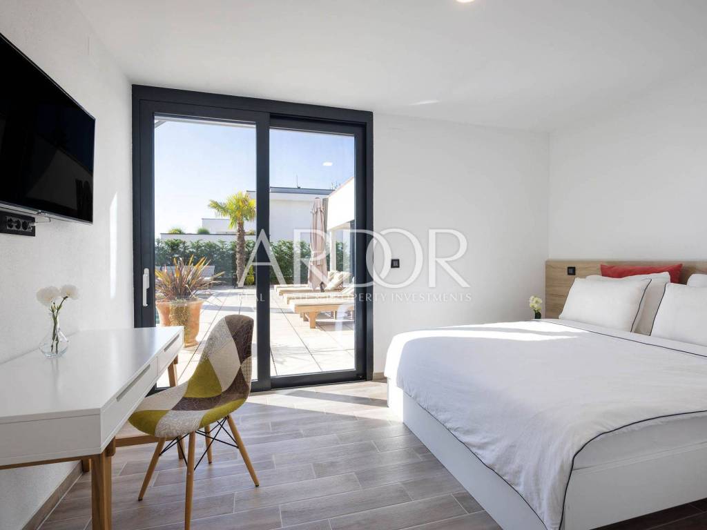 The outdoor area is a true oasis with a 66 m heated infinity pool with a waterfall, surrounded by Mediterranean plants and a sunbathing area, while the garden terrace with a spacious dining room, summer kitchen and barbecue allows you to enjoy the Mediterranean lifestyle.