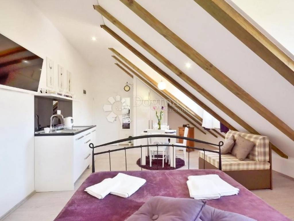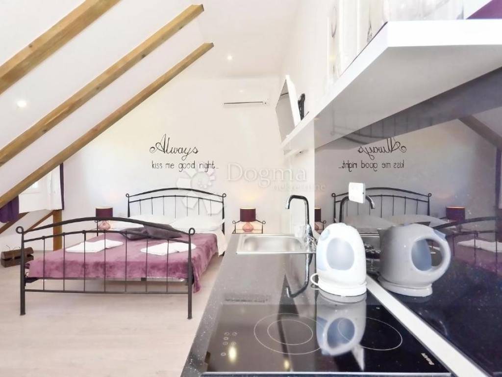 The apartment was completely renovated in 2014 including a new roof, new beams, and a fully refurbished interior. The space has been functionally divided into two separate studio apartments, each with its own kitchen, bathroom, and sleeping area.