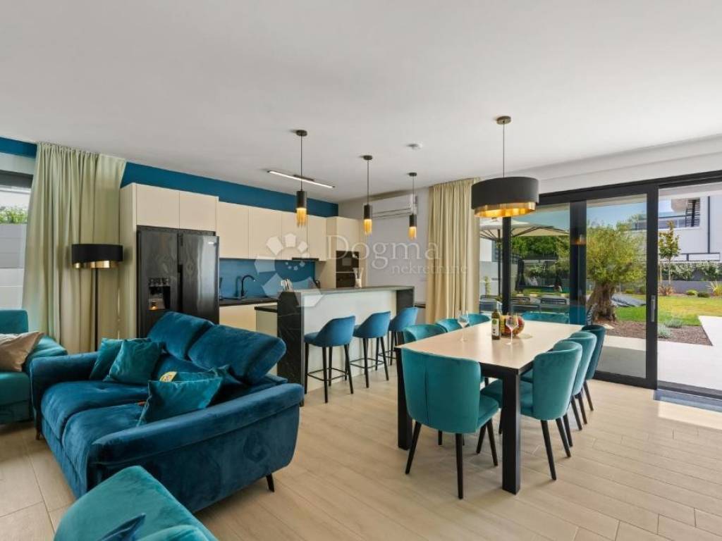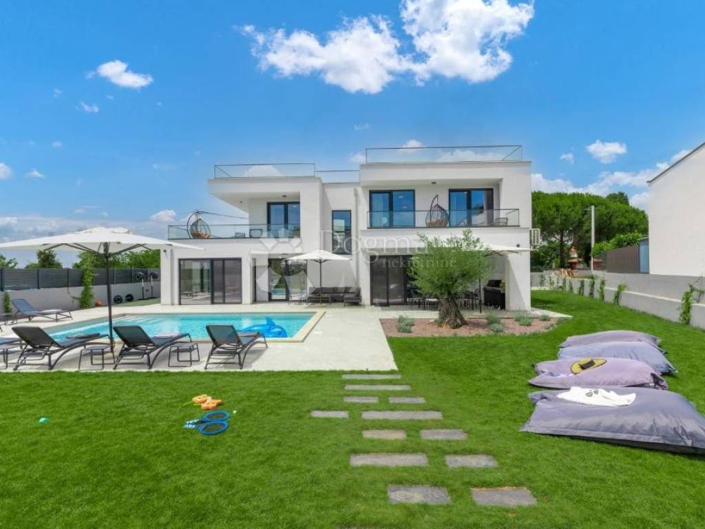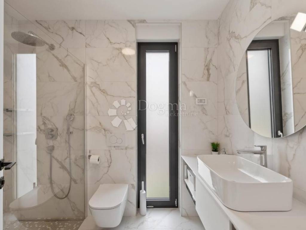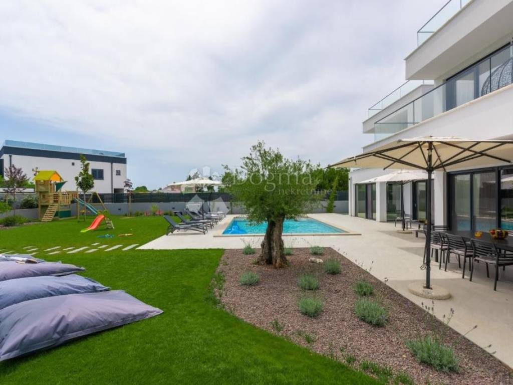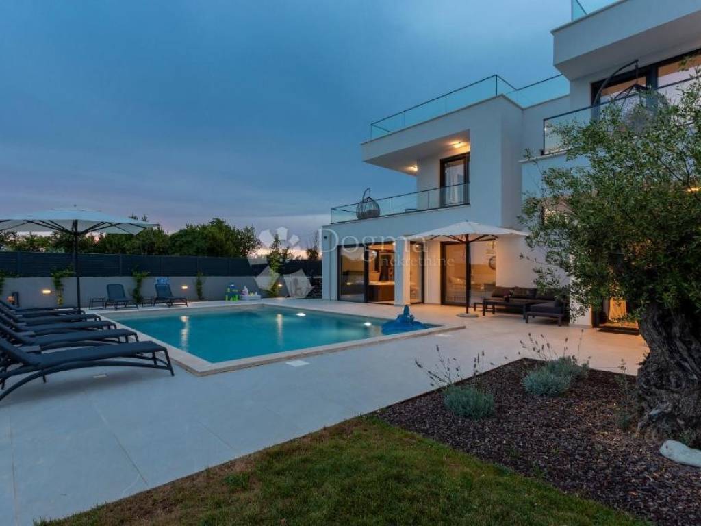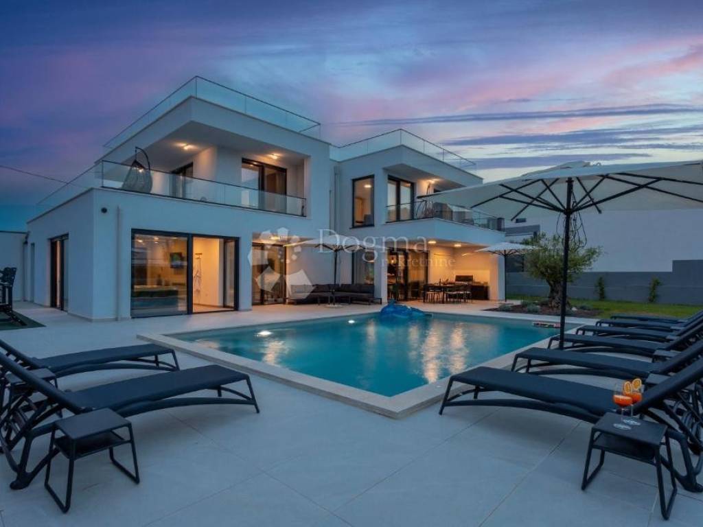 A new luxuriously equipped modern villa for sale in a beautiful location 300m from the sea. The total area of the villa is 195m2, and it is spread over a landscaped plot of 1100m2. On the ground floor there is a large spacious living room with large glass walls overlooking the pool and a modernly decorated and equipped kitchen, on the ground floor there is one bedroom with a bathroom, and on the first floor there are three bedrooms each with its own bathroom. The bedrooms on the first floor all have access to the roof terrace with a beautiful view of the sea. The yard is modern and luxuriously decorated, it contains a large swimming pool of 50 m2, a sunbathing area and an area for outdoor fitness and gym. For all questions and more information, contact us at: Igor Ostojić mediation assistant +385 91 732 5577 igor.ostojic@dogma-nekretnine.com