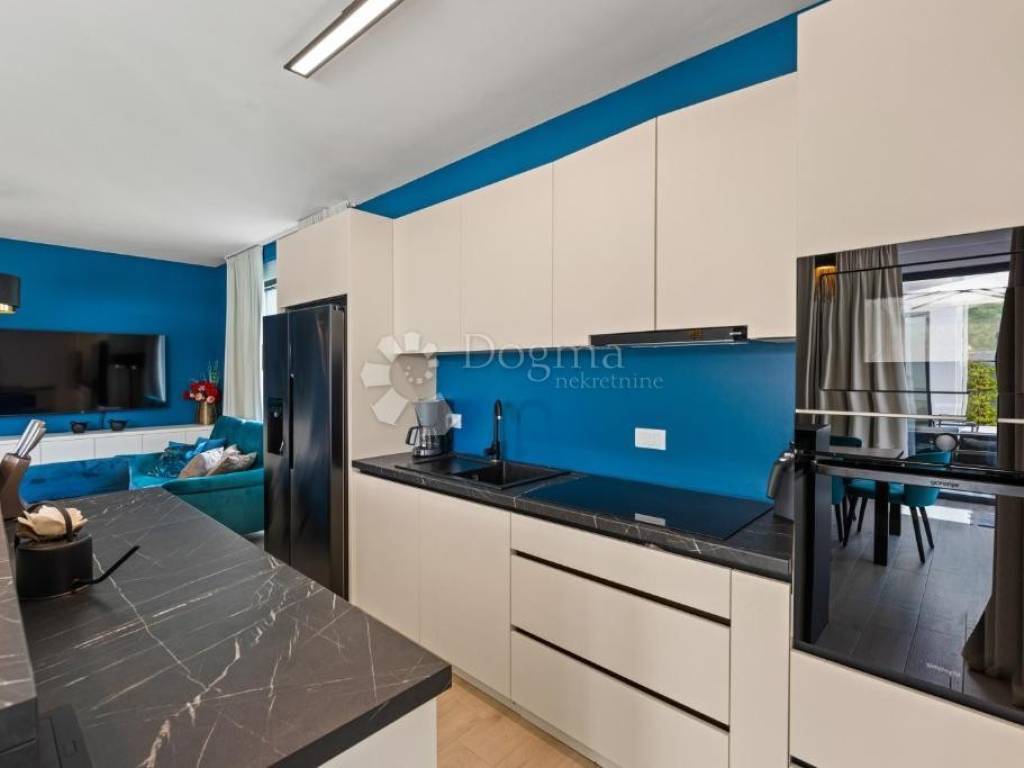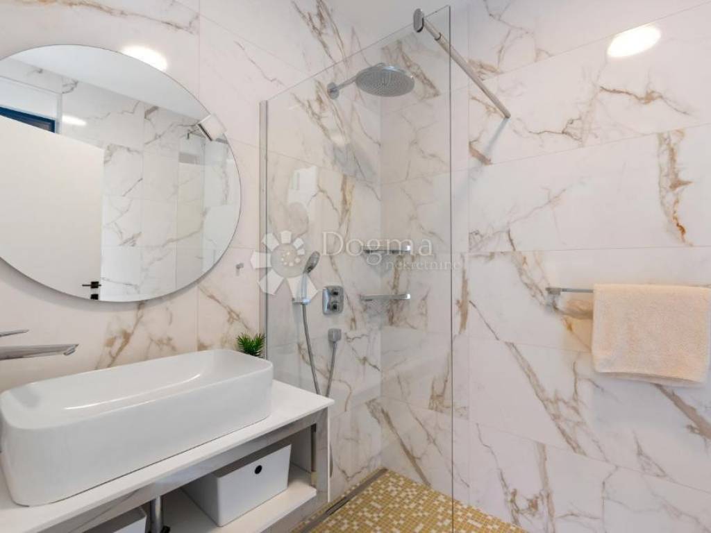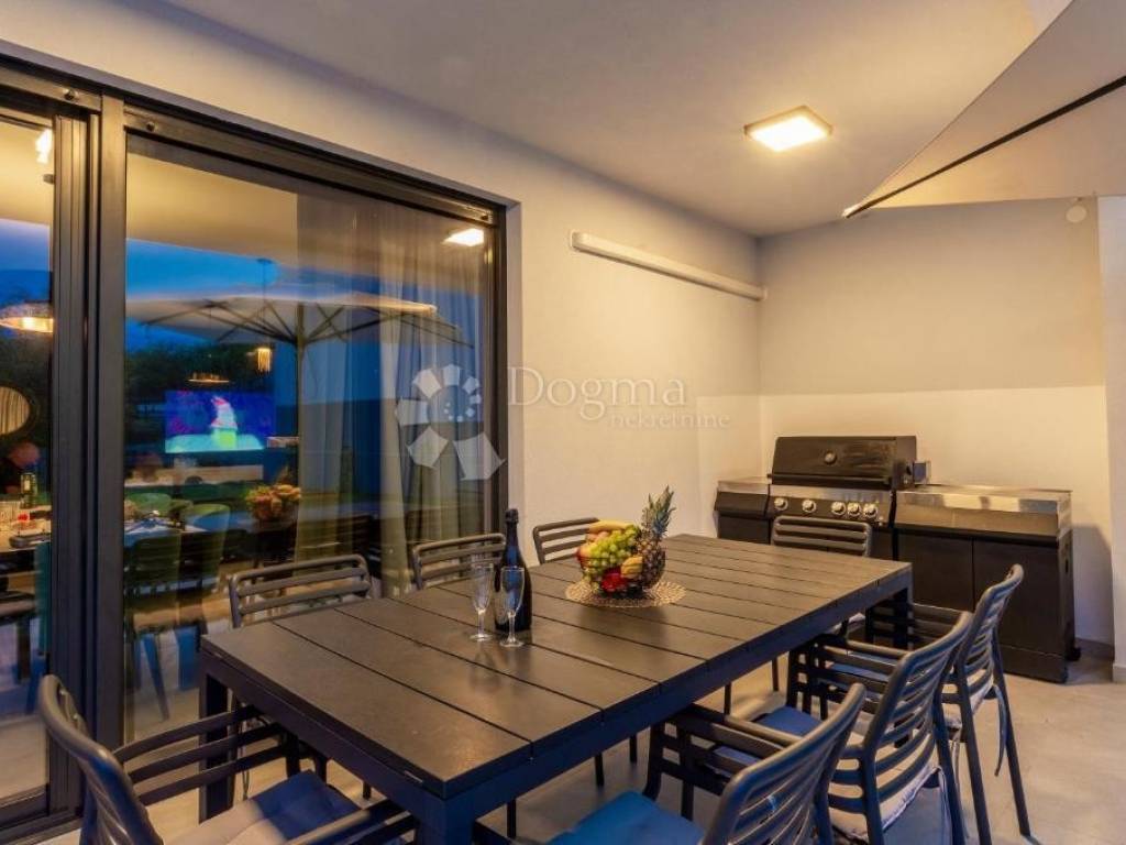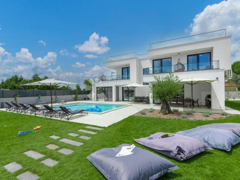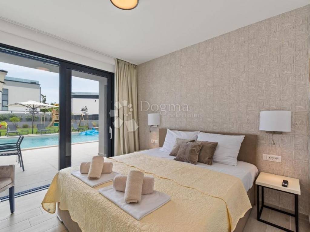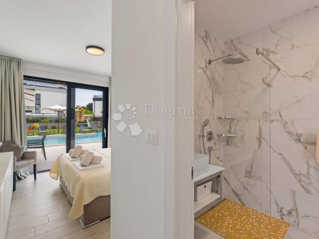 A new luxuriously equipped modern villa for sale in a beautiful location 300m from the sea. The total area of the villa is 195m2, and it is spread over a landscaped plot of 1100m2. On the ground floor there is a large spacious living room with large glass walls overlooking the pool and a modernly decorated and equipped kitchen, on the ground floor there is one bedroom with a bathroom, and on the first floor there are three bedrooms each with its own bathroom. The bedrooms on the first floor all have access to the roof terrace with a beautiful view of the sea. The yard is modern and luxuriously decorated, it contains a large swimming pool of 50 m2, a sunbathing area and an area for outdoor fitness and gym. For all questions and more information, contact us at: Igor Ostojić mediation assistant +385 91 732 5577 igor.ostojic@dogma-nekretnine.com