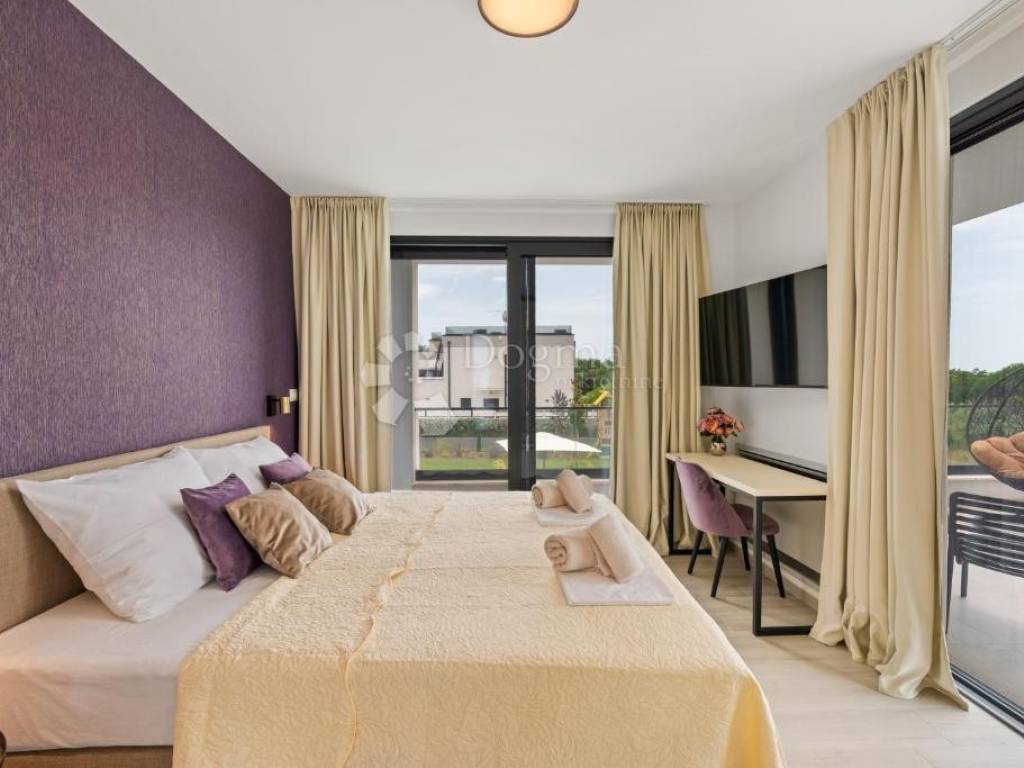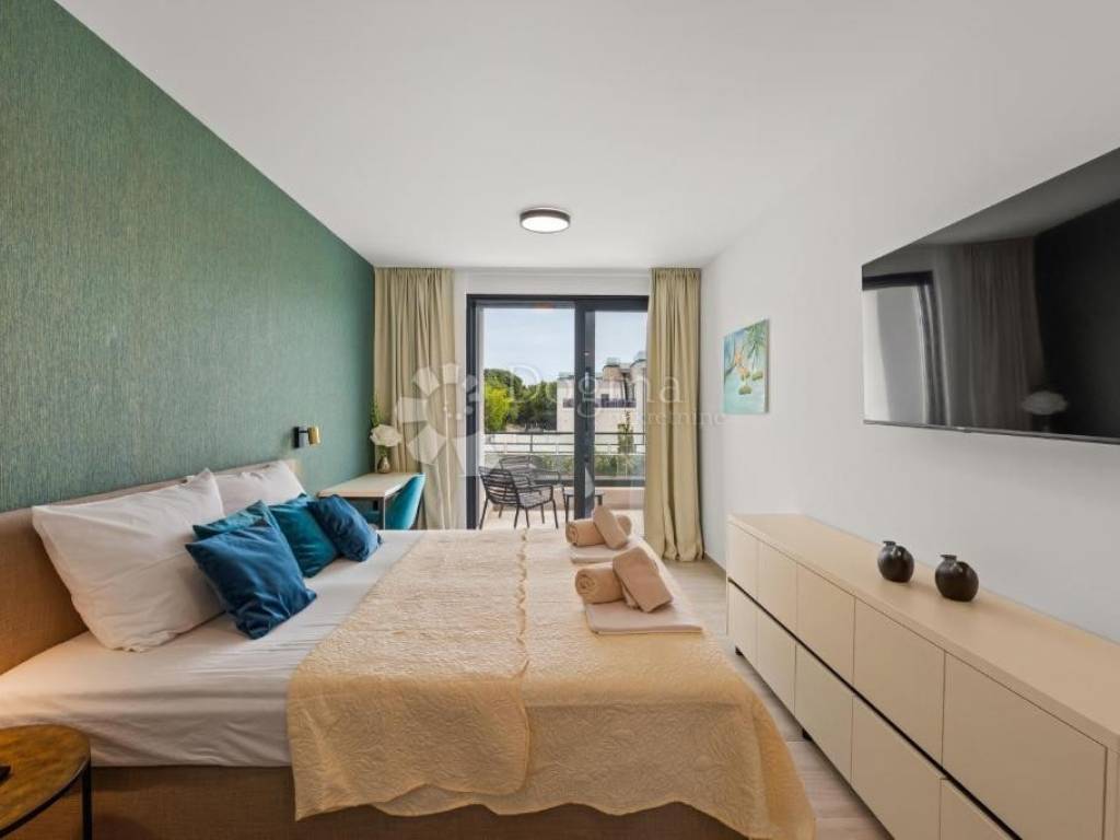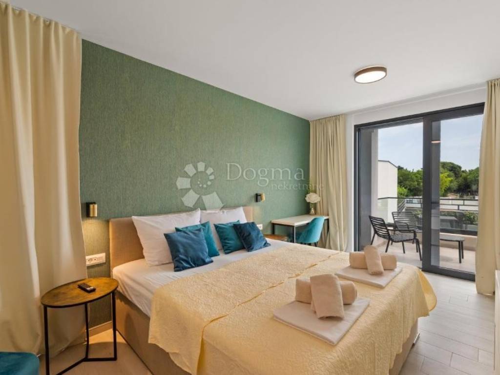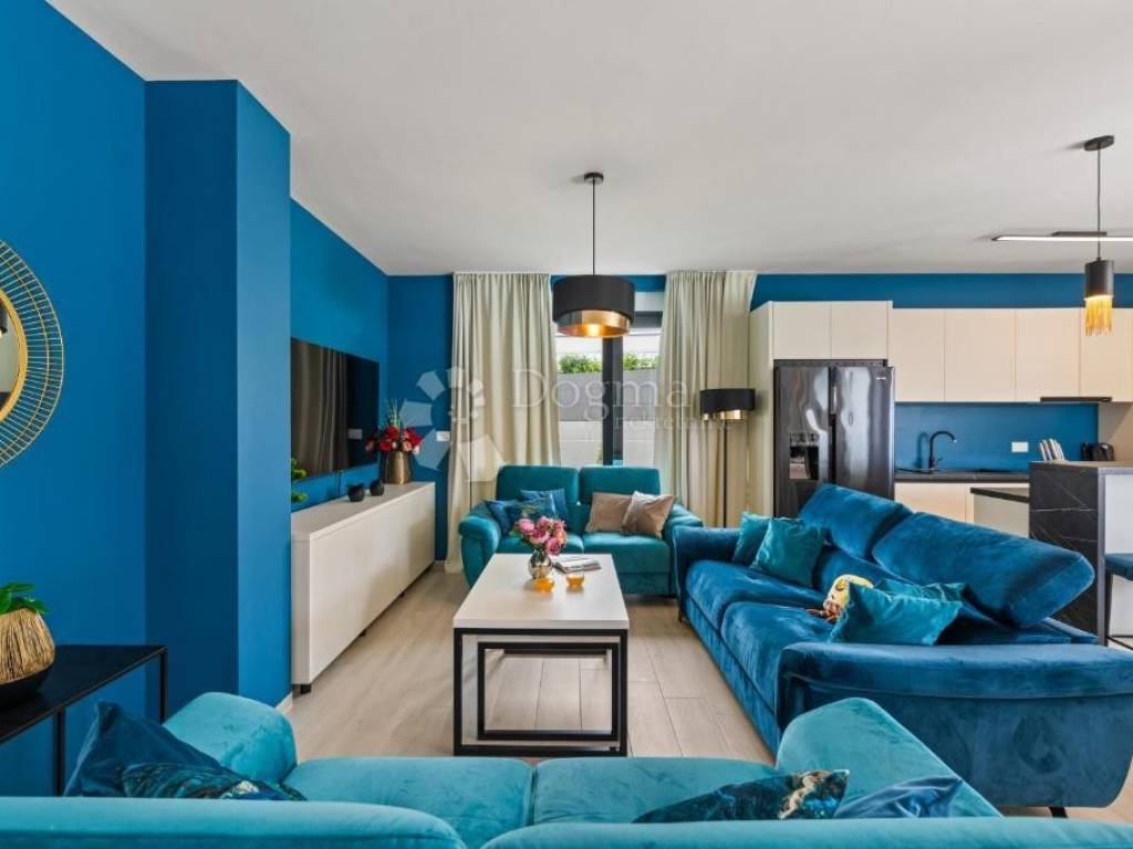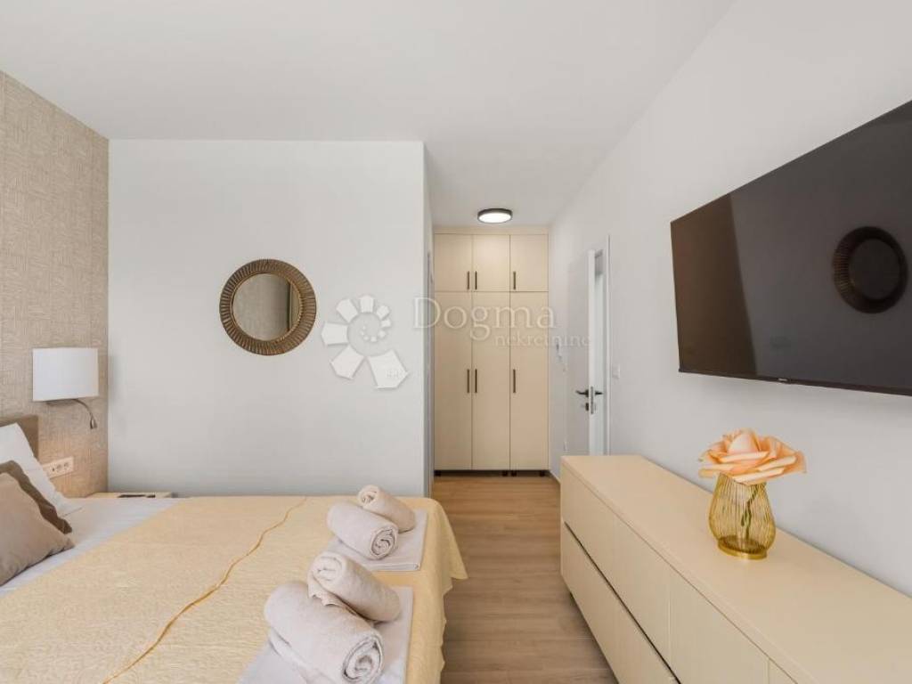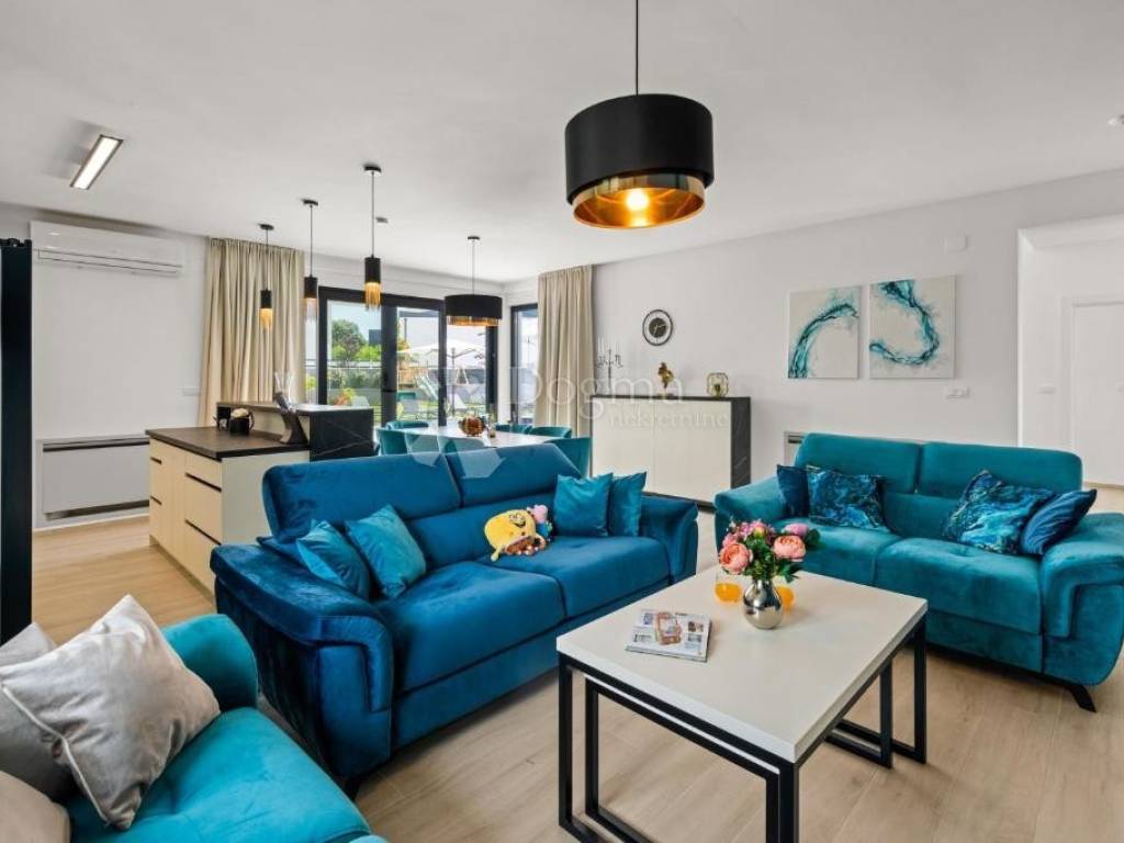 A new luxuriously equipped modern villa for sale in a beautiful location 300m from the sea. The total area of the villa is 195m2, and it is spread over a landscaped plot of 1100m2. On the ground floor there is a large spacious living room with large glass walls overlooking the pool and a modernly decorated and equipped kitchen, on the ground floor there is one bedroom with a bathroom, and on the first floor there are three bedrooms each with its own bathroom. The bedrooms on the first floor all have access to the roof terrace with a beautiful view of the sea. The yard is modern and luxuriously decorated, it contains a large swimming pool of 50 m2, a sunbathing area and an area for outdoor fitness and gym. For all questions and more information, contact us at: Igor Ostojić mediation assistant +385 91 732 5577 igor.ostojic@dogma-nekretnine.com