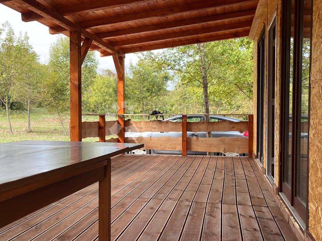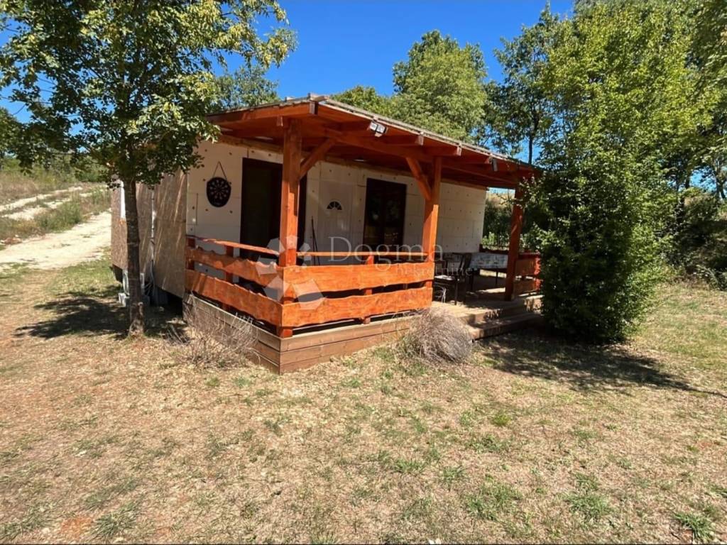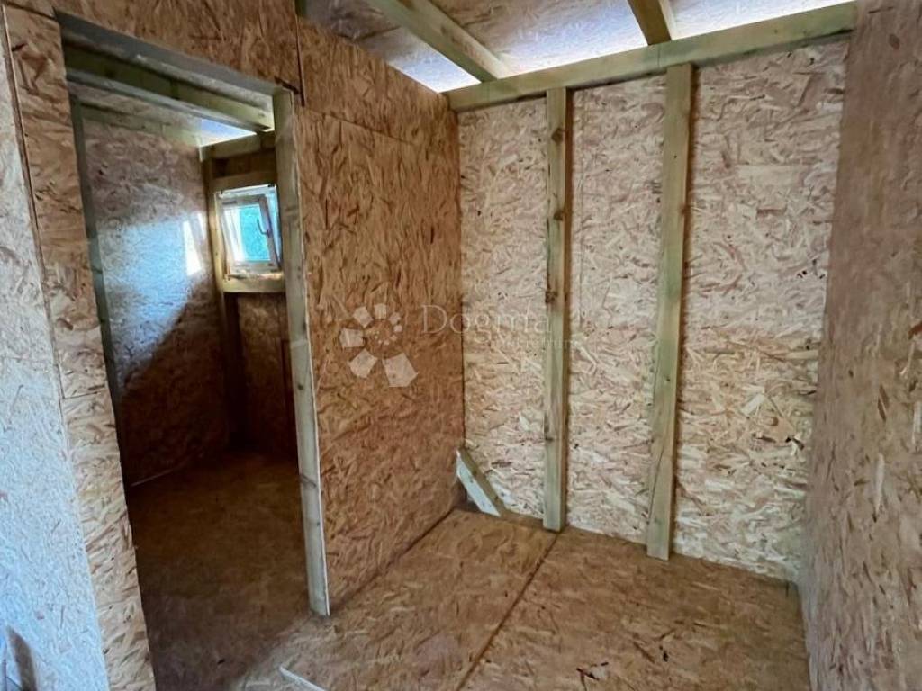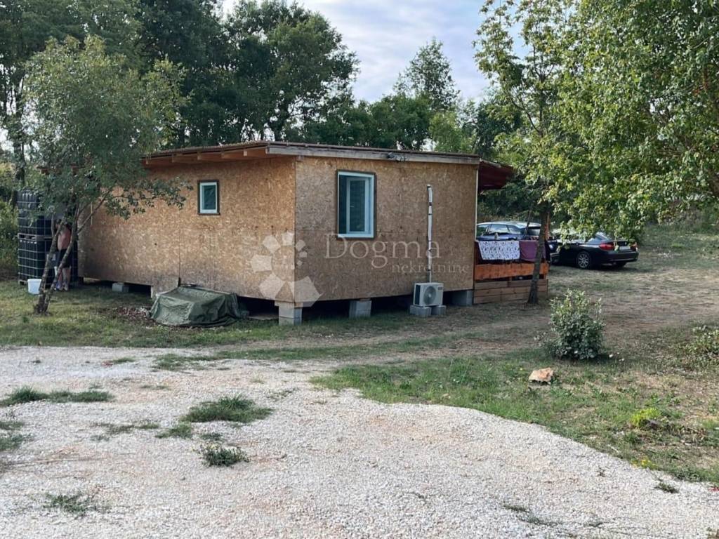 Na zemljištu je postavljena kućica od OSB ploča, koja može služiti kao skladište ili pomoćni objekt.