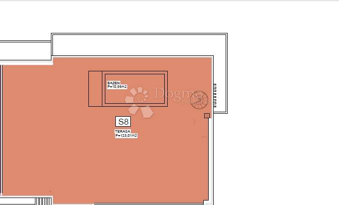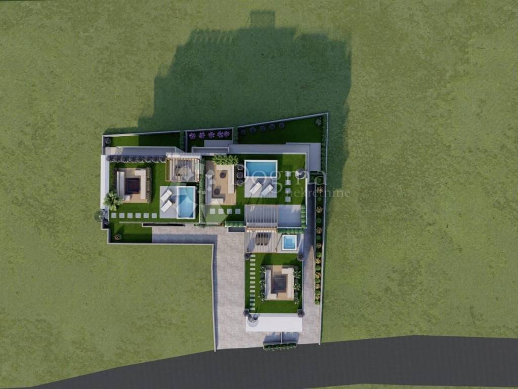 The living room with kitchen and dining area opens through sliding glass walls onto a spacious terrace facing northeast (27.04 m), and elegant circular stairs lead to the rooftop terrace (123.01 m) with a pool (20.56 m), offering a unique panoramic view of the sea and Vodice. This combination of privacy, luxury, and Mediterranean lifestyle is rare and exceptional.
