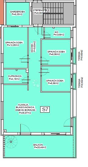 The penthouse is mostly south-facing, ensuring abundant natural light throughout the day. The living room with kitchen and dining area opens onto a spacious balcony via sliding glass doors, while elegant spiral stairs lead to the rooftop terrace with a pool, offering unique views of the sea and Vodice a perfect blend of privacy, luxury, and Mediterranean lifestyle.