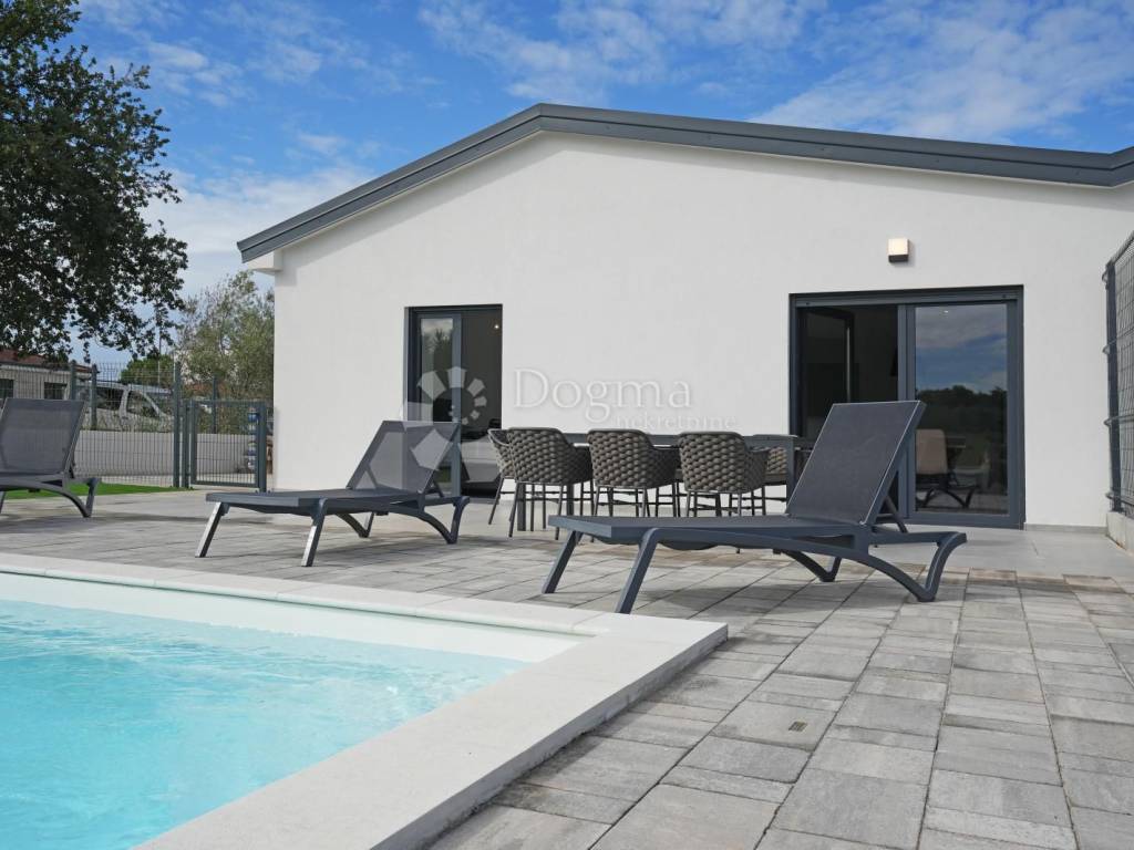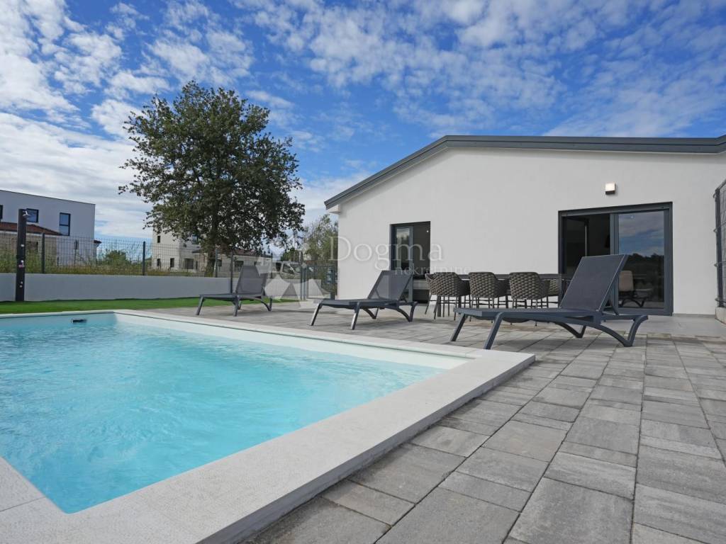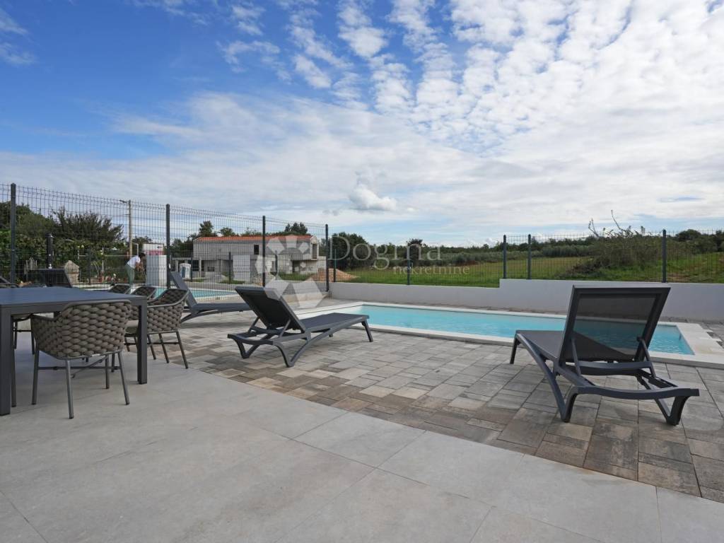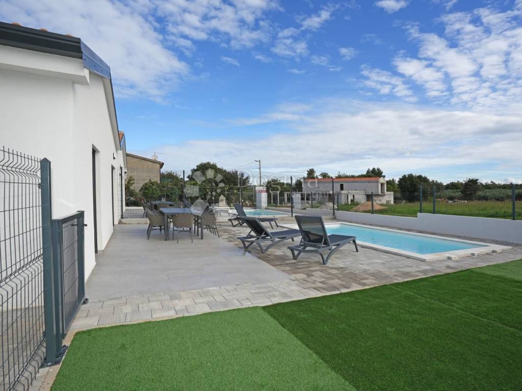 POREČ (surroundings) - Single-storey house with heated pool Welcome to your new modern oasis - a newly built, breathtaking single-storey house, located just a few minutes' drive from Poreč! This house, equipped with top-quality furniture, perfectly combines functionality and style, providing the warmth and comfort that your family deserves. Its net living area is 75m2 with a perfect layout, while the terrace is approximately 30m2. You enter through an elegant hallway that leads you to an open space with a kitchen and dining area, ideal for family gatherings and friendly socializing. The spacious living room with access to a covered terrace invites you to enjoy the fresh air, regardless of the season. This house offers three modern bedrooms, one of which has direct access to the terrace and a beautiful heated pool, as well as an en suite bathroom that guarantees intimacy and comfort. The other two bedrooms, ideal for family members or guests, share a practical bathroom, providing the necessary space for everyone. Built with care from quality materials, this house includes all modern amenities, including underfloor heating and air conditioning, so you will always have the ideal temperature within your four walls. Aluminum windows with electric roller shutters provide superior functionality and energy efficiency. The garden features a beautiful sundeck and heated pool that extend the summer season and create the perfect place to relax with family or friends. This property is not only ideal for living, but also represents an excellent opportunity for tourist rental, thanks to the proximity of all amenities. So that all your guests always have somewhere to park, the house also offers two parking spaces. Take a peek into your new lifestyle in this extraordinary house that offers everything you need for a comfortable, modern and carefree life!