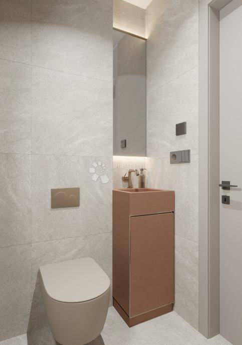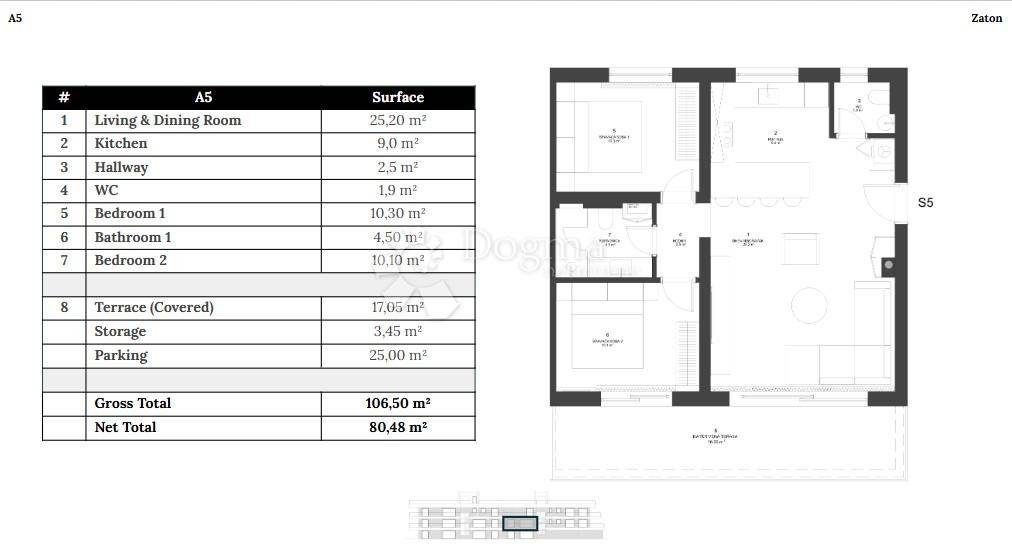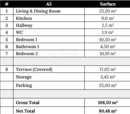 Apartment A5, warm and compact with its 80.48 m net space, offers everything needed for carefree living. Two bedrooms, a bathroom and an additional WC, an open-plan kitchen and living room all seamlessly extended onto a 17 m covered terrace, the perfect stage for morning coffee or a glass of wine at dusk.