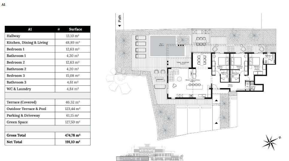 The net surface of the residence is 191.10 m, with a total gross area including outdoor spaces and facilities of 474.78 m. The building is complete and soon ready for move-in, with interiors adorned by carefully chosen designer furniture every piece placed with intent, forming a harmonious whole.