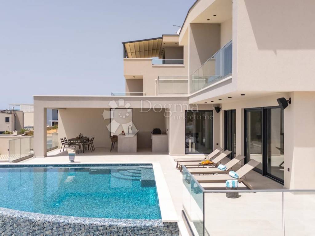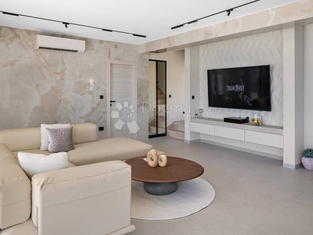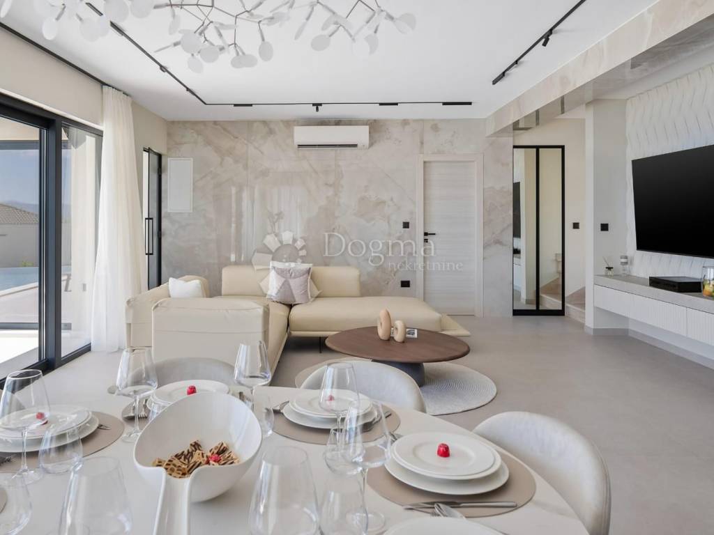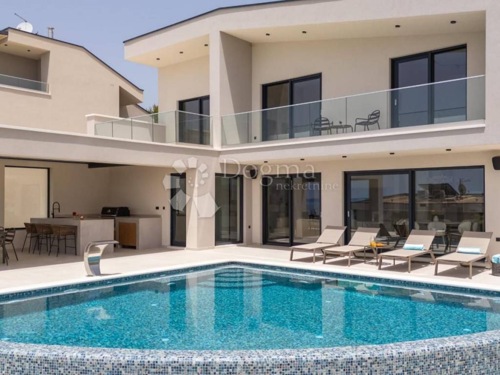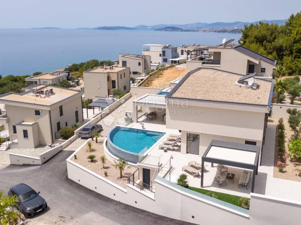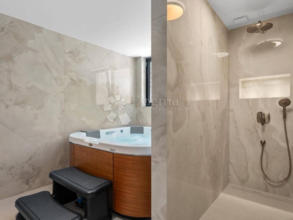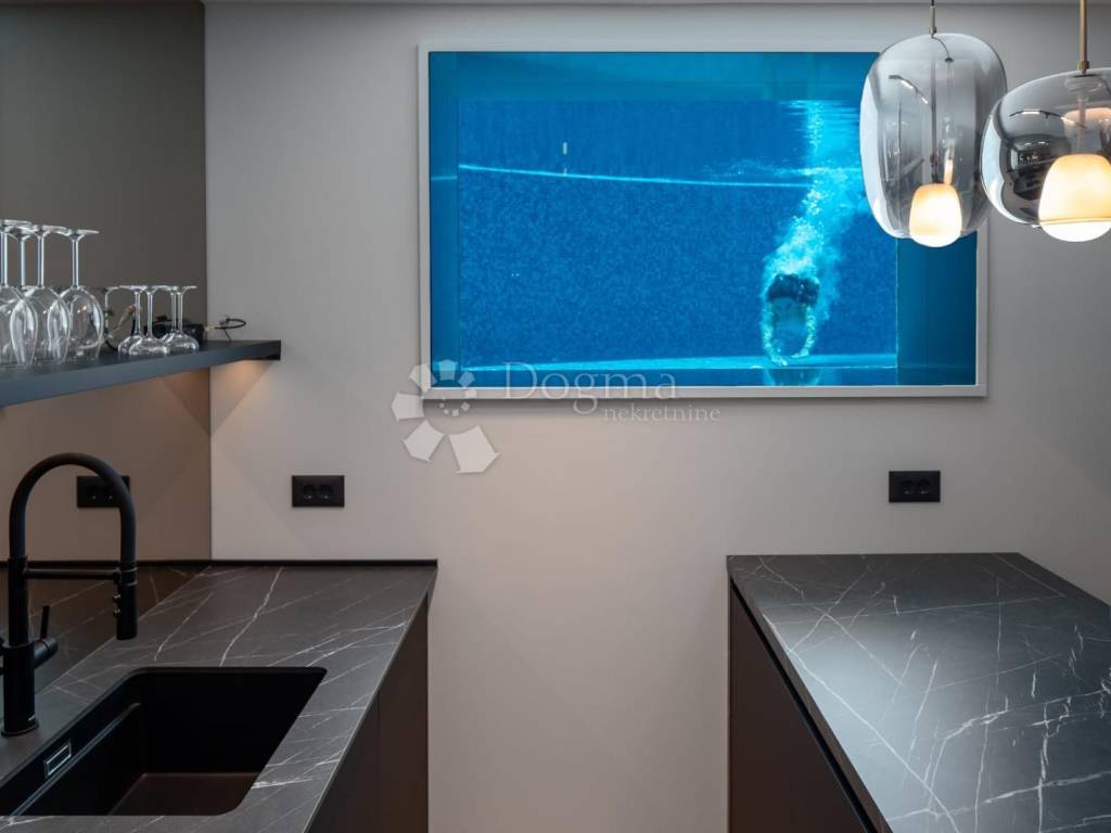 and for sale is an exclusive luxury villa situated in an elevated position with a beautiful panoramic sea view. The villa is located within a prestigious complex of modernly designed villas, providing a high standard of living, complete privacy and a peaceful atmosphere. Basic features: Land area: 620 m Living area: 300 m Number of floors: three basement, ground floor and first floor Space layout Basement: The basement is designed as a zone for relaxation and entertainment. It contains a spacious garage for two cars, a storage room, a wellness area with a sauna and jacuzzi, a home cinema, billiards and a fully equipped kitchen with an elegant bar. Ground floor: The ground floor consists of a spacious open-space living area that combines the kitchen, dining room and living room, creating the perfect space for socializing and family gatherings. On this floor there is also a master bedroom with its own luxurious bathroom. Large glass walls allow plenty of natural light and water directly into the landscaped courtyard with a swimming pool, creating a perfect connection between the interior and exterior. Floor: On the first floor there are three elegantly decorated bedrooms, each with its own bathroom, providing complete privacy and comfort. Additional information Only the highest quality materials were used in the construction of the villa, and the interior is fully equipped and furnished with luxurious furniture from renowned Italian brands. The villa stands out with its modern architecture, top functionality and impressive views of the surrounding nature. This property offers the perfect balance of luxury, comfort and privacy, ideal for those seeking an elegant and sophisticated lifestyle on the Adriatic.