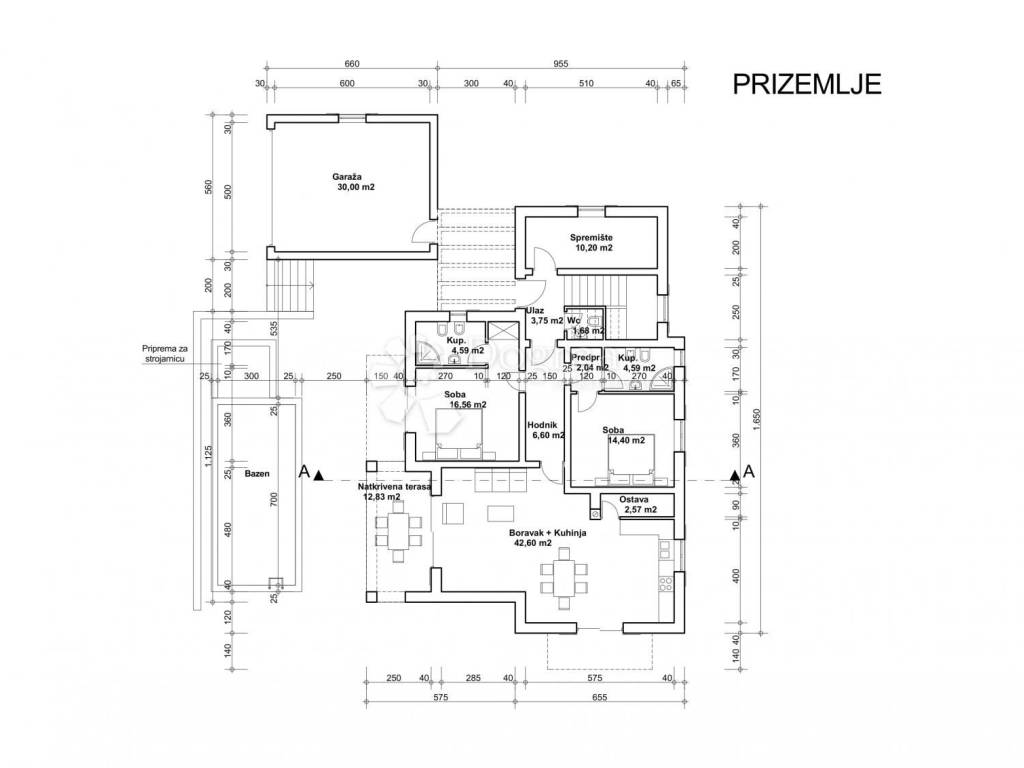 Prizemlje se sastoji od ulaznog hodnika, spremišta, dvije prostrane spavaće sobe od koji svaka ima svoju kupaonu, wc ,kuhinje sa dnevnim boravkom iz kojeg se izlazi na natkrivenu terasu, ostave i garaže.