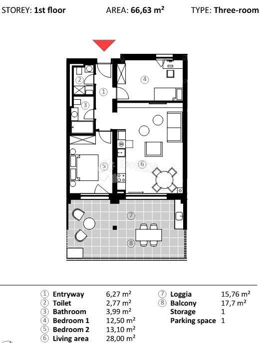 The apartment has a net usable area of 66.63 m, along with a balcony of 33.46 m perfect for enjoying your morning coffee or relaxing in the evening.