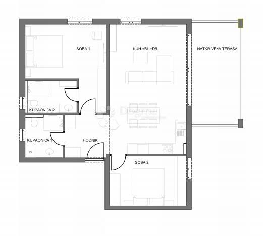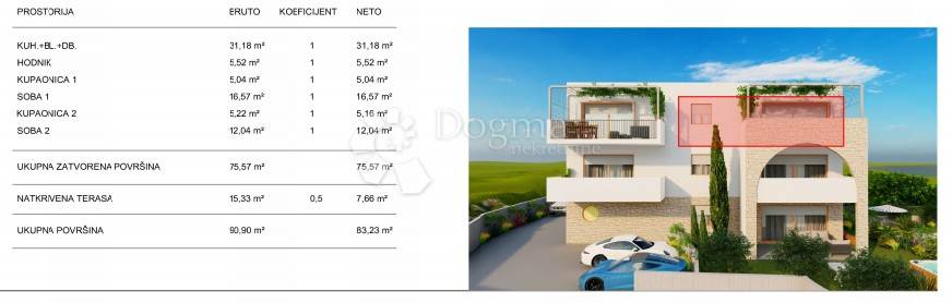 Apartment B4 has a total net area of 83.23 m and offers a spacious and functional layout. It is located on the second floor of the building and is northeast-oriented. It consists of two bedrooms measuring 12.04 m and 16.57 m, two bathrooms of 5.04 m and 5.16 m, and a spacious kitchen with dining and living area of 31.18 m that opens to a covered terrace of 15.33 m.