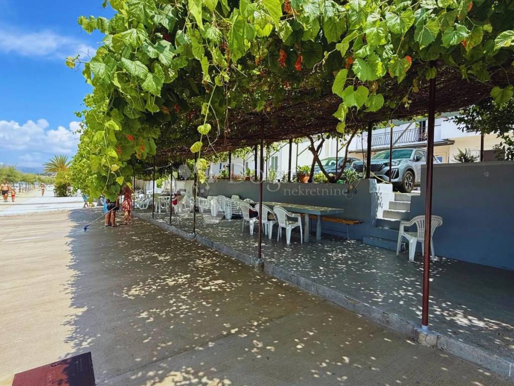 The large yard includes private parking and a small beach house that belongs to the property. The covered sunbed area is only 5 meters from the sea, while the beach is about 30 meters from the house, providing direct and quick access to the sea.