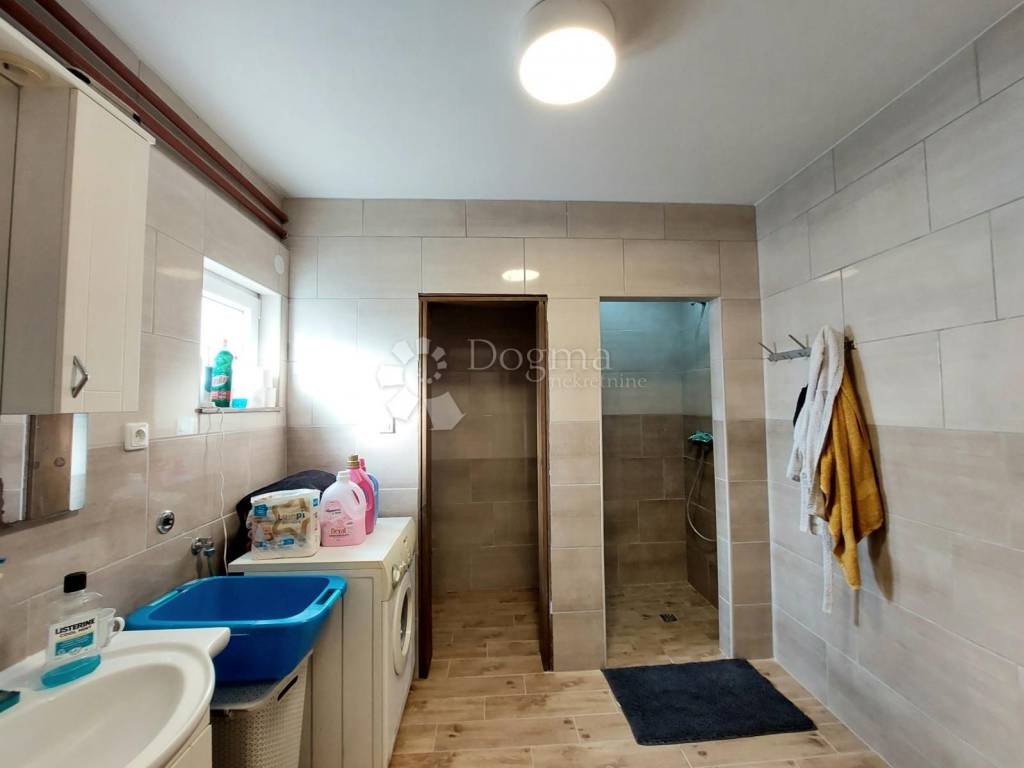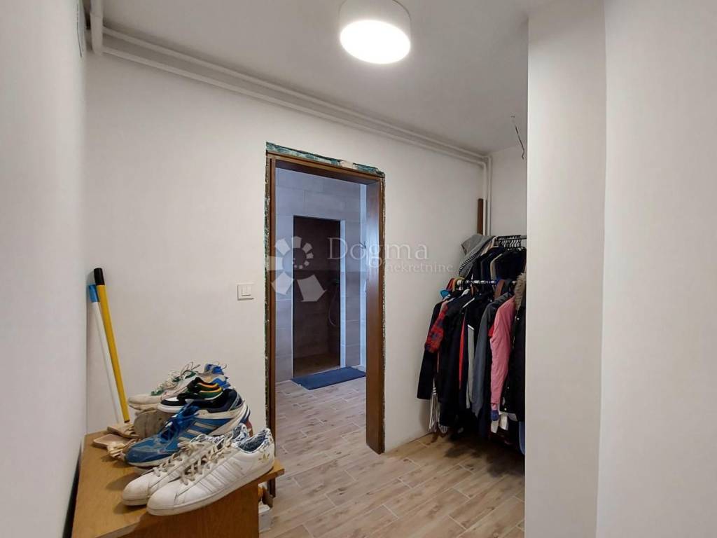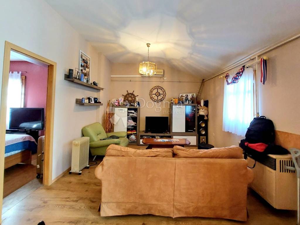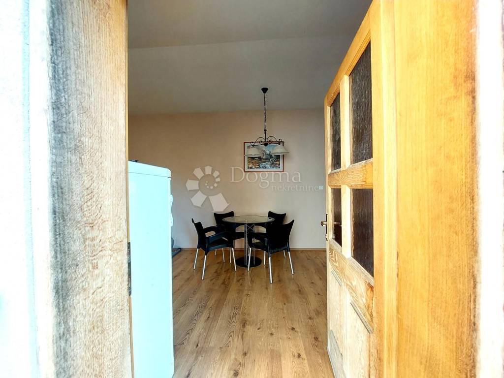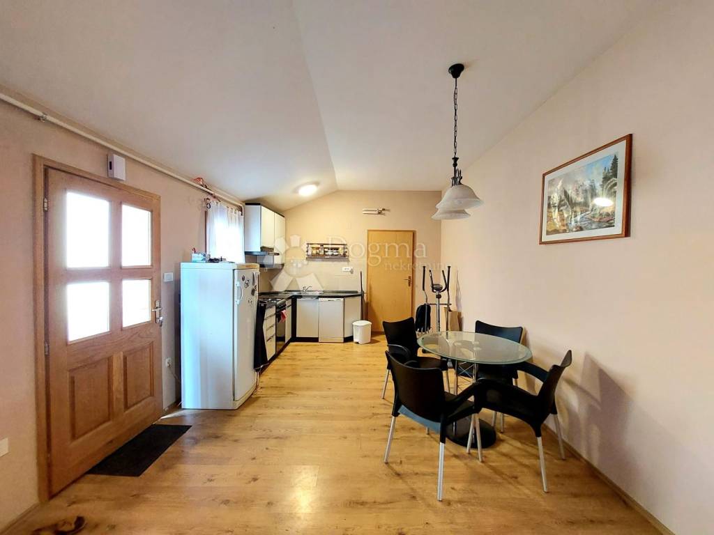 Na stražnjoj strani kuće smješten je ugodan stan koji se sastoji od otvorenog prostora dnevnog boravka s blagovaonicom i kuhinjom, spavaće sobe, garderobnog prostora te kupaone s toaletom. Stan je kompletno adaptiran i klimatiziran 2021. godine.