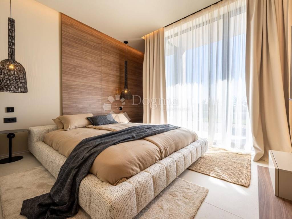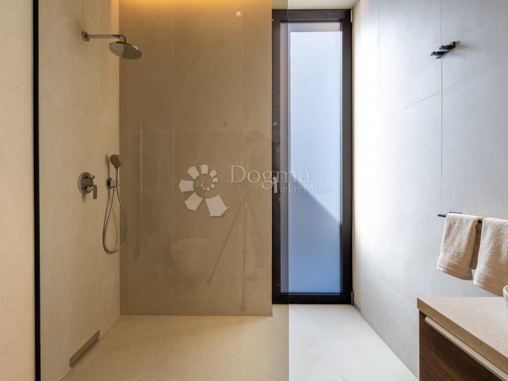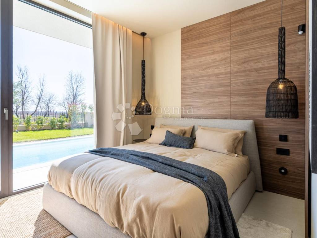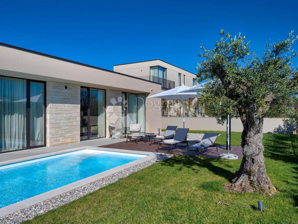 In an exceptional location in a newly built settlement (completely new infrastructure) is this modern single-storey house of top design, quality and fully equipped. Built in the first row of the settlement, next to a green area and olive groves, it is guaranteed an open view of the sea in the distance. The villa is fully automated via the Loxone smart home system, including a smart charger for electric vehicles.