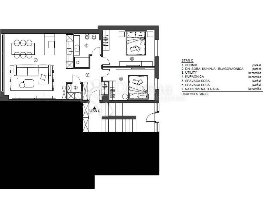 The facade of the building and the terrace are facing west, allowing you to enjoy the beautiful view of the sea and sunsets. The roof of the building is flat, which allows the installation of solar panels and the possibility of using renewable energy sources.
