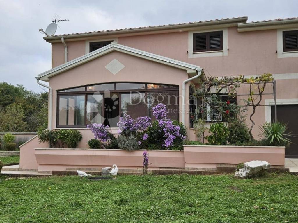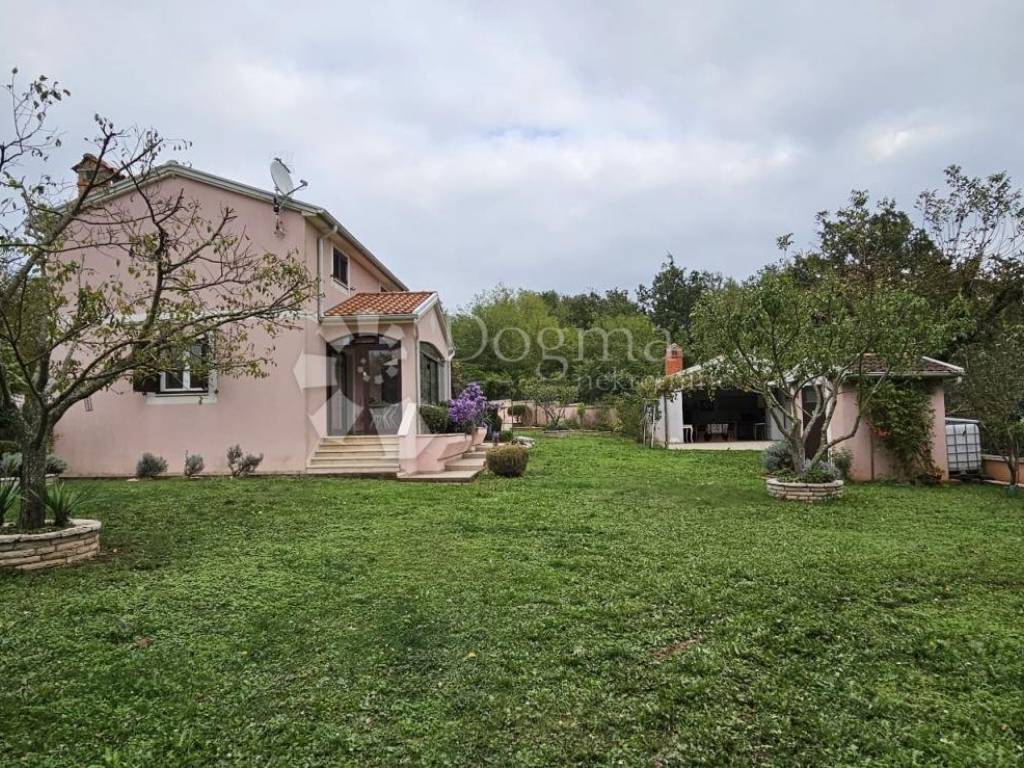 The plot is surrounded by a stone wall, and part of the yard is paved in the form of a terrace, while the rest is a lawn decorated with carefully selected plants. Next to the house there is an additional plot, fenced with dry wall, decorated with trees and rockery, ideal for enjoying nature. The side plot, also fenced with drywall, has an orchard with a rich variety of fruit trees: plums, quinces, apples, walnuts, jujubes, medlars, pears and vines.