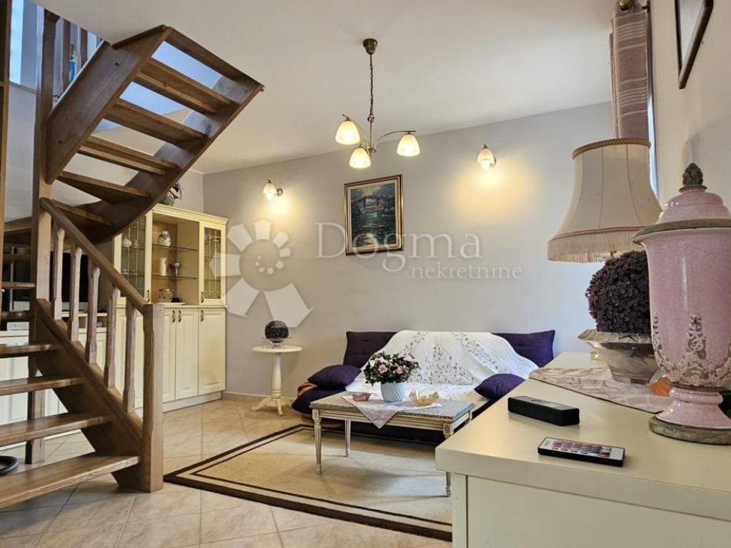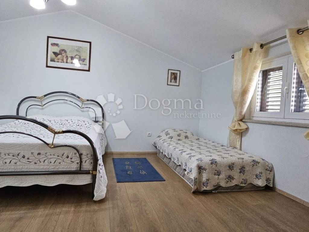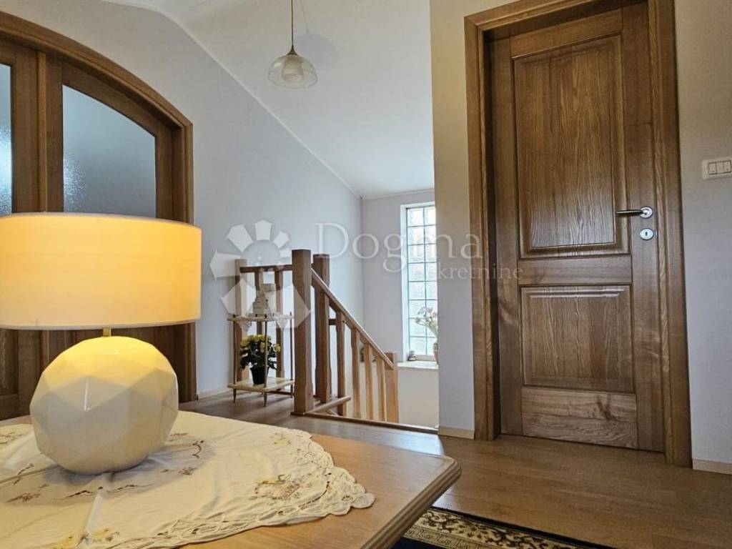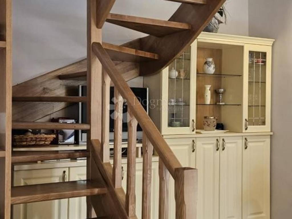 The upper ground floor offers a spacious loggia that leads to an open concept kitchen and living room. The kitchen is completely new, and the ambiance is further enhanced by the beautiful stone fireplace, which, in addition to heating, brings warmth and character to the space. Wooden stairs lead to the first floor, where there is an entrance hall that separates two spacious bedrooms and a modern bathroom.