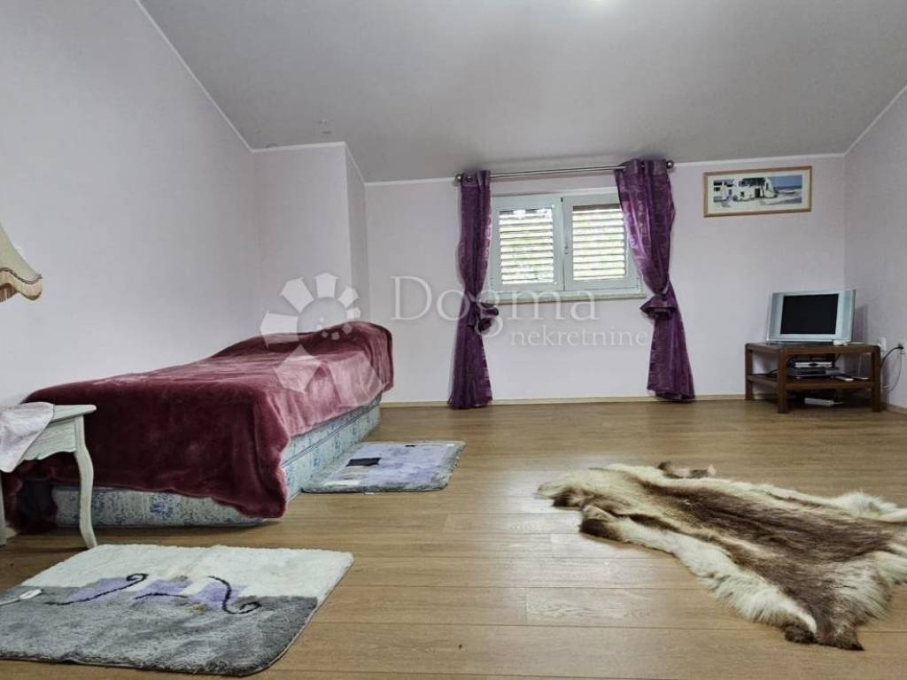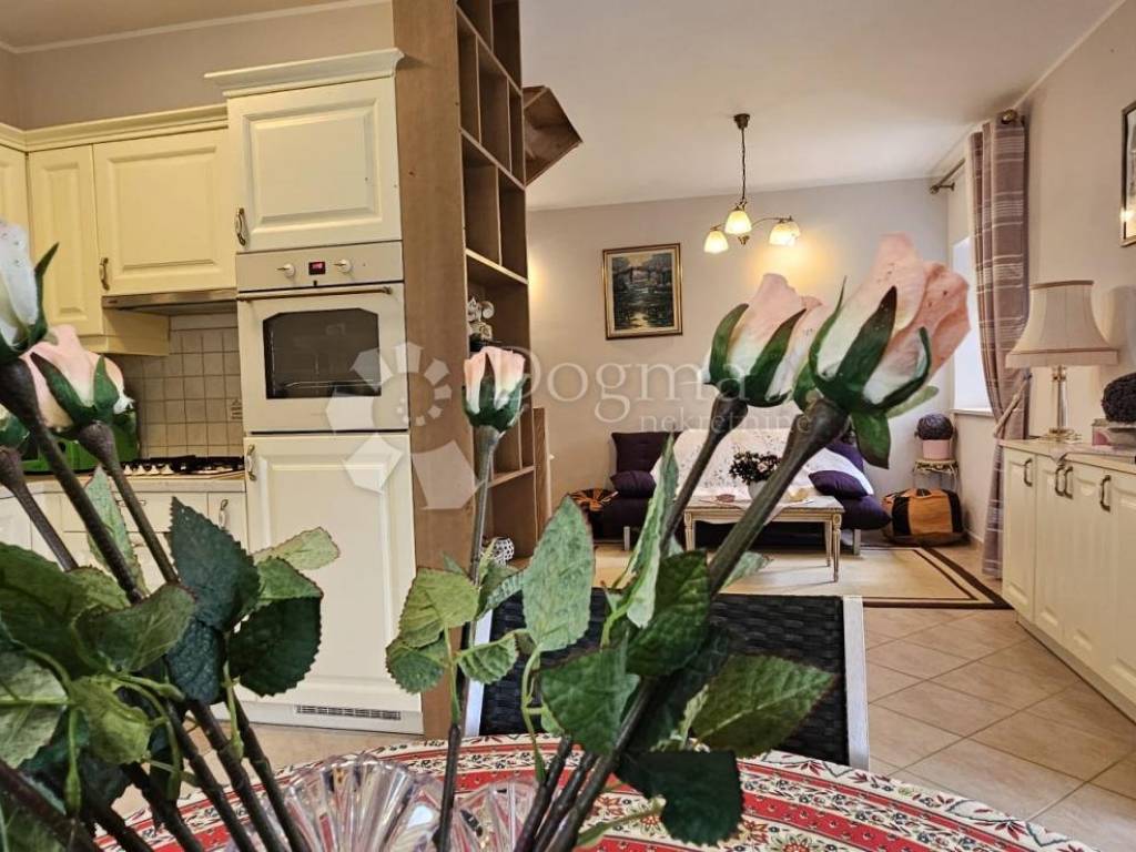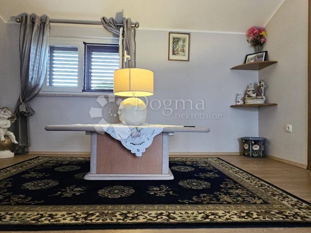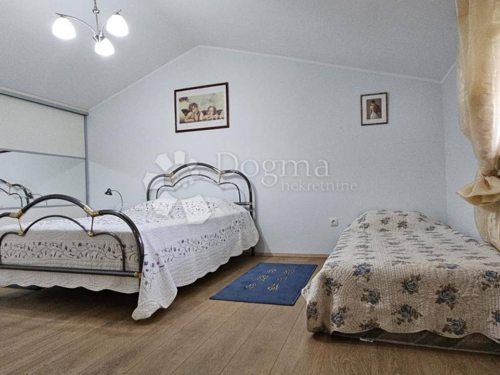 The upper ground floor offers a spacious loggia that leads to an open concept kitchen and living room. The kitchen is completely new, and the ambiance is further enhanced by the beautiful stone fireplace, which, in addition to heating, brings warmth and character to the space. Wooden stairs lead to the first floor, where there is an entrance hall that separates two spacious bedrooms and a modern bathroom.