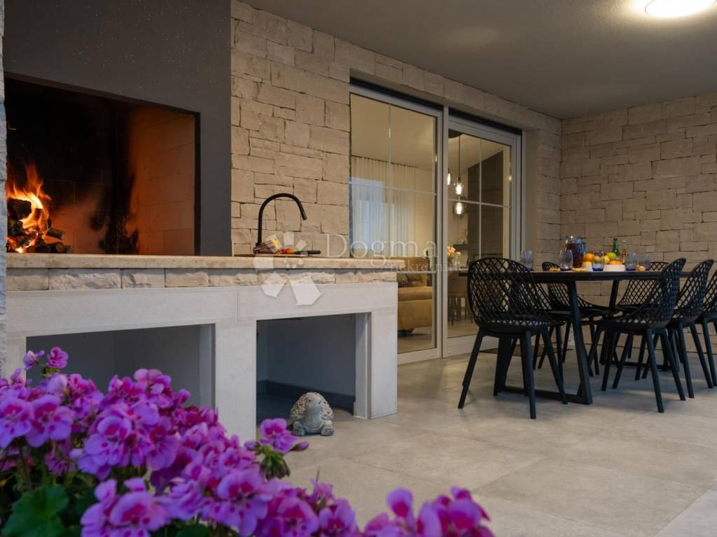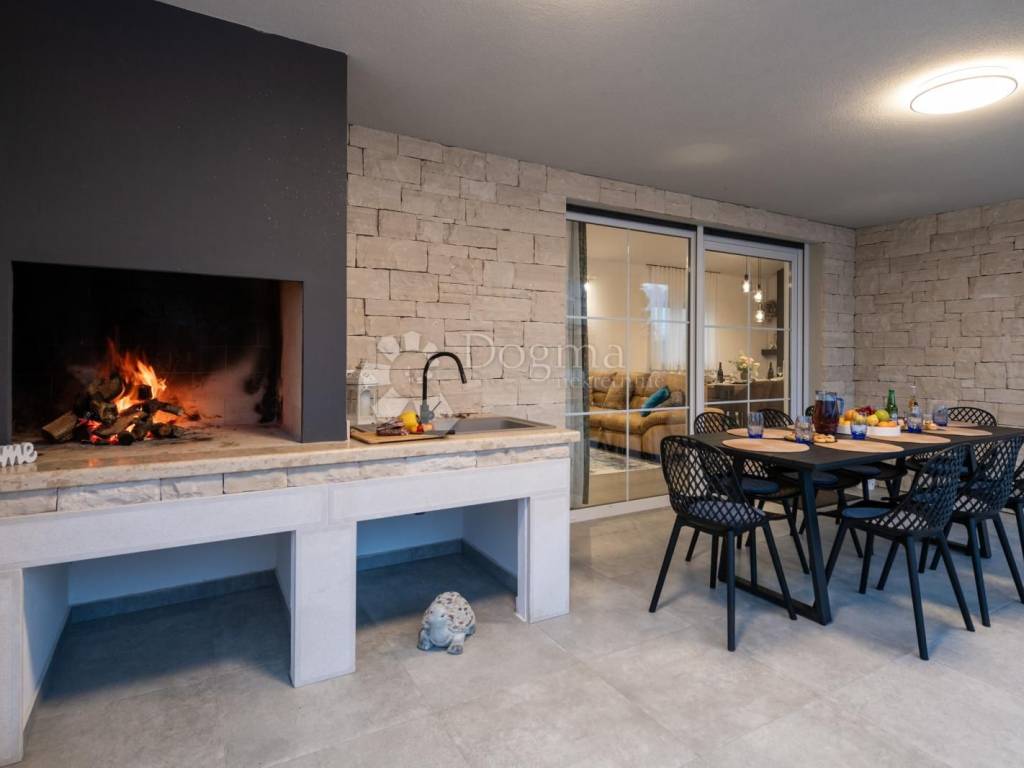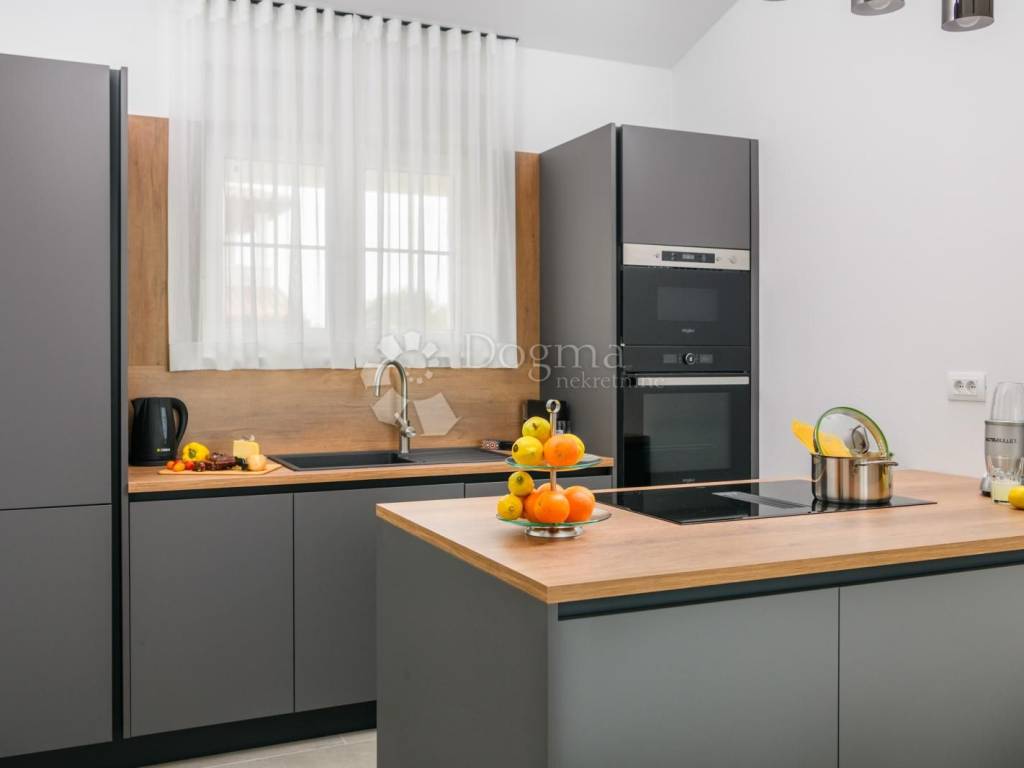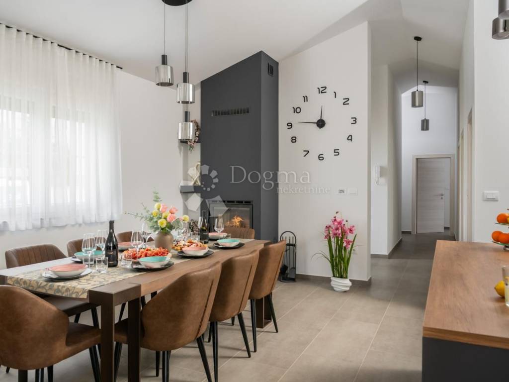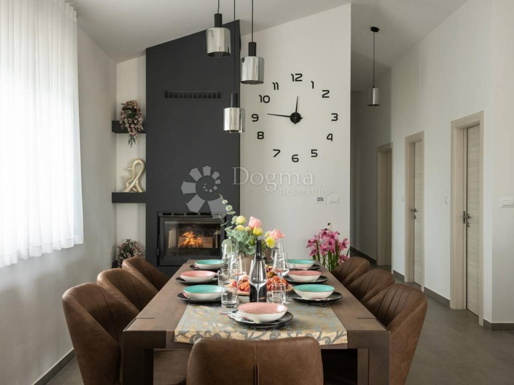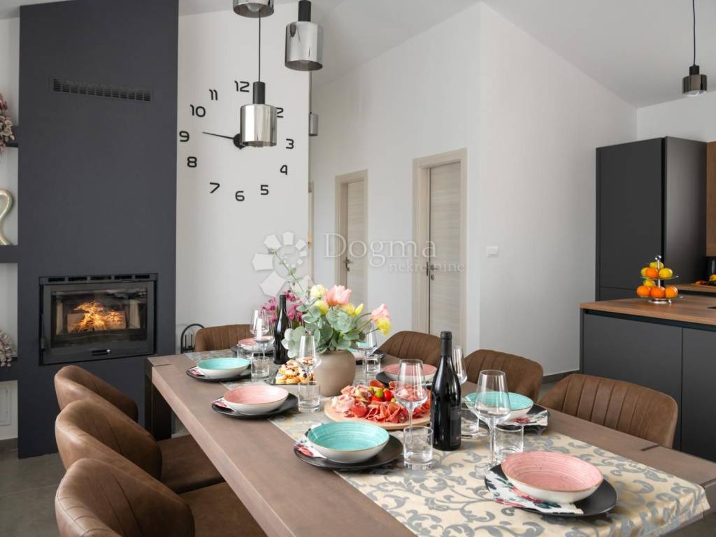 The living room, also the "main" part and the space that is used the most, leaves you breathless as soon as you enter it. A large designer kitchen with a bar, made to measure, is surely something that is the dream of every person who likes to cook. The kitchen is made of high-quality chipboard and high-quality materials, it is equipped with a built-in refrigerator, oven, dishwasher and microwave oven, while the hood is located inside the worktop, which is the very top when it comes to modern kitchens! In the continuation of the kitchen, as is usually the case, there is a dining room with a large and massive table for eight people, and finally a classically arranged living room, with a corner sofa and a television unit. From the "living area" there is also a large terrace where there is an additional "outdoor" table for dining and socializing, a fireplace and stairs as communication between the house and the outside area, that is, in this case, the pool area with the sun deck.
