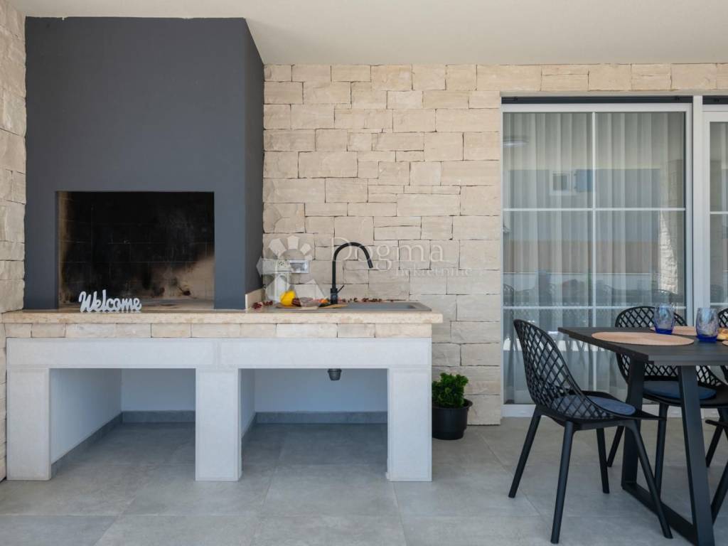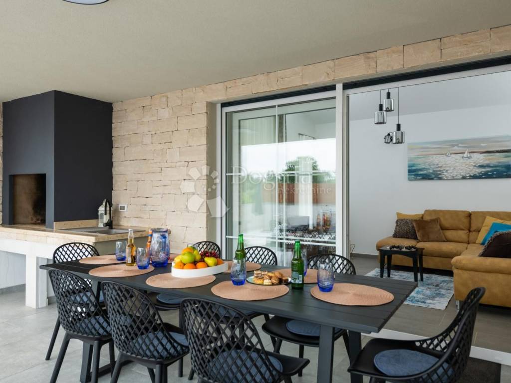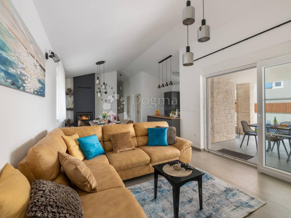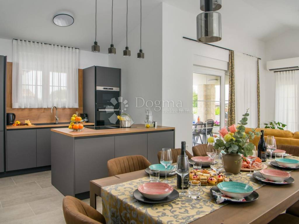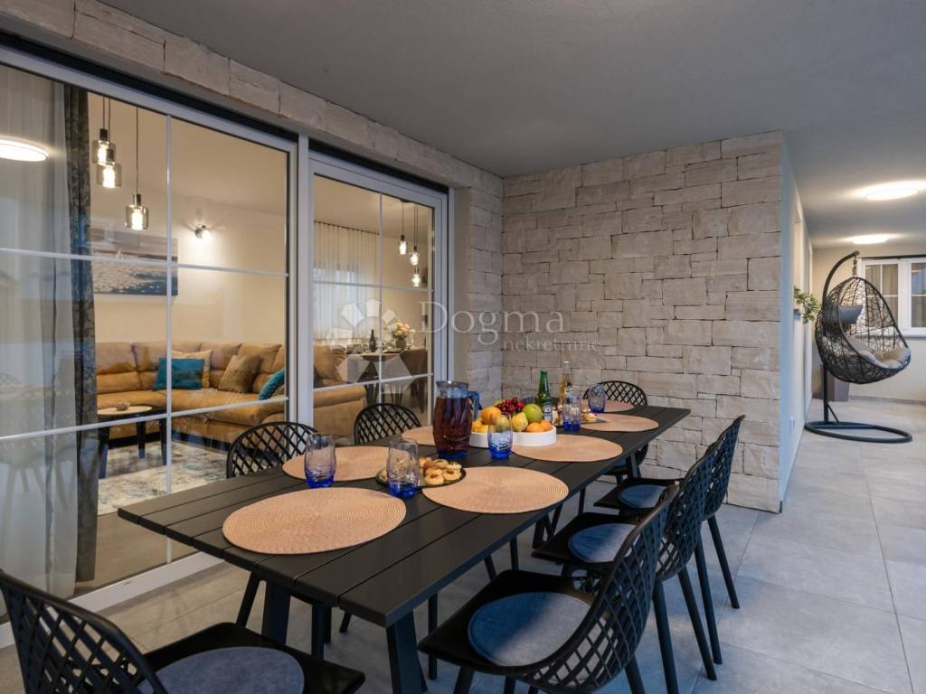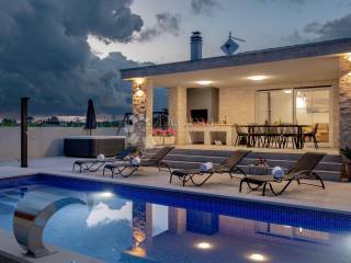 The living room, also the "main" part and the space that is used the most, leaves you breathless as soon as you enter it. A large designer kitchen with a bar, made to measure, is surely something that is the dream of every person who likes to cook. The kitchen is made of high-quality chipboard and high-quality materials, it is equipped with a built-in refrigerator, oven, dishwasher and microwave oven, while the hood is located inside the worktop, which is the very top when it comes to modern kitchens! In the continuation of the kitchen, as is usually the case, there is a dining room with a large and massive table for eight people, and finally a classically arranged living room, with a corner sofa and a television unit. From the "living area" there is also a large terrace where there is an additional "outdoor" table for dining and socializing, a fireplace and stairs as communication between the house and the outside area, that is, in this case, the pool area with the sun deck.