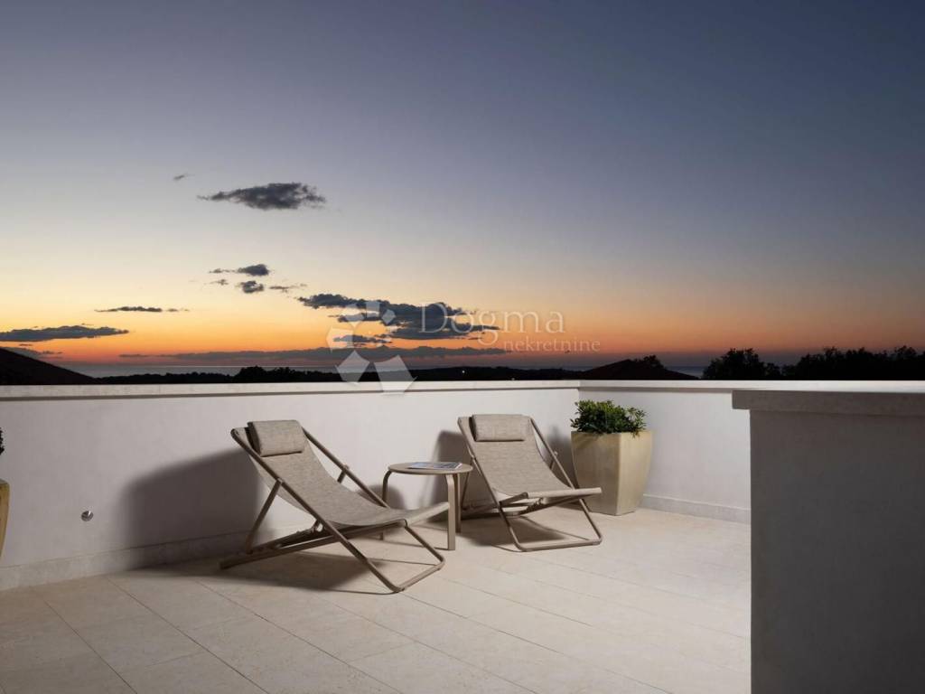 The ground floor of the villa welcomes you with an elegant entrance, which leads to a spacious living room, connected to a modern kitchen and dining room. In this part there is also a small bathroom for guests, as well as one bedroom with its own bathroom. The living room opens onto the covered terrace, where there is an outdoor dining area, a barbecue and a spacious sun deck next to the 33 m swimming pool.