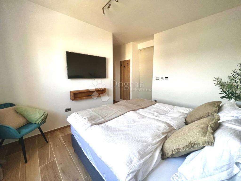 The villa covers an area of 428 m and consists of two floors. On the ground floor there is a modernly decorated space consisting of a living room with a dining room and a fully equipped kitchen. The living room is equipped with comfortable seats and a TV, and there are 12 chairs at the dining table. Thanks to its spaciousness, numerous seating areas and relaxation areas, this space is ideal for socializing and gatherings of larger groups of people. The entire space is air-conditioned, and for colder evenings, an indoor fireplace and underfloor heating are available. The villa has 5 bedrooms with double beds, each of which has its own bathroom. There is a gallery in 2 bedrooms, each of which has 1 more double bed, which will be ideal for children. Natural materials and many plants are incorporated into all bedrooms and bathrooms, and the neutral colors of the furniture make the space pleasant and relaxing. There is also a laundry room in the basement of the villa.