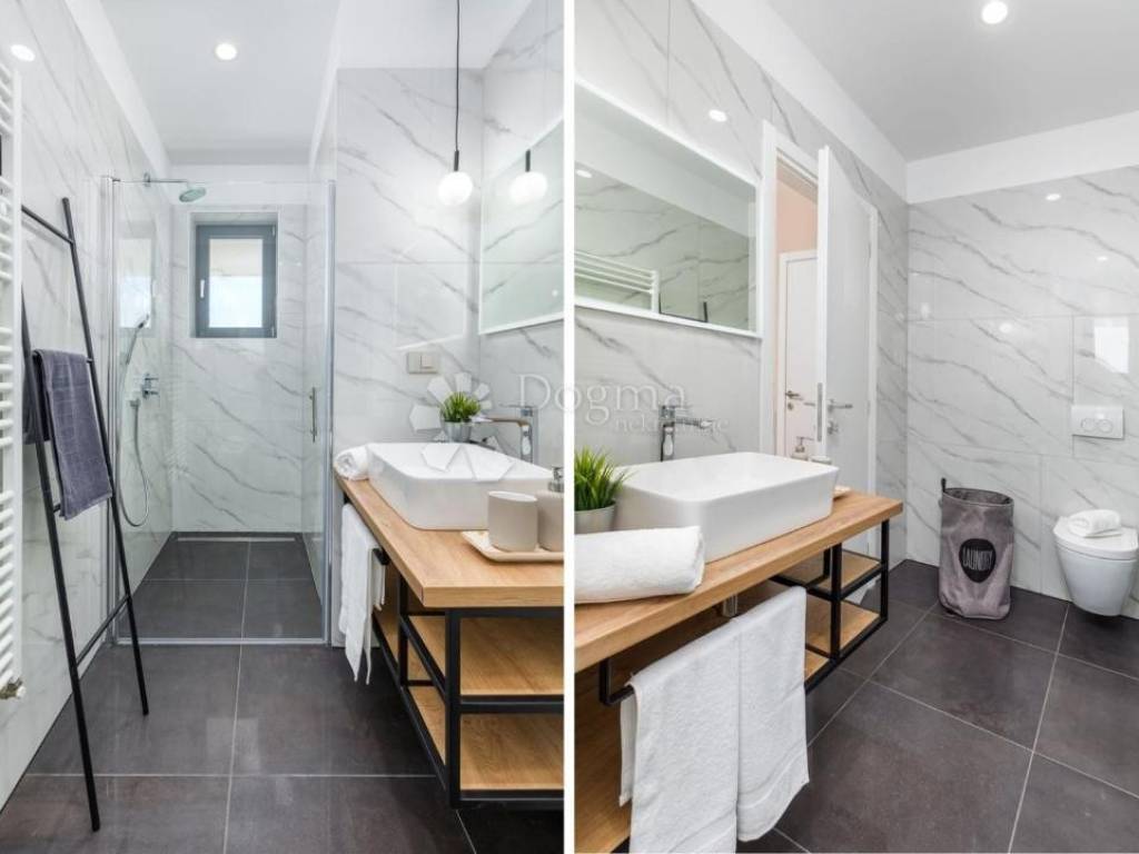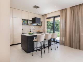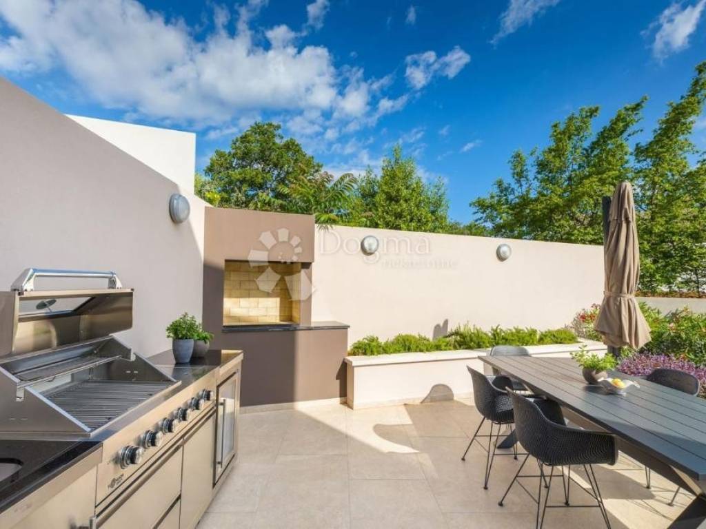 Exiting the villa leads you to a paved terrace and a multifunctional area with an outdoor living room, continuing to the sun deck and infinity pool. The yard is enriched with green lawns and autochthonous Istrian plants, and there is also a plan for an outdoor summer kitchen.