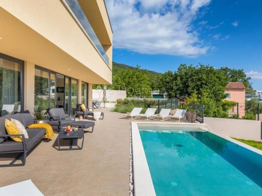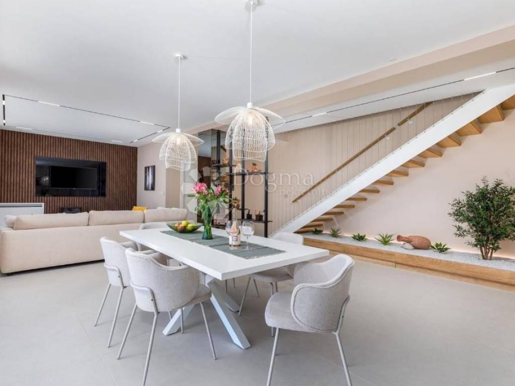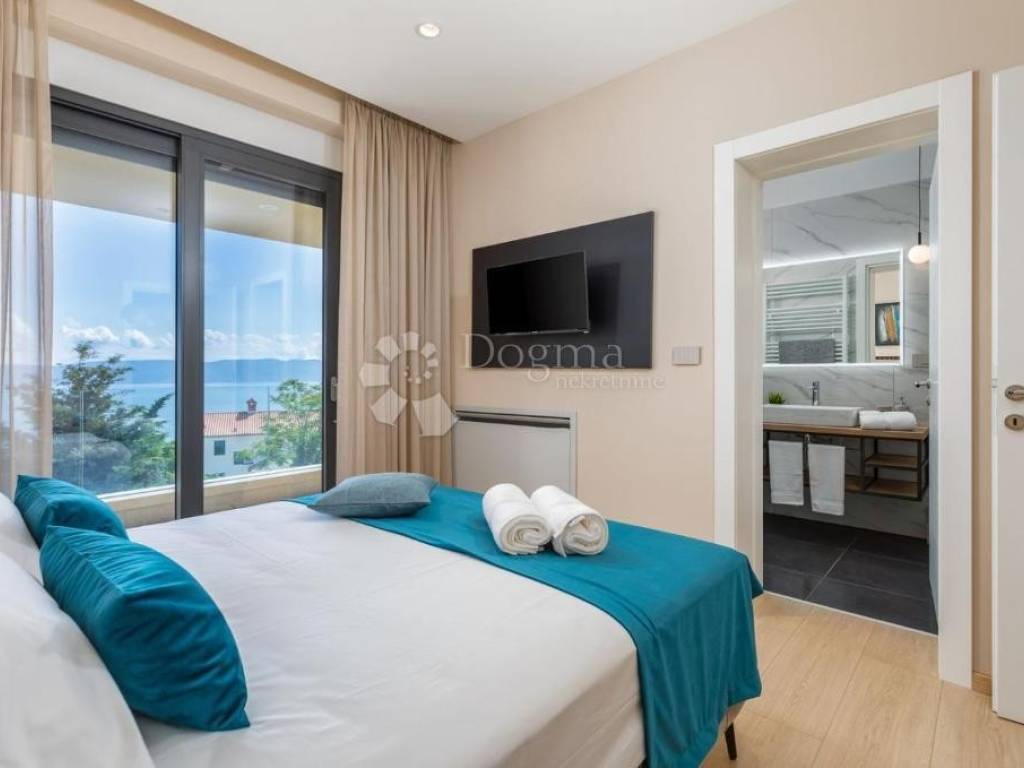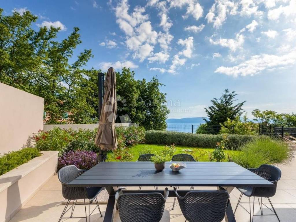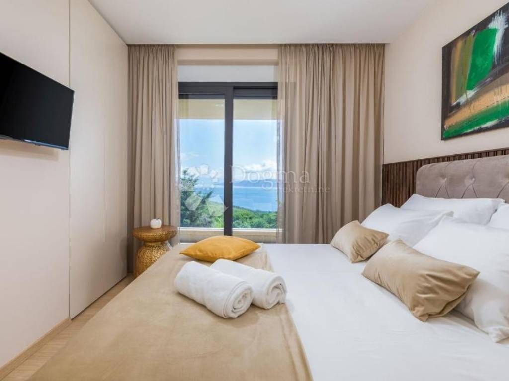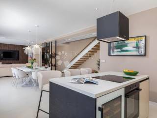 It is located in an ideal position with a timeless view of the sea, Kvarner, the islands of Cres, Lošinj and Rijeka. This stunning panoramic view dominates the space and is perfectly integrated into the design of the house. A glass rock runs along the facade, providing an incredible sense of connection with the environment, and extends through both floors, creating a spectacular frame for the natural beauty that surrounds it.