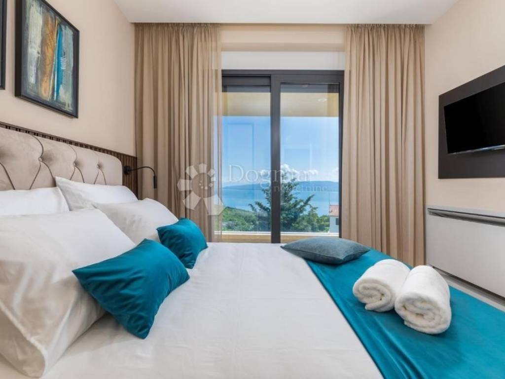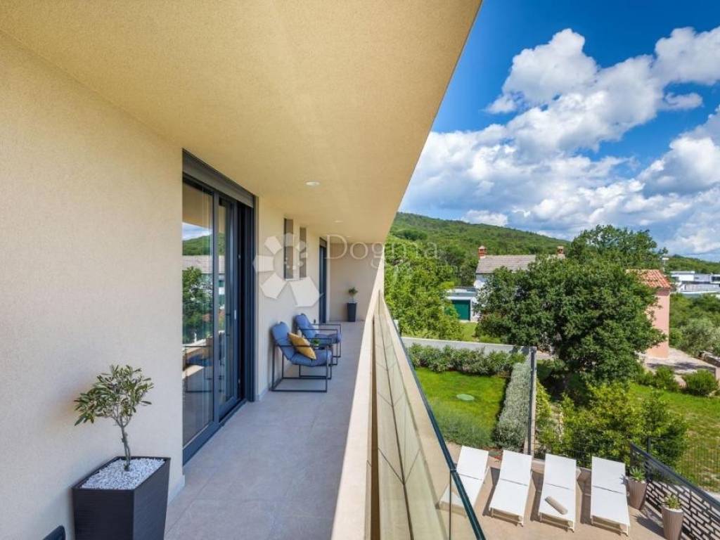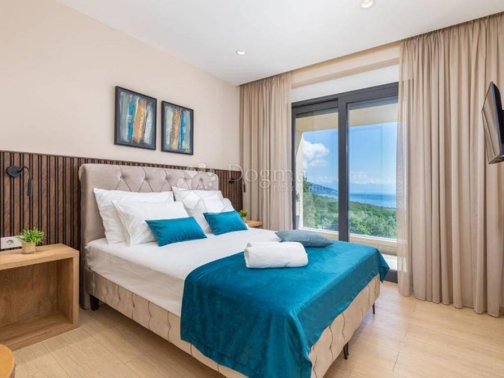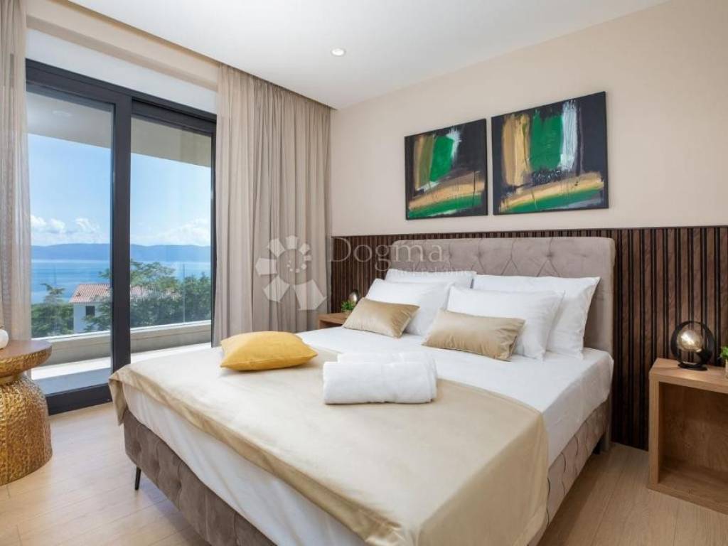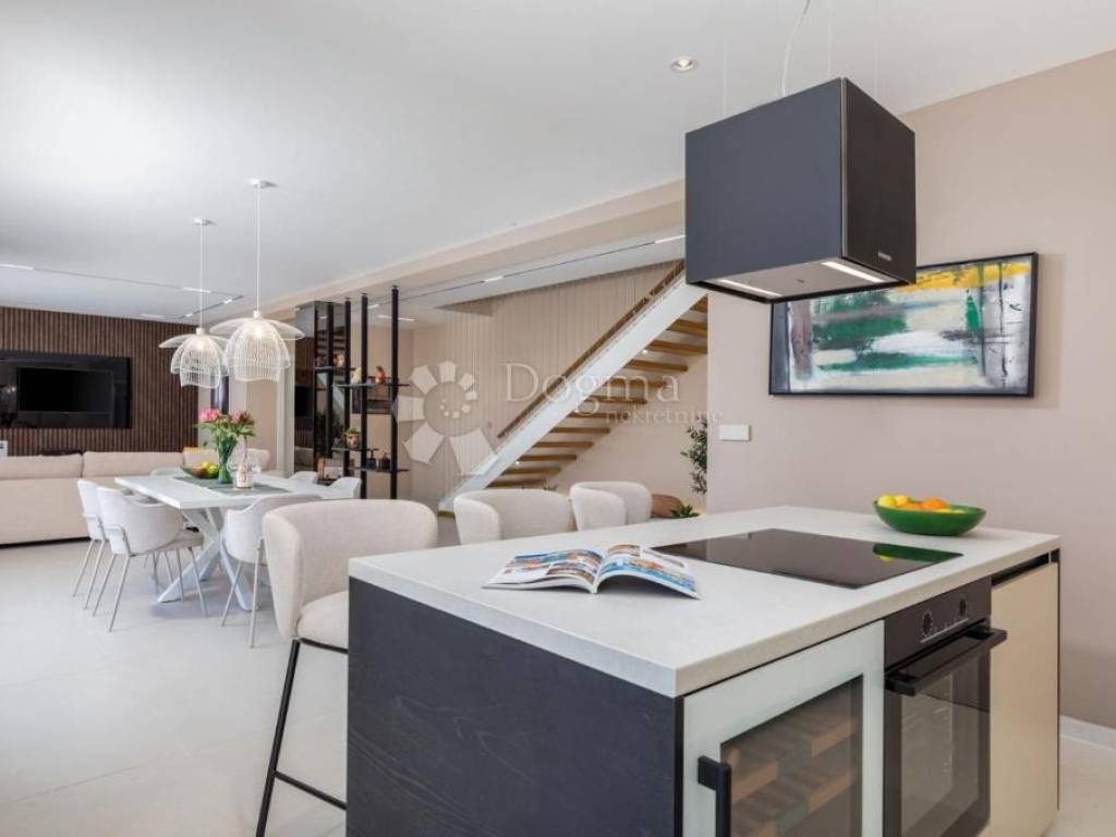 It is located in an ideal position with a timeless view of the sea, Kvarner, the islands of Cres, Lošinj and Rijeka. This stunning panoramic view dominates the space and is perfectly integrated into the design of the house. A glass rock runs along the facade, providing an incredible sense of connection with the environment, and extends through both floors, creating a spectacular frame for the natural beauty that surrounds it.