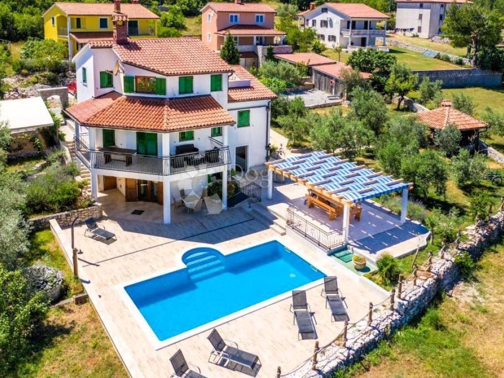 The house is equipped with a heating oil central heating system and air conditioners in the rooms. The yard is spacious and landscaped, with olive gardens and covered parking spaces.