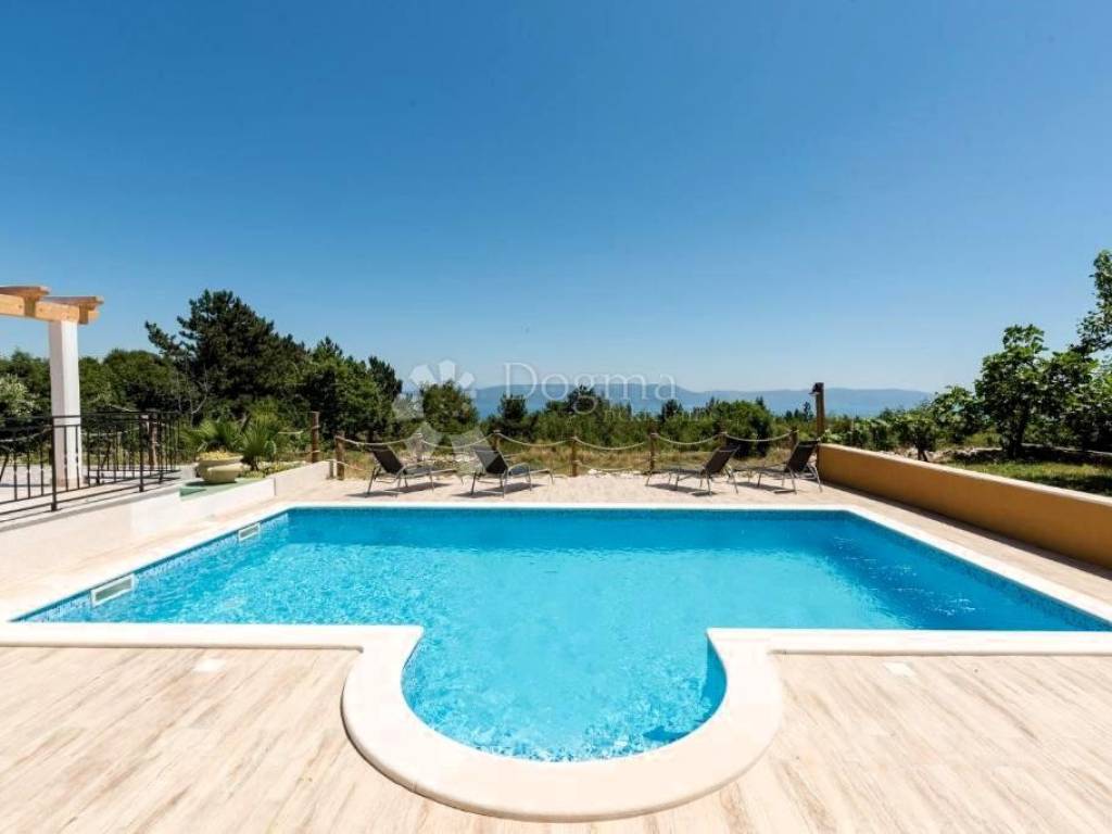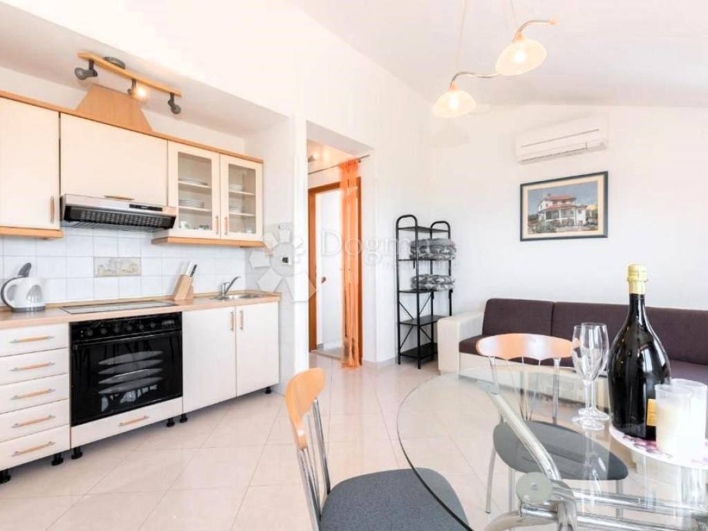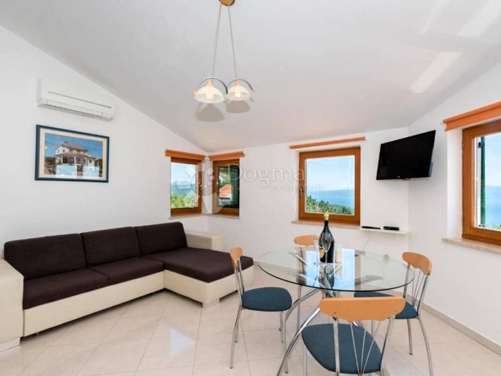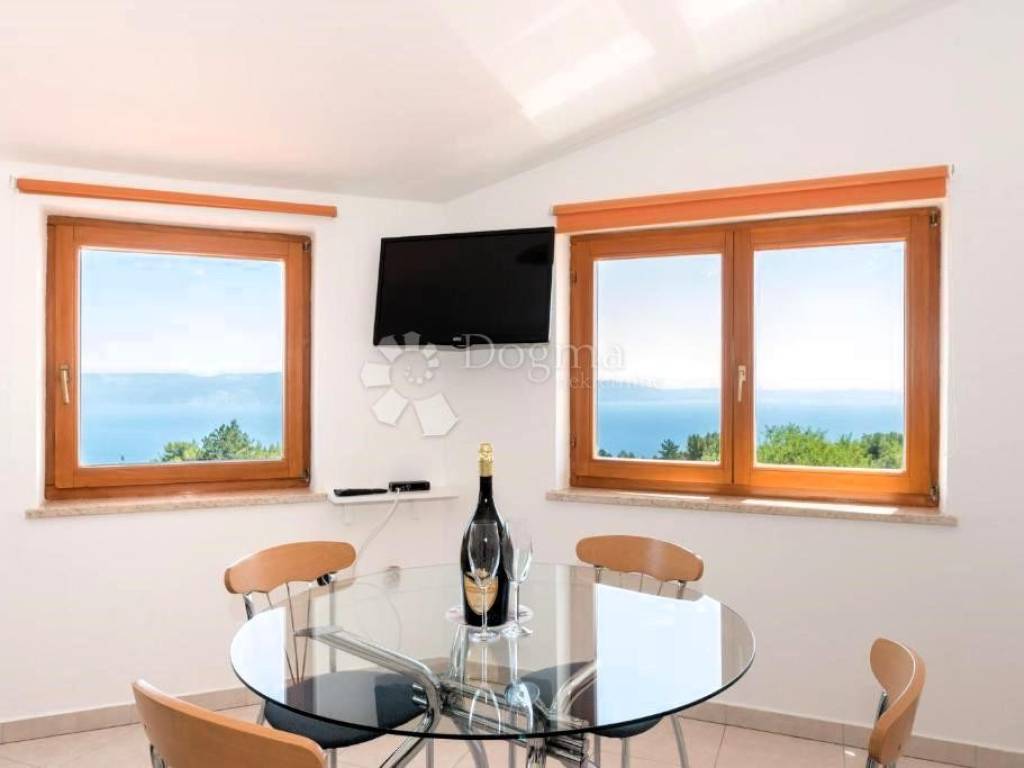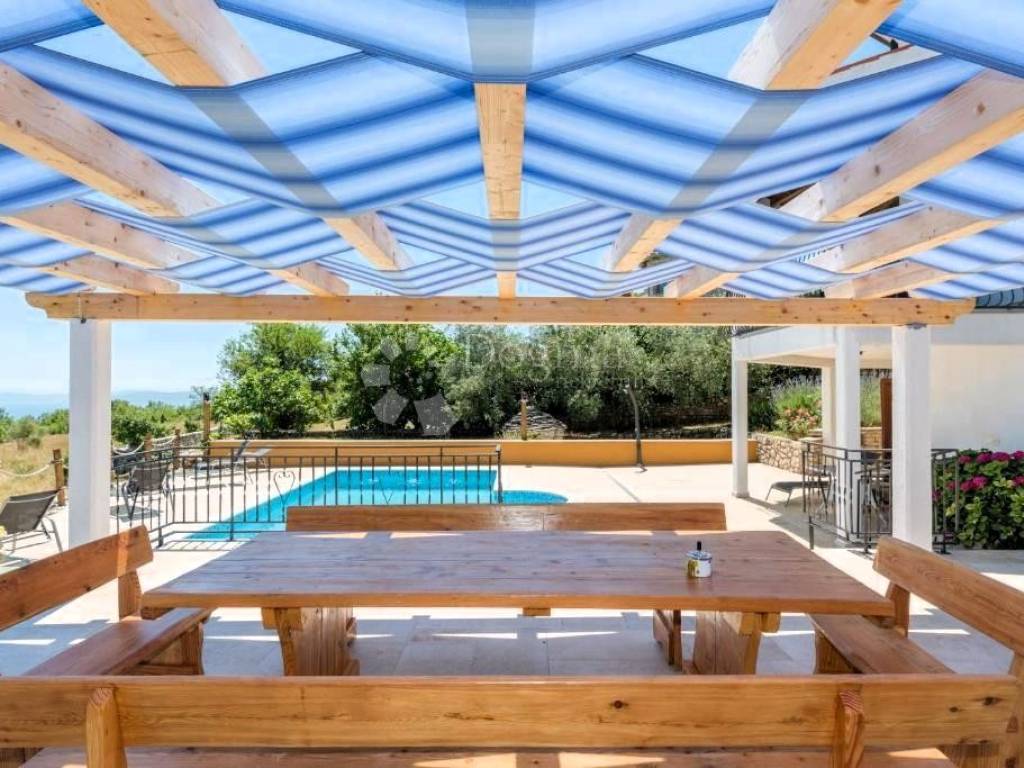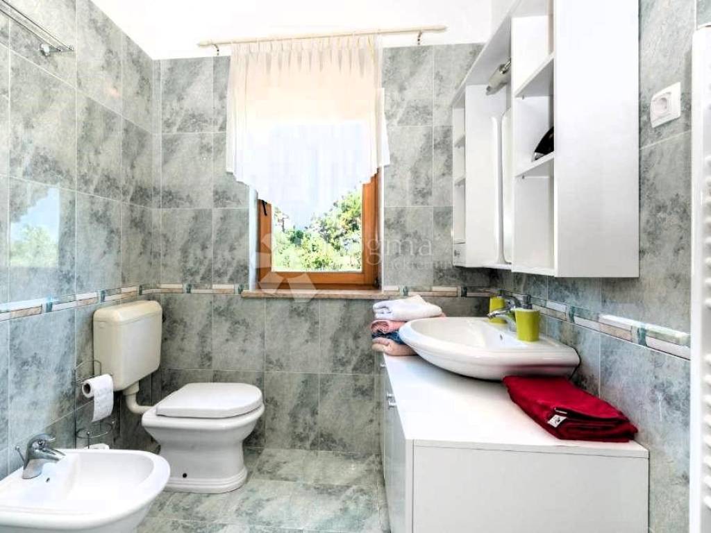 The ground floor includes an apartment consisting of an entrance hall, a kitchen with a dining room, a living room, two bedrooms, a bathroom, a storage room and a covered terrace with a view of the sea and the pool.