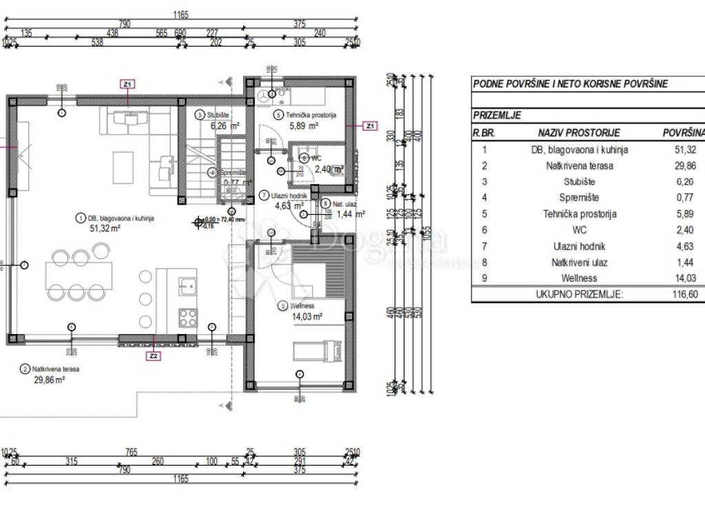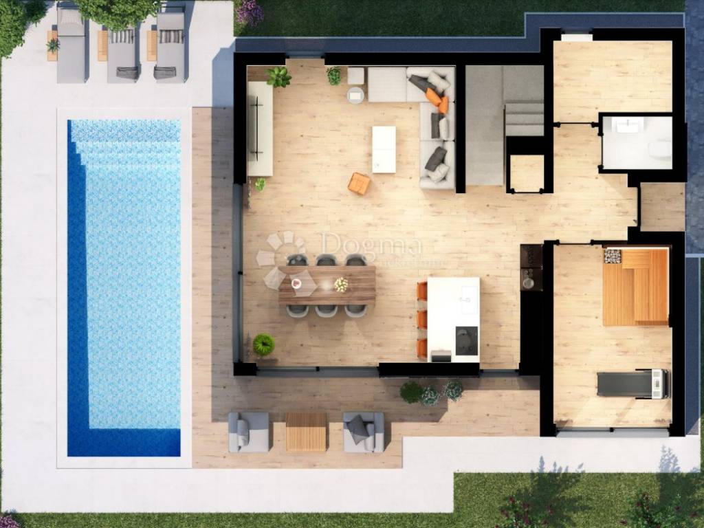 Upon entering the villa, your adventure begins and the development of a sense of comfort begins. The ground floor is designed as a living space for socializing, where there is a large open area of the kitchen, dining room and living area with access to the pool. On the ground floor there is also a wellness area, a guest toilet and a technical room.