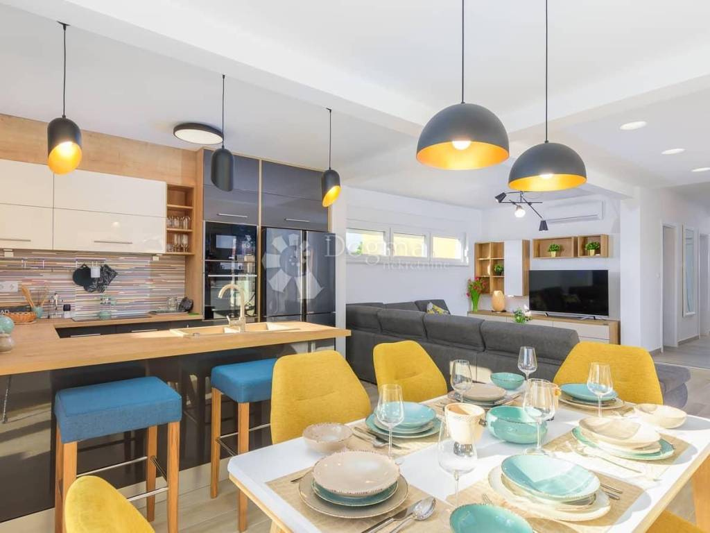 Prostirući se na površini od 170 m2, ova kuća nudi prostrane i udobne prostorije. Sadrži tri spavaće sobe, svaka s vlastitom kupaonicom, što osigurava privatnost i udobnost za goste. Tu je i zaseban toalet za dodatnu praktičnost. Kuhinja i blagovaonica su moderno uređene i mogu primiti do 8 gostiju, što je idealno za obiteljska okupljanja ili večere s prijateljima.