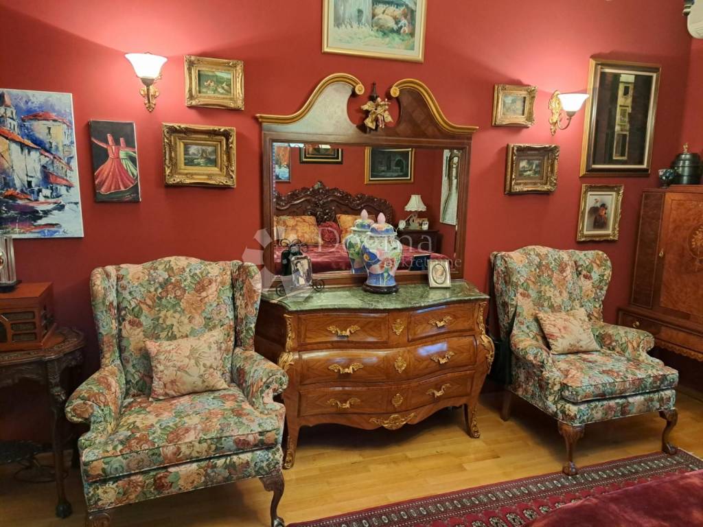 The dining room leads to a terrace that covers up to 55 m2. The terrace comes together with furniture along with a grill and gives a nice view of the city. An arranged purchase of antique furniture is also possible.