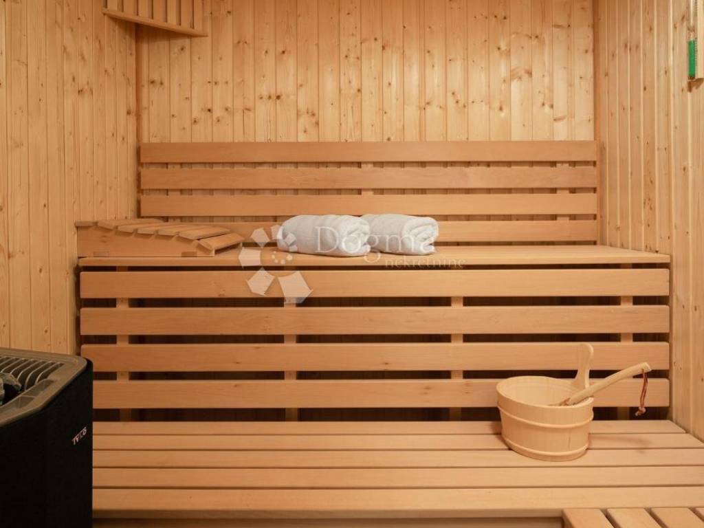 In the outer part of the building we find a large terrace (140 m2) lined with teak on which there is an infinity pool. The pool is 10m long and 1.45m deep, has a separate smaller and shallower part as a children's pool and in addition to the heating option has the option of additional water cooling.