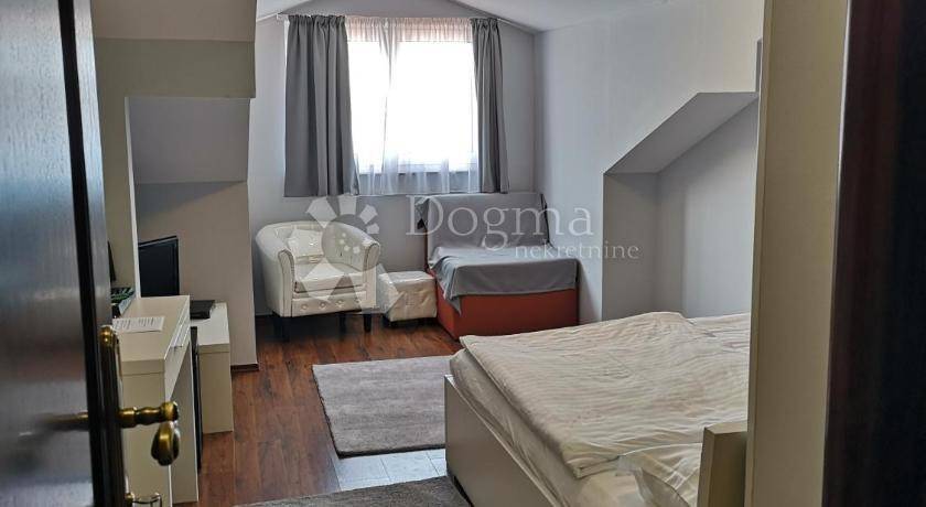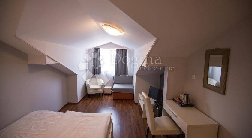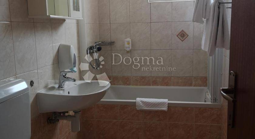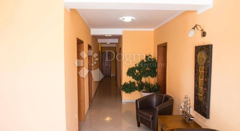 HOTEL - RESTORAN, PRVI RED DO MORA, na izuzetno dobro posjećenoj lokaciji. Objekt je kategoriziran a 4 zvjezdice, i ima kapacitet od 28 ležaja, i restoran od 50 mjesta u unutar objekta, i 100 sjedećih mjesta na terasi, odmah uz samo more. Sve sobe imaju pogled na more, a jedinstvena pozicija dozvoljava gostu da, jednom parkiran auto, ne miče, do kraja svog ljetovanja. U prizemlju se nalazi restoran, bar, prijemni pult, i lijepi hol, iz kojeg se ide na kat, na kojem su 7 soba s kupaonama i balkonima. Isti je raspored i na drugom katu, a na zadnjem je katu prostran, dvosoban stan sa dnevnim boravkom. Objekt je uvijek dobivao visoke ocjene, i u naravi se prodaje uhodani posao, dobro uhodana firma, i kompletan inventar.