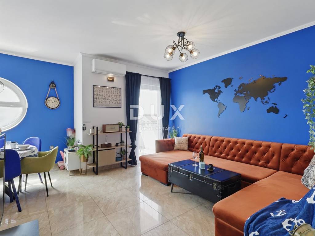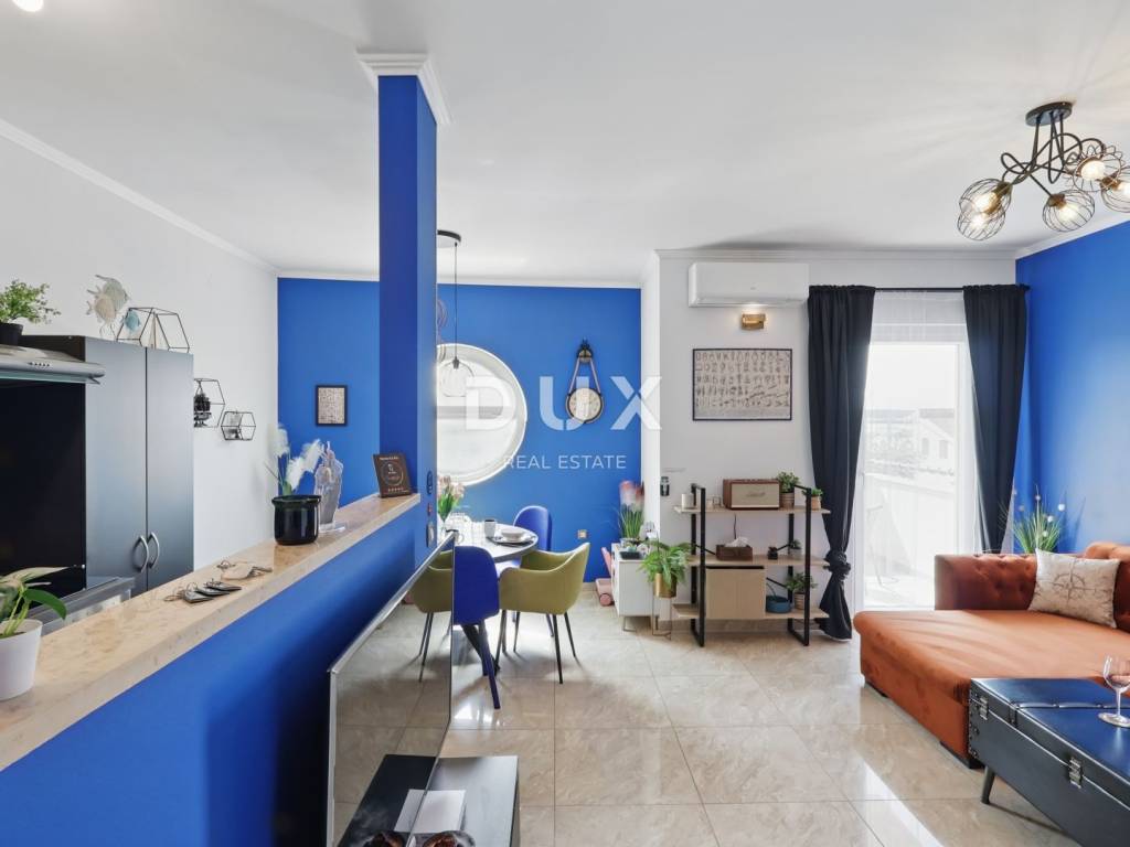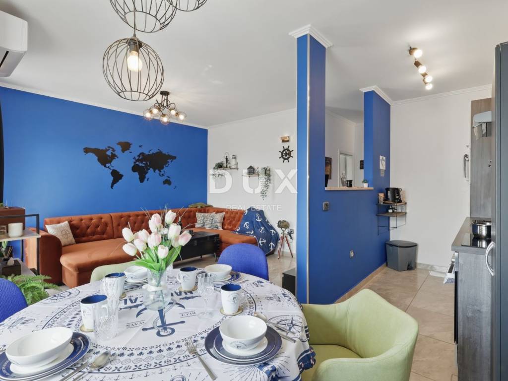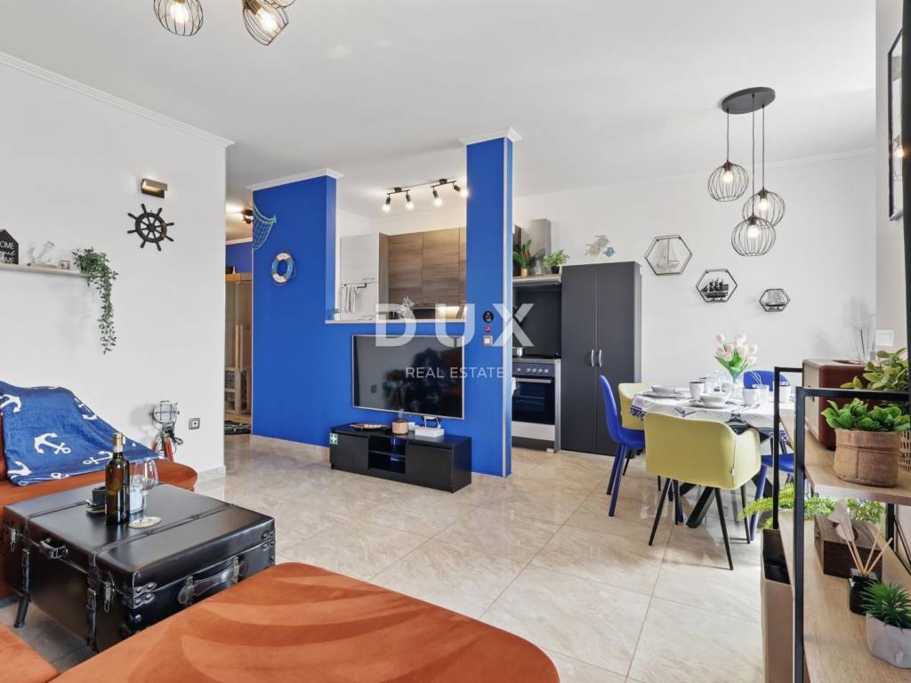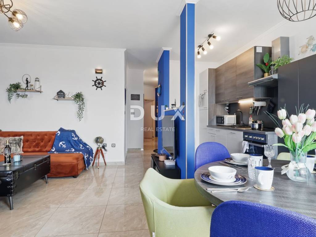 DESCRIPTION OF THE APARTMENT: The apartment thus consists of a total living area of 71.80 m2, it has an ideal layout that makes staying in the apartment simple and functional. At the entrance to the apartment is a spacious lobby with space for a wardrobe, which also leads us into the living area of the apartment designed according to the "open space" concept of space without partition walls. A spacious and comfortable living room is located here, which has direct communication with a covered balcony, from which stretches a wonderful view of the sea and the surrounding area. Next to the living room, there is a dining room sufficient for the whole family, as well as a partially separated, modern and equipped kitchen ideal for preparing your favorite delicacies. Slightly separated are two spacious bedrooms, one of which has its own covered terrace hidden from view, ideal for drinking morning coffee or an evening glass of wine. The apartment also has a spacious bathroom with a shower cabin. ADDITIONAL INFORMATION: * The apartment has a private parking space in the courtyard of the building, which can only be used by the tenants of the building. * The apartment is sold fully furnished with all household appliances and furniture. * The apartment has an air conditioner that is used for heating and cooling, as well as a chimney with the possibility of installing a pellet or wood stove. * New interior and exterior PVC joinery was installed. * Owners of apartments in this building have the right to use the common pool and landscaped yard with an outdoor grill. * The building has an organized system of regular maintenance of the building's garden and swimming pool. * The property is in order, 1/1 owner, no encumbrances, the building has all the necessary documentation, the possibility of buying on credit.