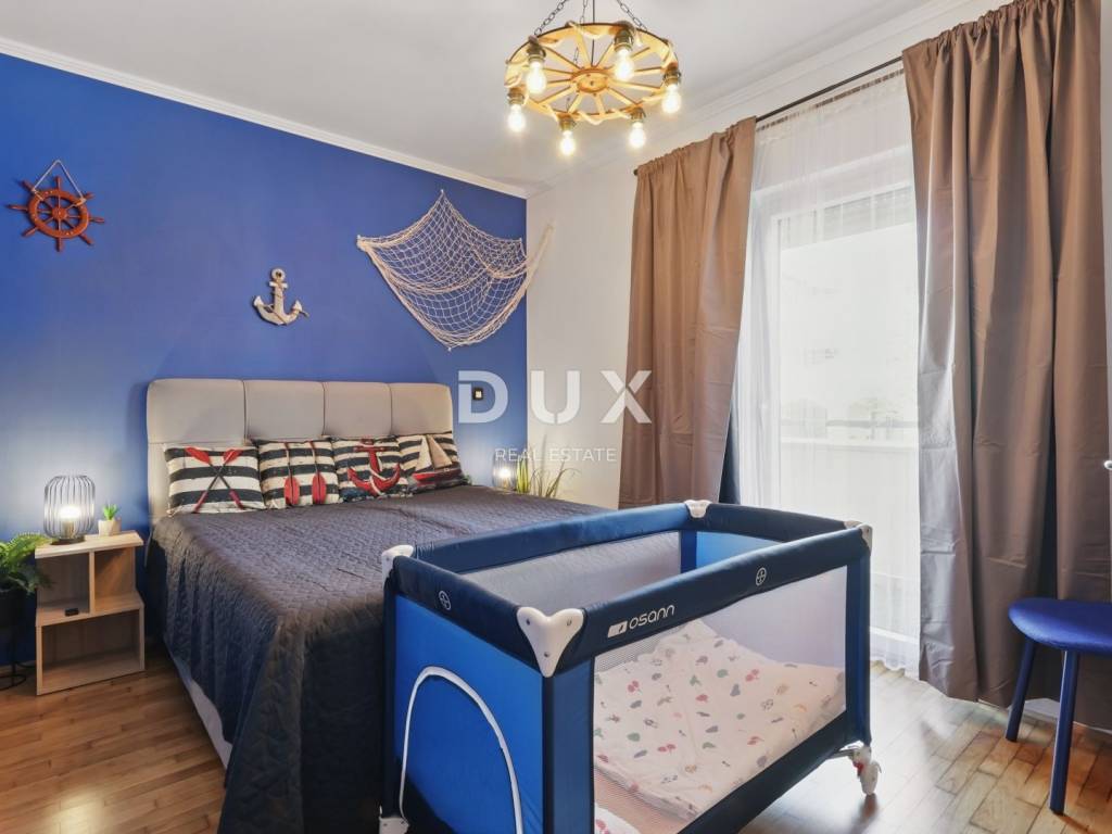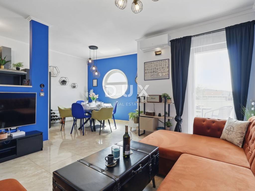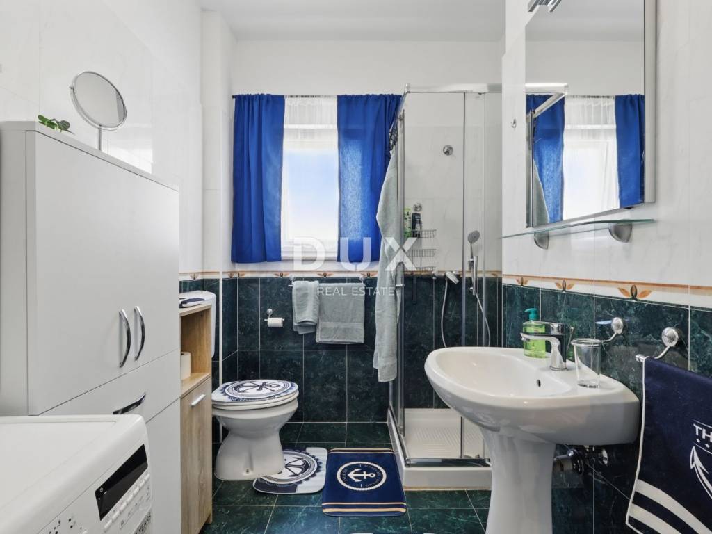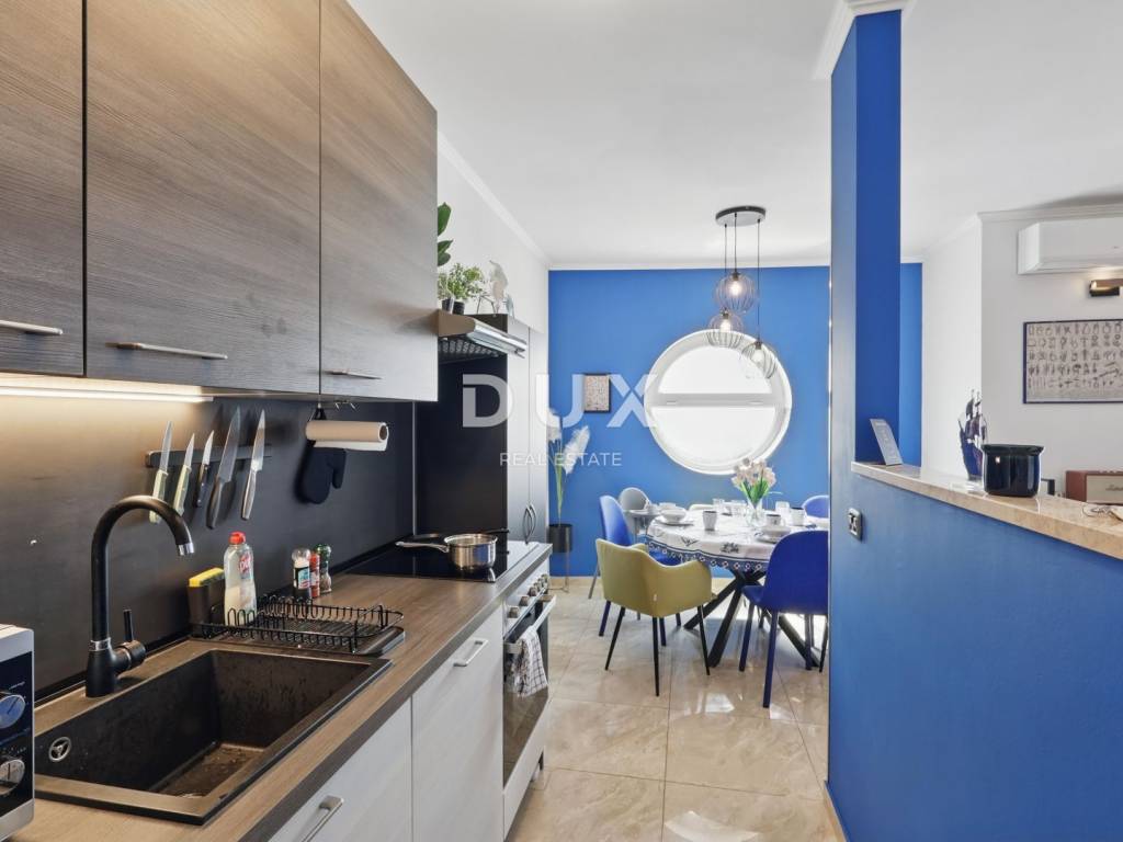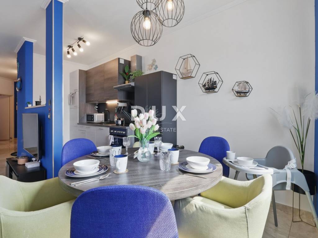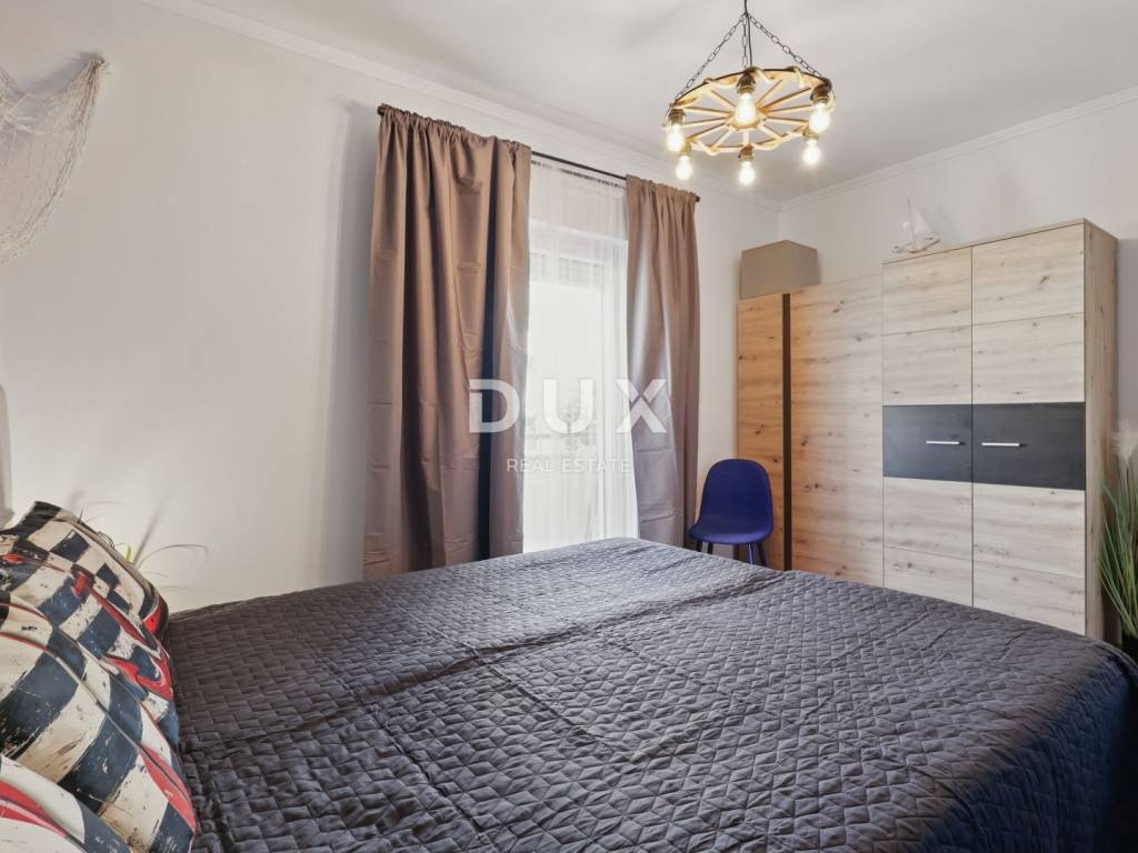 DESCRIPTION OF THE APARTMENT: The apartment thus consists of a total living area of 71.80 m2, it has an ideal layout that makes staying in the apartment simple and functional. At the entrance to the apartment is a spacious lobby with space for a wardrobe, which also leads us into the living area of the apartment designed according to the "open space" concept of space without partition walls. A spacious and comfortable living room is located here, which has direct communication with a covered balcony, from which stretches a wonderful view of the sea and the surrounding area. Next to the living room, there is a dining room sufficient for the whole family, as well as a partially separated, modern and equipped kitchen ideal for preparing your favorite delicacies. Slightly separated are two spacious bedrooms, one of which has its own covered terrace hidden from view, ideal for drinking morning coffee or an evening glass of wine. The apartment also has a spacious bathroom with a shower cabin. ADDITIONAL INFORMATION: * The apartment has a private parking space in the courtyard of the building, which can only be used by the tenants of the building. * The apartment is sold fully furnished with all household appliances and furniture. * The apartment has an air conditioner that is used for heating and cooling, as well as a chimney with the possibility of installing a pellet or wood stove. * New interior and exterior PVC joinery was installed. * Owners of apartments in this building have the right to use the common pool and landscaped yard with an outdoor grill. * The building has an organized system of regular maintenance of the building's garden and swimming pool. * The property is in order, 1/1 owner, no encumbrances, the building has all the necessary documentation, the possibility of buying on credit.