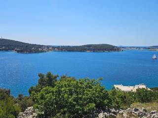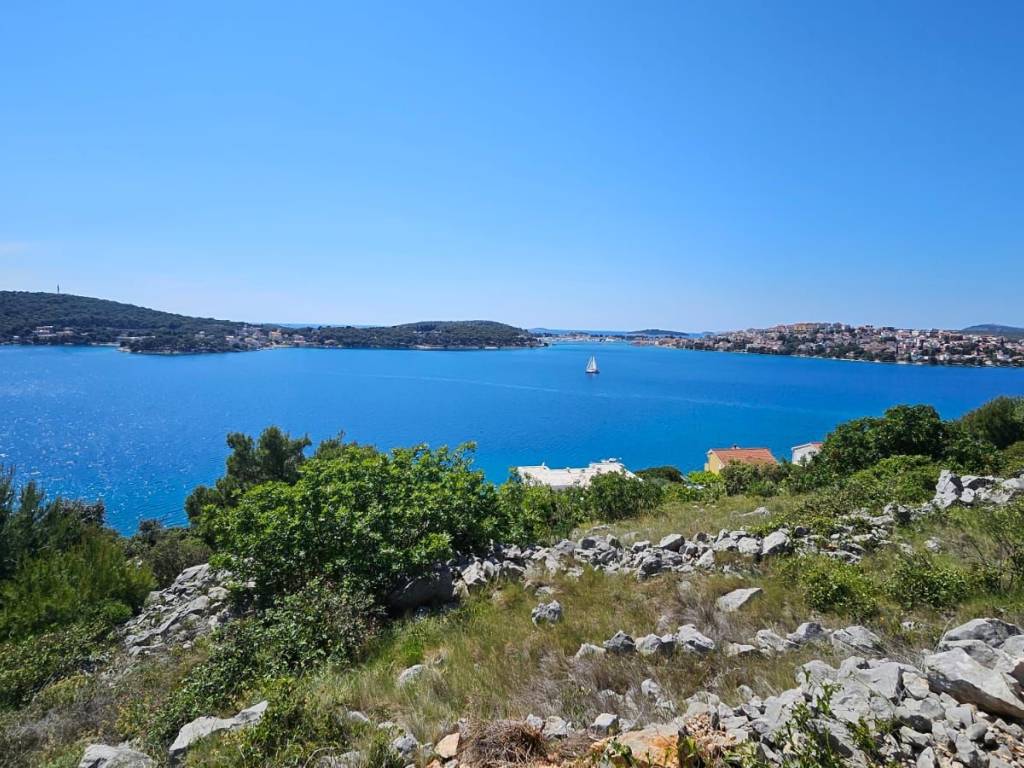 Ovo građevinsko zemljište površine 917 m² nalazi se u drugom redu do mora, na mirnoj lokaciji, na rubu lokalnog razvojnog područja. Već postoji odobreni projekt za izgradnju vile s infinity bazenom od 27 m² i 255 m² stambenog prostora, raspoređenog na tri kata s dodatnih 180 m² djelomično natkrivenih balkona i terasa. Planovi uključuju tri velike spavaće sobe s garderobama i vlastitim kupaonicama, radnu sobu, teretanu, dnevni boravak, kuhinju, blagovaonicu, nekoliko ostava, praonicu rublja i gostinjski WC. Također će imati i dvostruku garažu od 34 m² i dva vanjska parkirna mjesta. Spremnik vode od 75 m³ osigurava vodu za kuću. Parcela se nalazi nasuprot poznate luke "Marina Frapa Rogoznica". Nudi nesmetan panoramski pogled na more iz prizemlja i terase, zahvaljujući strmoj padini i činjenici da je kuća novoizgrađena kuća u prvom redu. Privatno betonsko stubište vodi do mora, gdje čak i tijekom sezone ima malo turista. Prilaz je dostupan, ali će ga trebati izgraditi tijekom građevinskih radova na vili. Općina je već dala dozvolu za to. Nekretnina je okrenuta prema zapadu. Udaljenosti: More: 70 m - Bar na plaži: 700 m - Supermarket: 5 km - Trogir: 25 km - Zračna luka Split: 32 km.Postoji mogućnost kupnje susjedne parcele iste veličine s istim projektom. Cijena za obje parcele je 765.000 €.