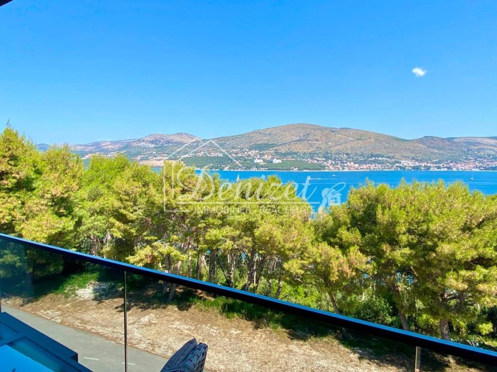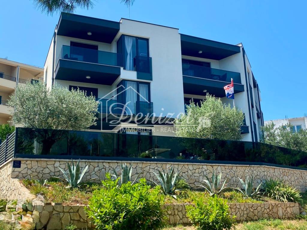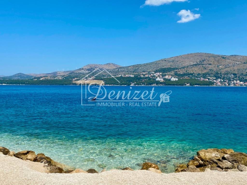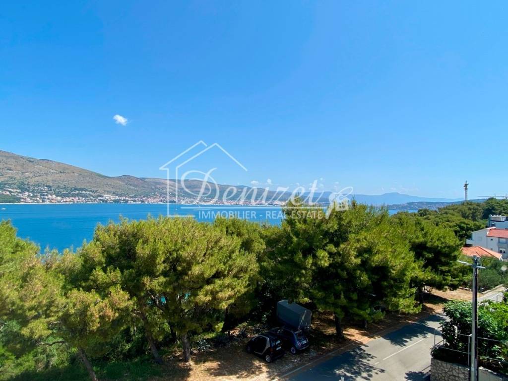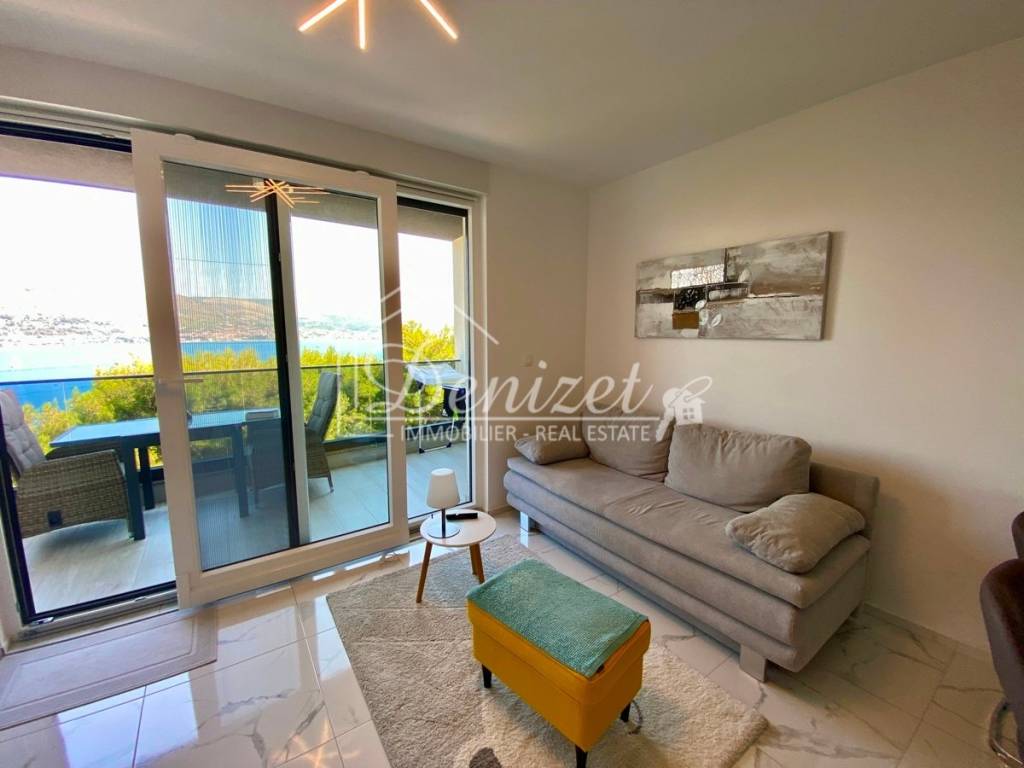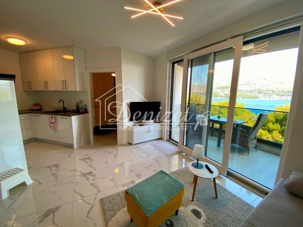 This one-bedroom apartment is located on the second (last) floor of a building with a total of nine residential units. The building was built in 2021 and is just 100 meters from the sea. A path leads through a small pine forest down to the beach, where you can find a shady spot under the pine trees by the turquoise sea even in midsummer.The 38 m² living space includes a kitchen with a dining area, a living room, and an entrance hall. There is also a 10 m² bedroom with plenty of storage space in the custom-made built-in wardrobes and a 4 m² bathroom. A large sliding door leads to the 8 m² covered loggia with stunning views of the sea and the mountains. Due to the building's exceptional location directly behind a pine forest, which is not a development zone, the fabulous view will stay for the near future.The apartment is equipped with air conditioning, underfloor heating, electric shutters, fly screens, and a fitted kitchen. Since it was previously used as a private holiday home for only a few weeks each year and was never rented out, it is in mint condition. The high-quality, custom-made furniture is included in the purchase price. The house itself is also of high quality, boasts a beautiful natural stone facade, and is in very good condition. A caretaker service takes care of cleaning the stairwell, fire protection, the underground garage, and the outdoor area.A 12 m² parking space in the underground garage is also included in the price.The village of Okrug Donji is located on the west side of the island of Ciovo and is ideal for those seeking a relaxing holiday off the beaten track. The village has a supermarket, two restaurants, a small harbor, and several cafes.The apartment faces north. It is 8 km from Trogir, 14 km from Split Airport, and 100 m from the beach.