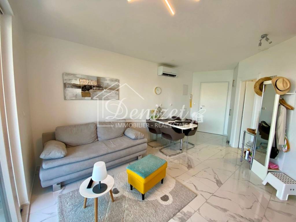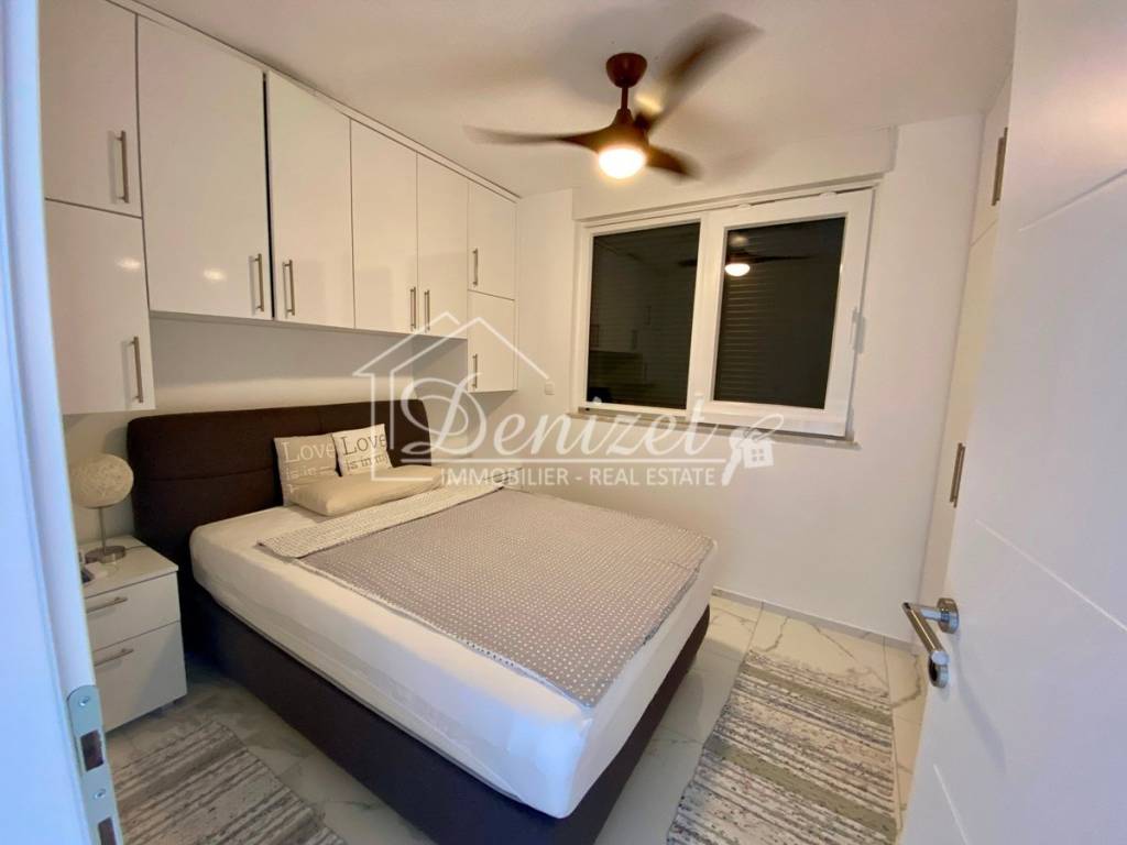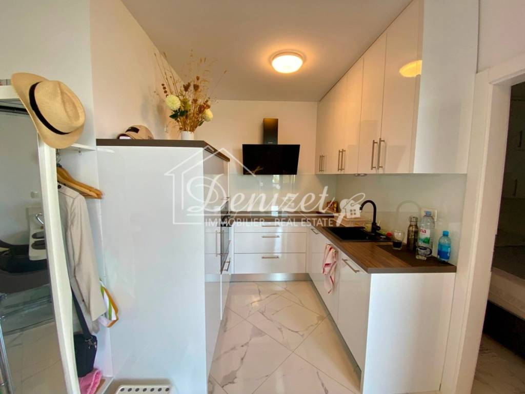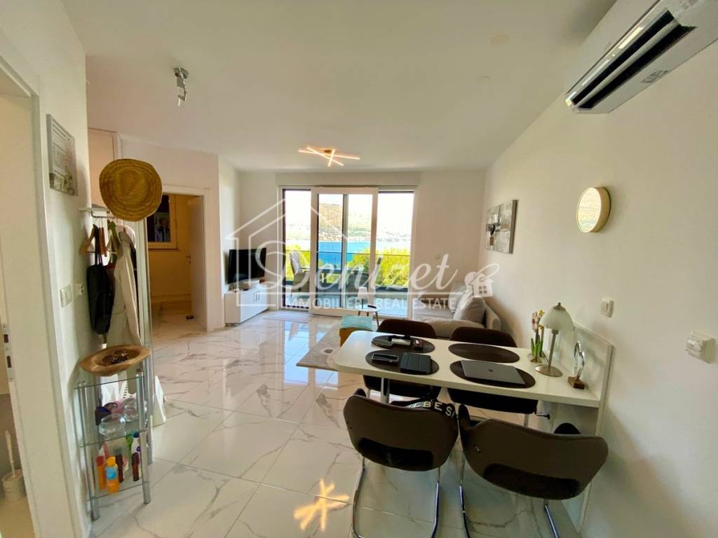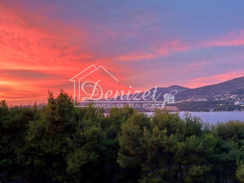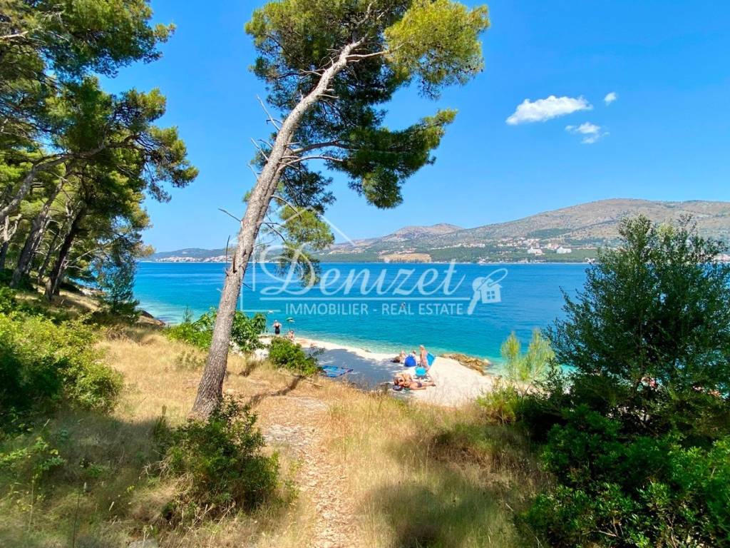 This one-bedroom apartment is located on the second (last) floor of a building with a total of nine residential units. The building was built in 2021 and is just 100 meters from the sea. A path leads through a small pine forest down to the beach, where you can find a shady spot under the pine trees by the turquoise sea even in midsummer.The 38 m² living space includes a kitchen with a dining area, a living room, and an entrance hall. There is also a 10 m² bedroom with plenty of storage space in the custom-made built-in wardrobes and a 4 m² bathroom. A large sliding door leads to the 8 m² covered loggia with stunning views of the sea and the mountains. Due to the building's exceptional location directly behind a pine forest, which is not a development zone, the fabulous view will stay for the near future.The apartment is equipped with air conditioning, underfloor heating, electric shutters, fly screens, and a fitted kitchen. Since it was previously used as a private holiday home for only a few weeks each year and was never rented out, it is in mint condition. The high-quality, custom-made furniture is included in the purchase price. The house itself is also of high quality, boasts a beautiful natural stone facade, and is in very good condition. A caretaker service takes care of cleaning the stairwell, fire protection, the underground garage, and the outdoor area.A 12 m² parking space in the underground garage is also included in the price.The village of Okrug Donji is located on the west side of the island of Ciovo and is ideal for those seeking a relaxing holiday off the beaten track. The village has a supermarket, two restaurants, a small harbor, and several cafes.The apartment faces north. It is 8 km from Trogir, 14 km from Split Airport, and 100 m from the beach.