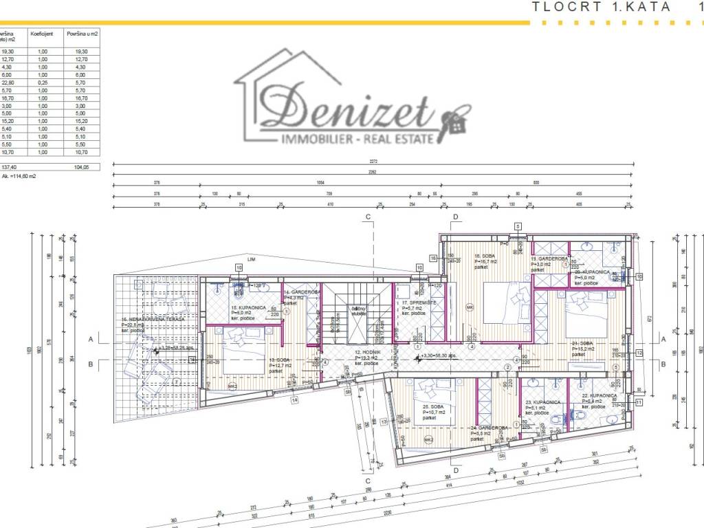 An internal staircase leads to the first floor, which contains of four bedrooms, each with its own bathroom and walk-in wardrobe, as well as a storage room and hallway. The master bedroom has access to a spacious pergola-covered terrace of 22.8 m².
