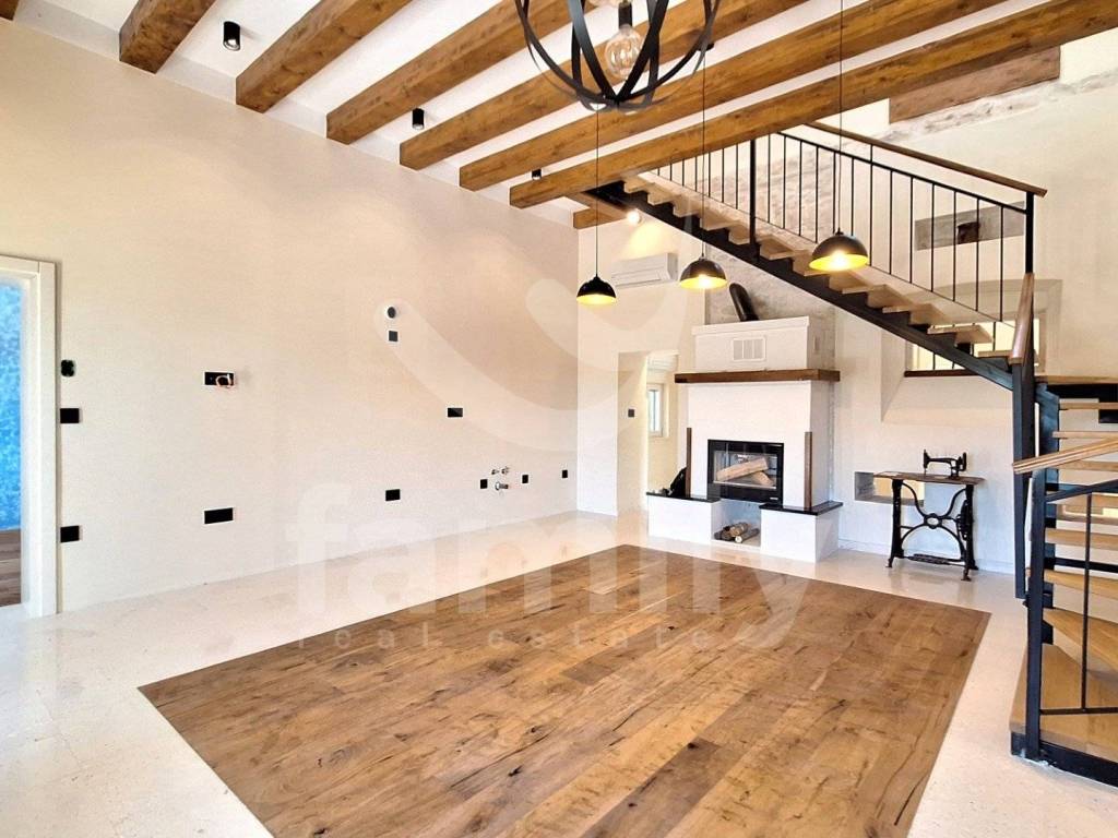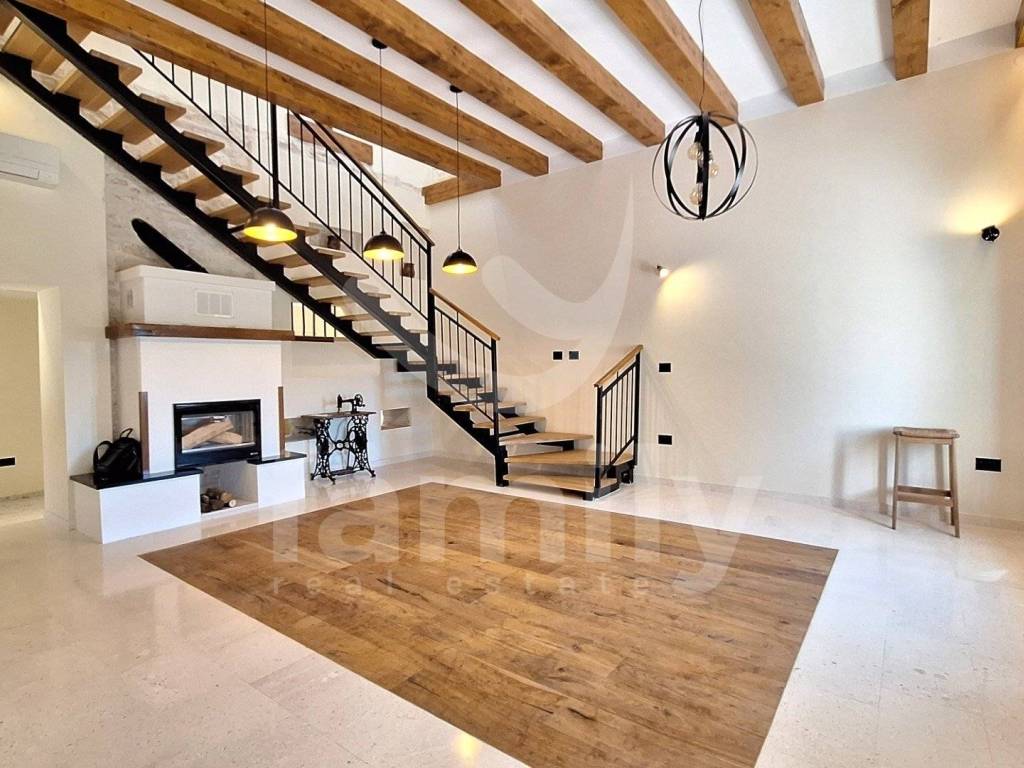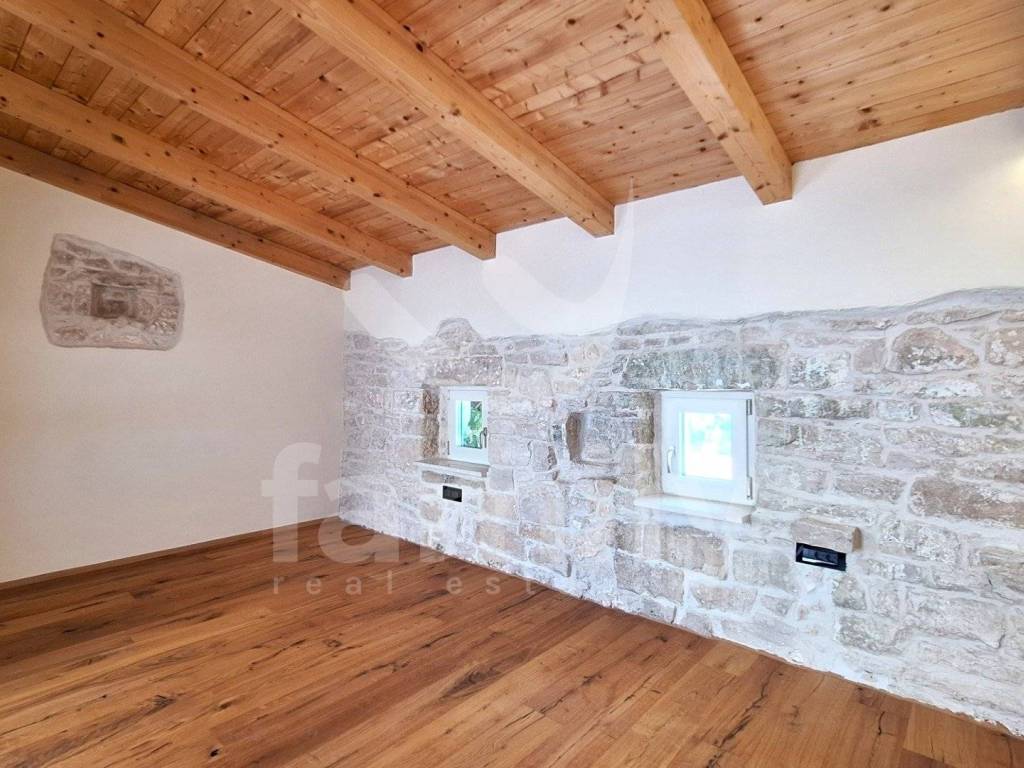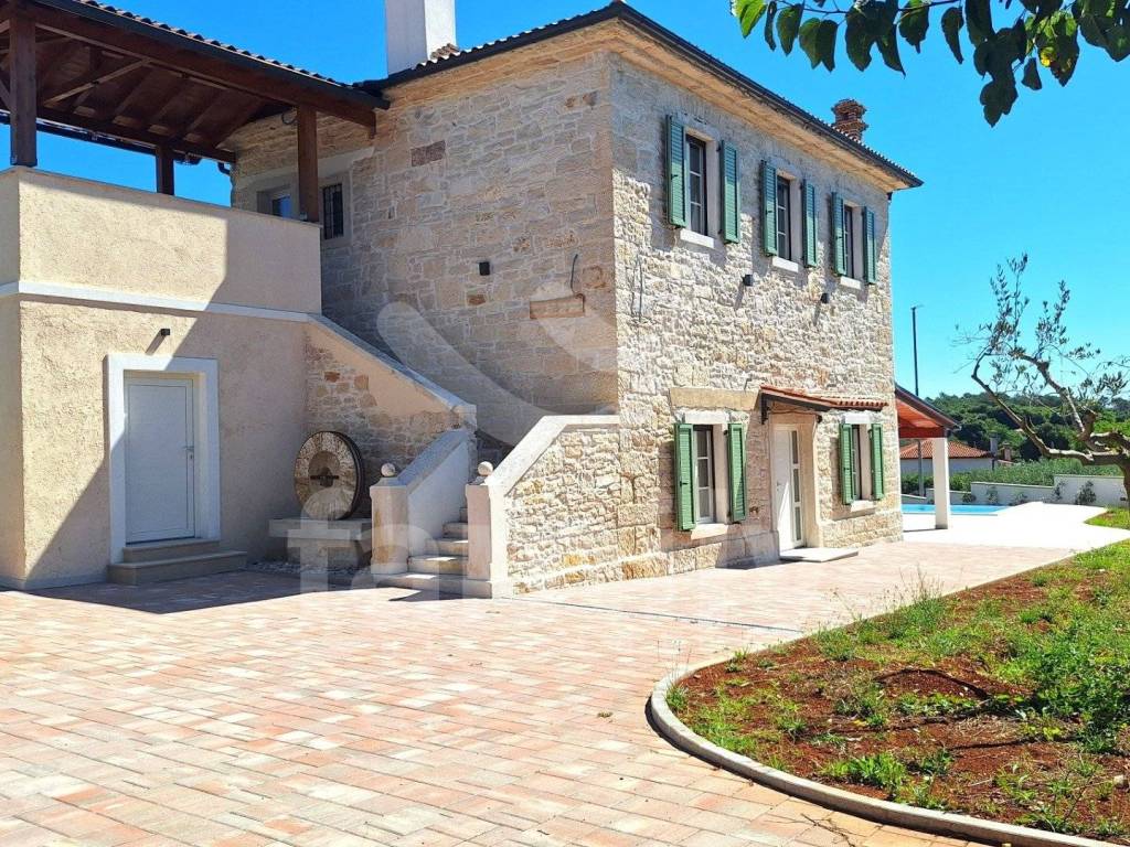 This economical, high-quality, unique stone villa with an area of 230 m2 on a plot of approximately 1100 m2 and a separate building plot of 800 m2 is located in Barban. The house was completely renovated this year and extends over two floors, ground floor and first floor. On the ground floor of this rare property there are two bedrooms in Istrian style, each with its own bathroom, a spacious living room with kitchen and dining room, and rooms that can serve the future owner as a tavern, wellness and gym, from which there is a view of the exterior of the property and the swimming pool, while next to the tavern there is a toilet with a laundry area. On the first floor there are two more bedrooms also with their own bathrooms and an extremely spacious covered terrace. Each bedroom and each bathroom is different from each other, with each retaining the Istrian flair and modern rustic style with stone and wooden cladding and wall tiles. The floor in the living room is covered with stone and wood, while the bedrooms have parquet flooring, which all goes well with the ambiance and stone. The heating and cooling system throughout the house is regulated by six indoor and outdoor air conditioning units, an indoor fireplace in the living room and underfloor heating installed throughout the property. The high-quality white PVC joinery is custom-made and three-layered with nine gas chambers and green external shutters. The boiler room on the ground floor of the property serves as a heat pump underfloor heating system, and the boiler room also leads to the basement, which can be used for various purposes by future owners. The exterior of the property is adorned with a spacious sundeck with a heated pool and outdoor shower, and a covered terrace with a fireplace and sink for complete relaxation and enjoyment during your stay outdoors. The yard is partially covered with greenery with planted olive trees and is carefully maintained, and partially covered with paving stones and 5 uncovered parking spaces are provided. The location is excellent in terms of proximity to the town center at only 200 meters, and yet in a quiet location and close to all the supporting facilities necessary for everyday life. A big plus is the building land next to the property and the possibility of additional construction.