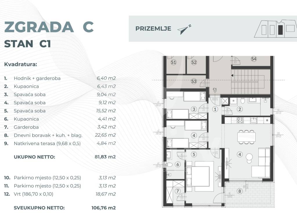 In Fažana, in an excellent location, near the center of Fažana and the first well-maintained beaches, the construction of four buildings with a total of 23 residential units will soon begin, and the construction itself will be of top quality, luxurious and unique by a proven investor. This high-quality and modern apartment will be located on the ground floor of the building, with an area of 106.76 m2 with two covered parking spaces and will consist of a hallway with a wardrobe, three bedrooms, two bathrooms, a spacious and bright living room, kitchen and dining room. The apartment will also have a part of the garden of 18.76 m2 and a communal swimming pool of 85 m2 is planned as part of the project. All buildings have anti-burglary entrance doors with high sound insulation and increased fire resistance, underfloor heating in the bathrooms with the possibility of paying extra for other rooms, three-layer French-type PVC carpentry on all external openings with blinds and mosquito nets, as well as high-quality ceramic tiles throughout the building with the option of choosing materials according to your own preferences. The heating and cooling system will also be regulated through the air conditioning unit.