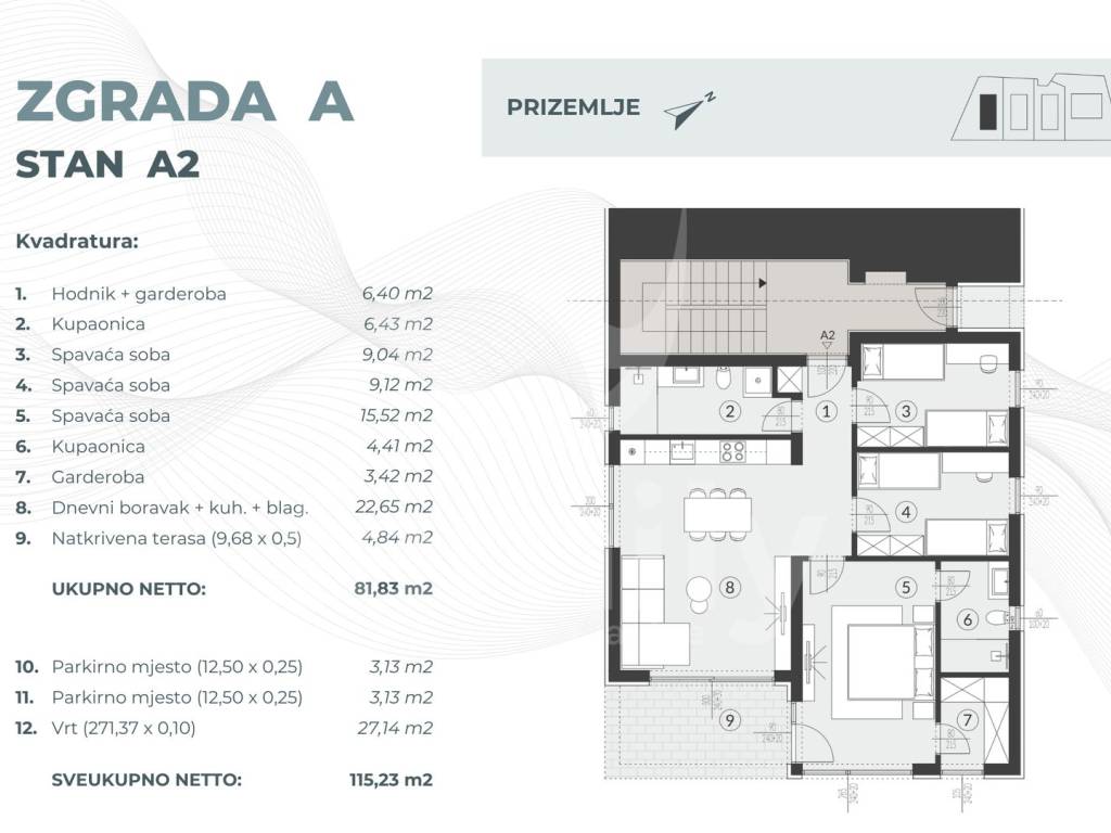 In Fažana, in an excellent location, near the center of Fažana and the first well-maintained beaches, the construction of four buildings with a total of 23 residential units will soon begin, and the construction itself will be of top quality, luxurious and unique by a proven investor. This high-quality and modern apartment will be located on the ground floor of the building, with an area of 115.23 m2 with two covered parking spaces and will consist of a hallway with a wardrobe, three bright bedrooms, two bathrooms, a spacious living room, kitchen and dining room. The apartment will also have a part of the garden of 27.14 m2 and a shared swimming pool of 85 m2 is planned as part of the project. All buildings have anti-burglary entrance doors with high sound insulation and increased fire resistance, underfloor heating in the bathrooms with the possibility of paying extra for other rooms, three-layer French-type PVC carpentry on all external openings with blinds and mosquito nets, as well as high-quality ceramic tiles throughout the building with the option of choosing materials according to your own preferences. The heating and cooling system will also be regulated through the air conditioning unit.