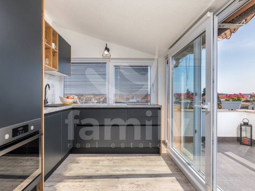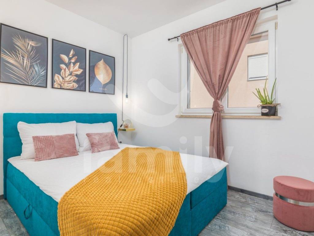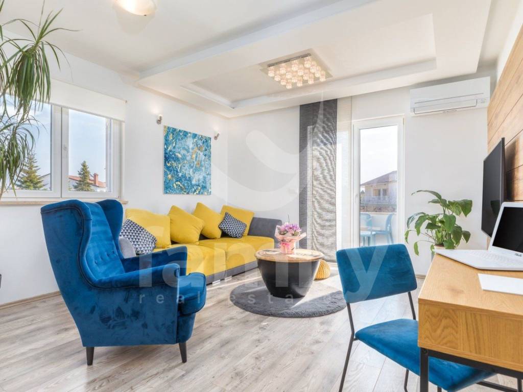 This beautiful apartment is located on the first floor of a small residential building and has an area of 80 m2. On the first floor of the apartment there is a hallway, a pleasant, bright living room, a kitchen, a dining room, a storage room, and a spacious terrace, while on the second floor there is a sleeping area in the form of two bedrooms, a bathroom and also a spacious terrace. This beautiful apartment is equipped with PVC joinery, while the heating and cooling system is regulated by an air conditioning unit, and the entire apartment is equipped with beautiful modern furniture in bright colors. The apartment has a parking space. The location of the property is truly exceptional in terms of the proximity of all the amenities necessary for everyday life such as shops, schools, kindergartens, pharmacies, proximity to the city of Pula, as well as the first well-maintained promenades, beaches and the sea just 500 meters from the building.